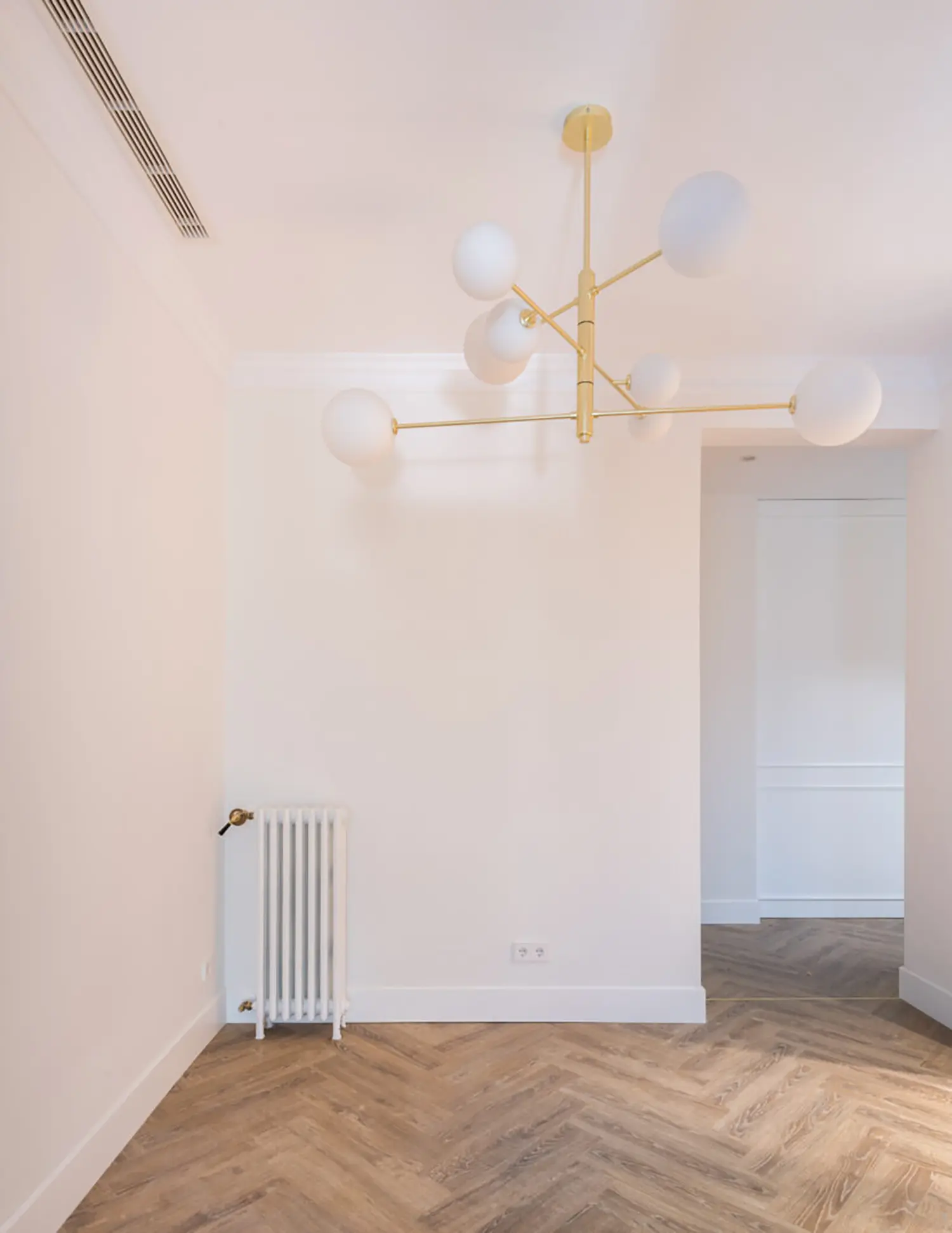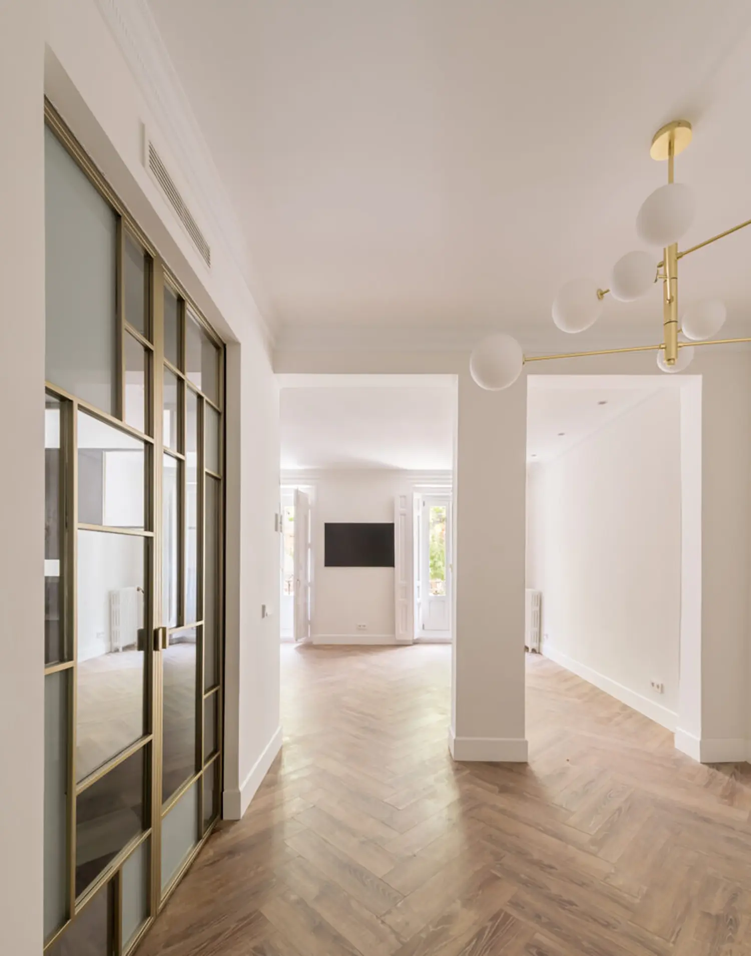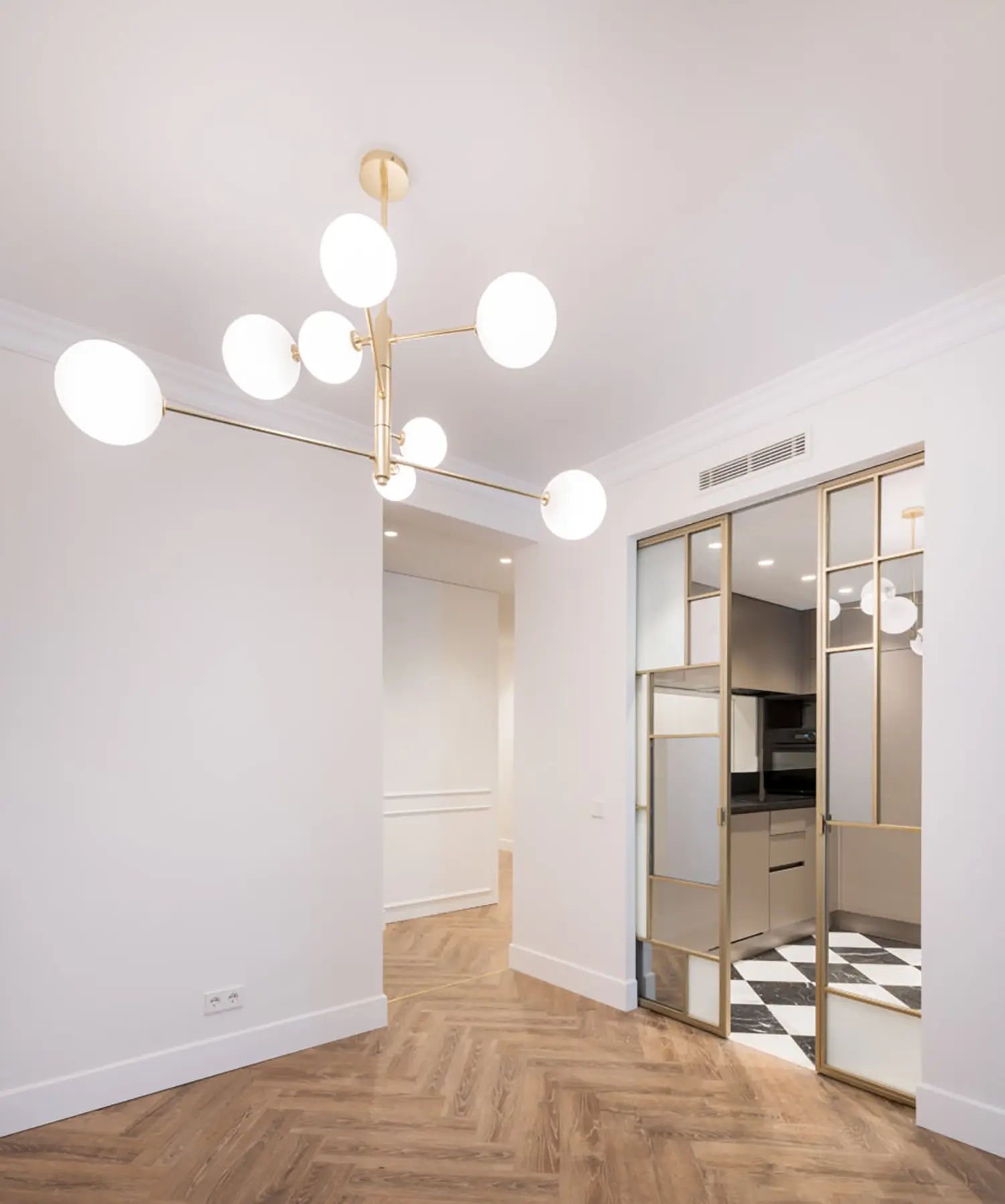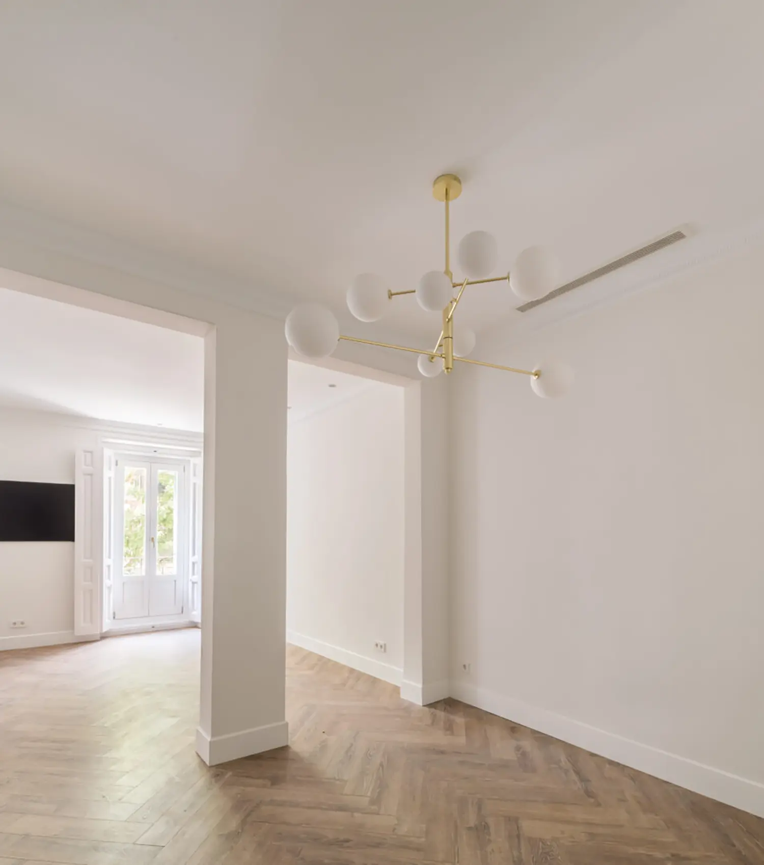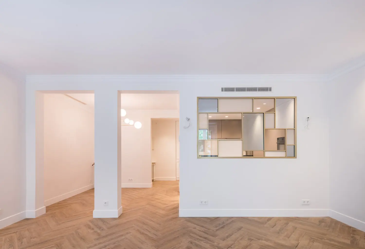 Ubicada en el centro de Madrid en un edificio clásico, esta vivienda combina el encanto de la arquitectura clásica con elementos modernos. Los techos altos y las molduras ornamentadas en paredes y techos aportan una sensación de amplitud y elegancia. El suelo de espiga en madera complementa el diseño y hace un guiño a la arquitectura clásica de la ciudad.