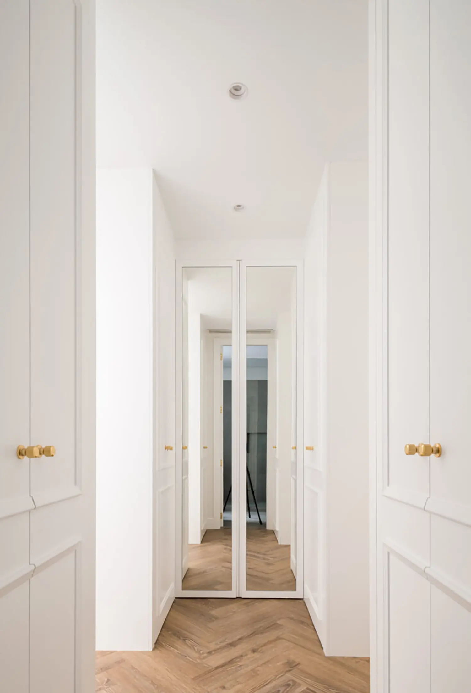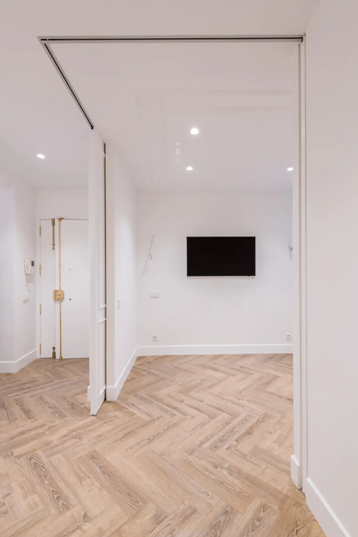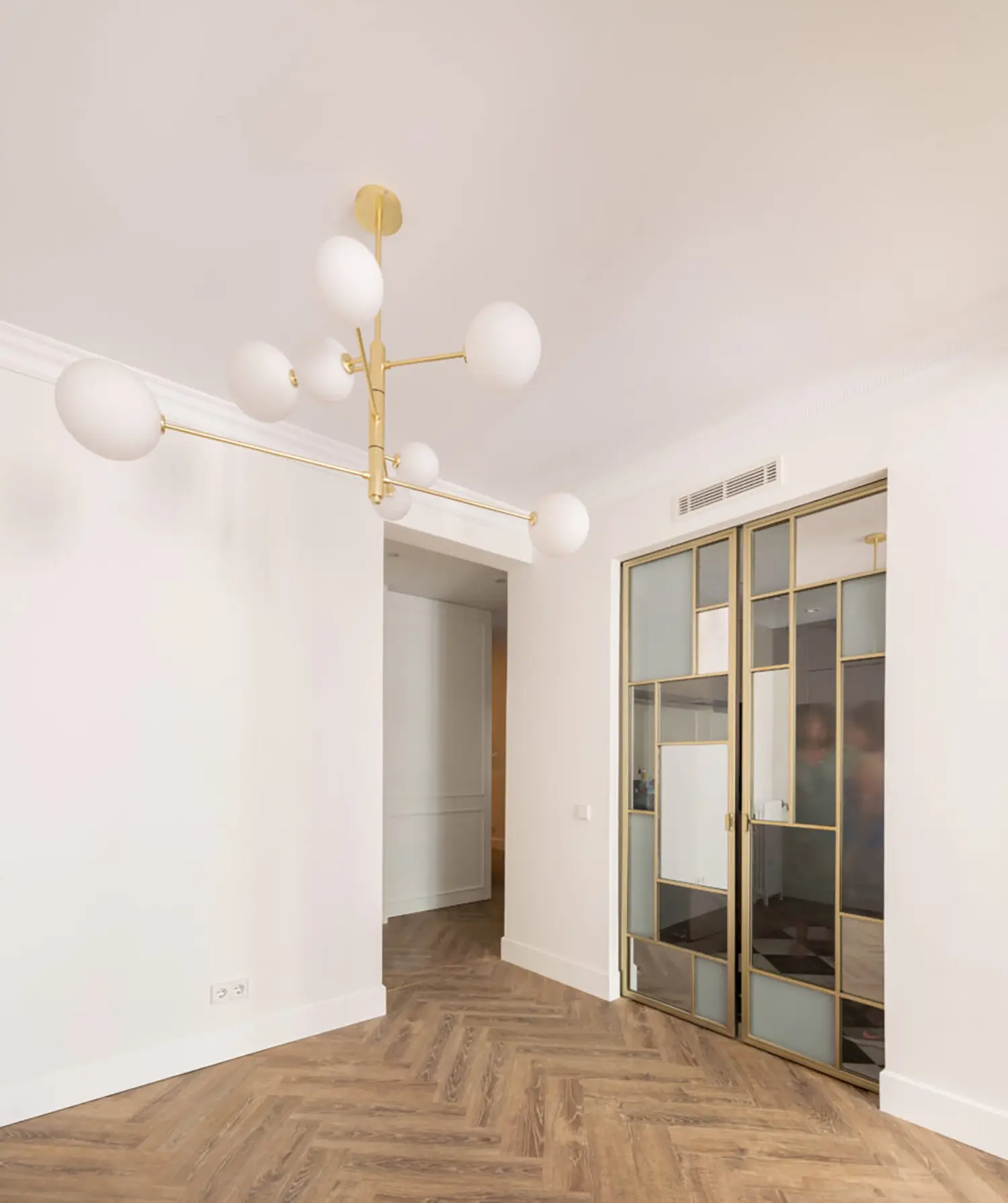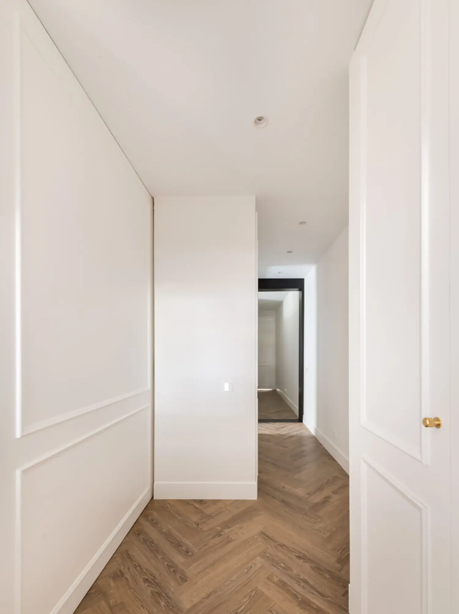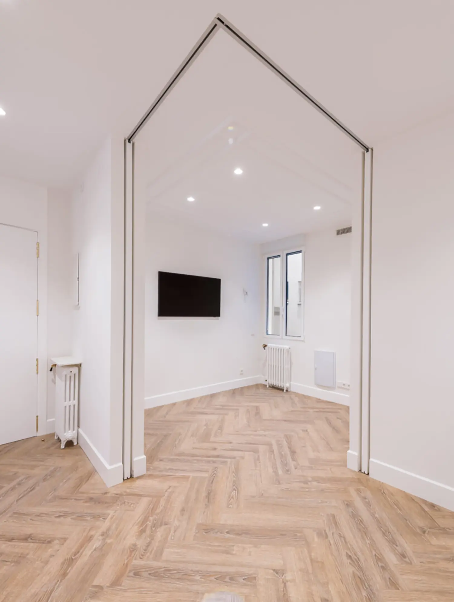 Ubicada en el centro de Madrid en un edificio clásico, esta vivienda combina el encanto de la arquitectura clásica con elementos modernos. Los techos altos y las molduras ornamentadas en paredes y techos aportan una sensación de amplitud y elegancia. El suelo de espiga en madera complementa el diseño y hace un guiño a la arquitectura clásica de la ciudad.