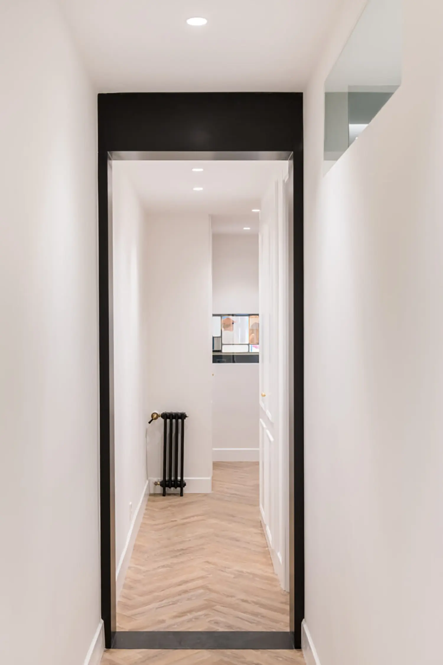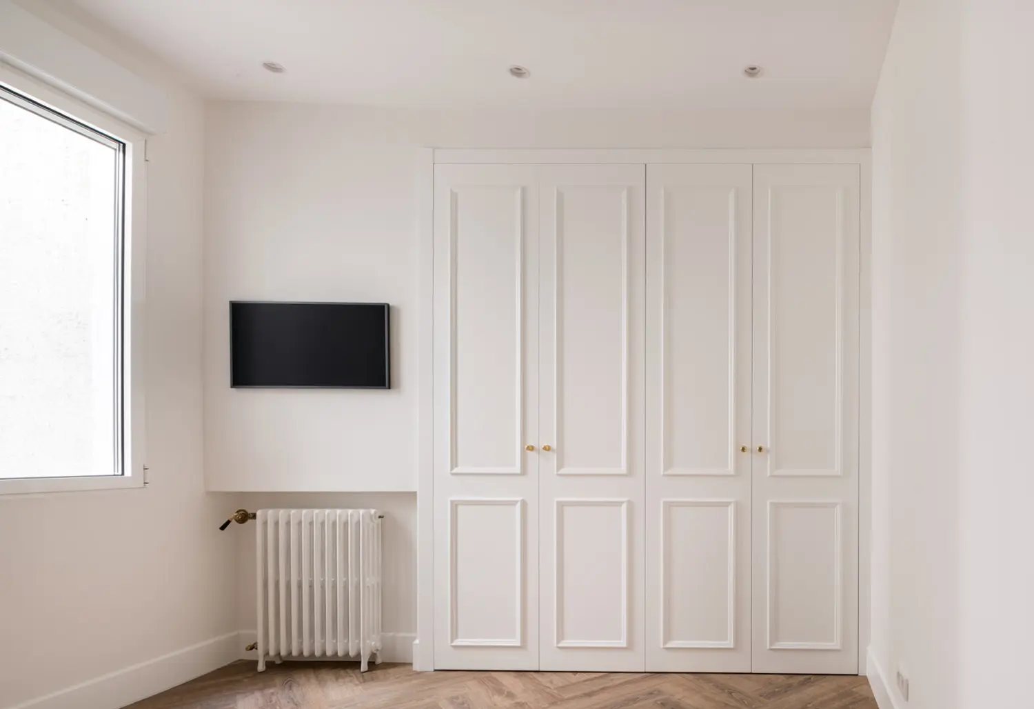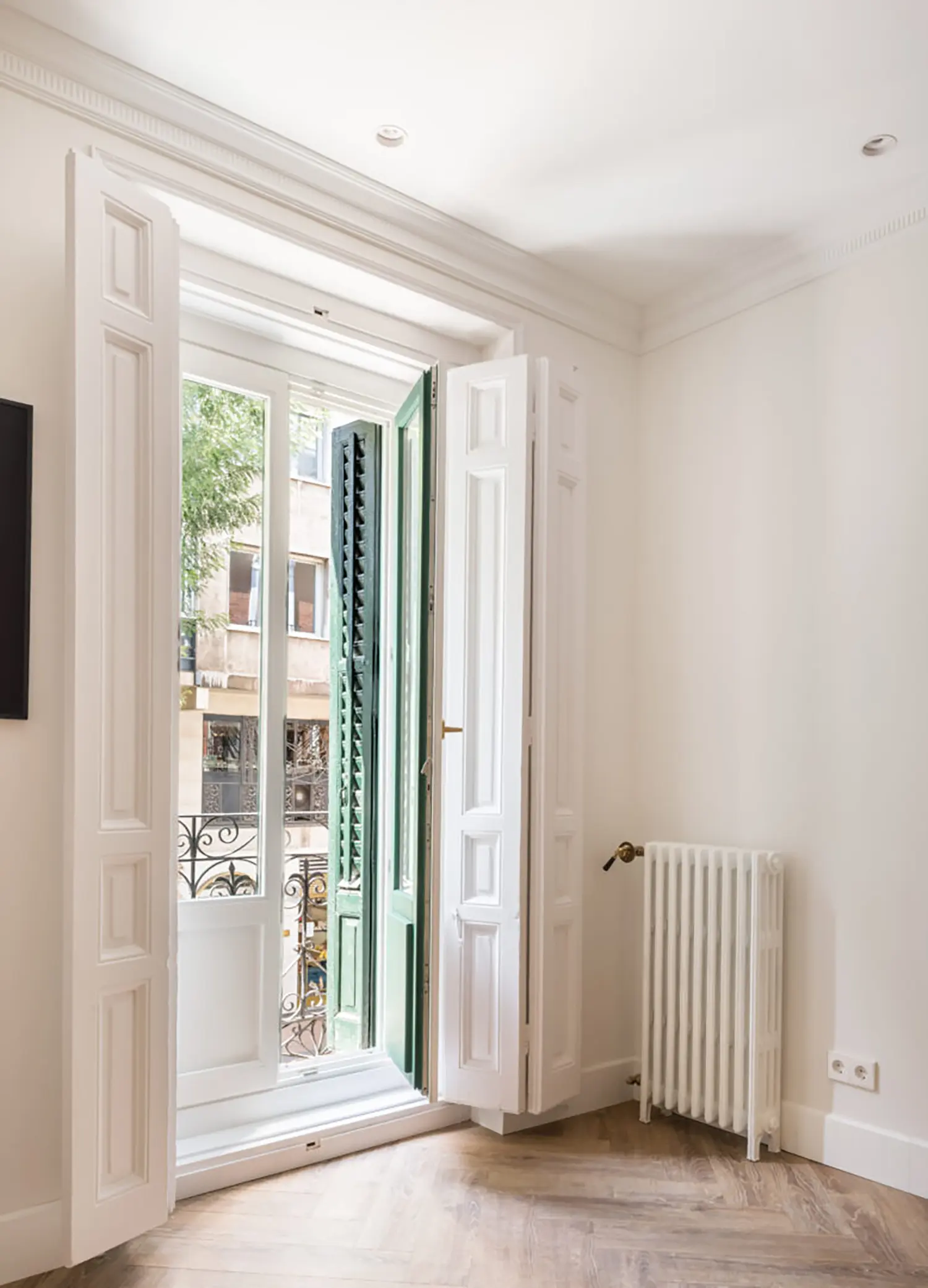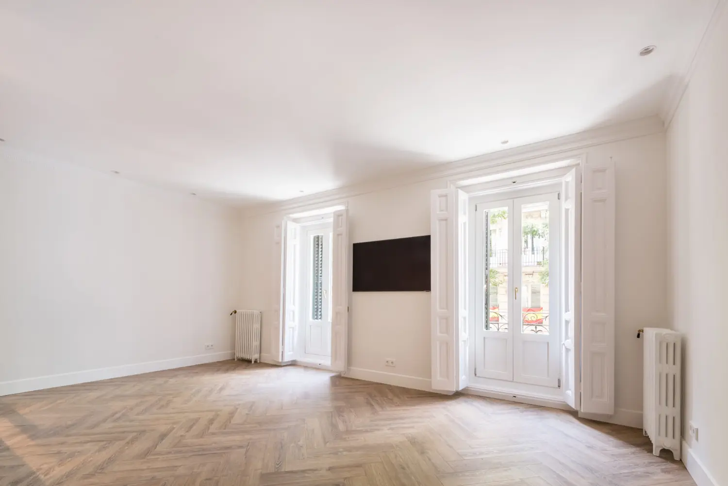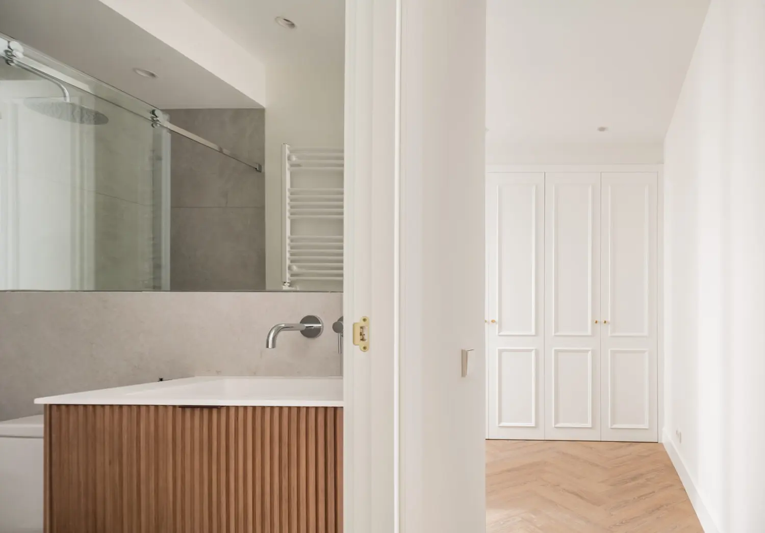 Ubicada en el centro de Madrid en un edificio clásico, esta vivienda combina el encanto de la arquitectura clásica con elementos modernos. Los techos altos y las molduras ornamentadas en paredes y techos aportan una sensación de amplitud y elegancia. El suelo de espiga en madera complementa el diseño y hace un guiño a la arquitectura clásica de la ciudad.