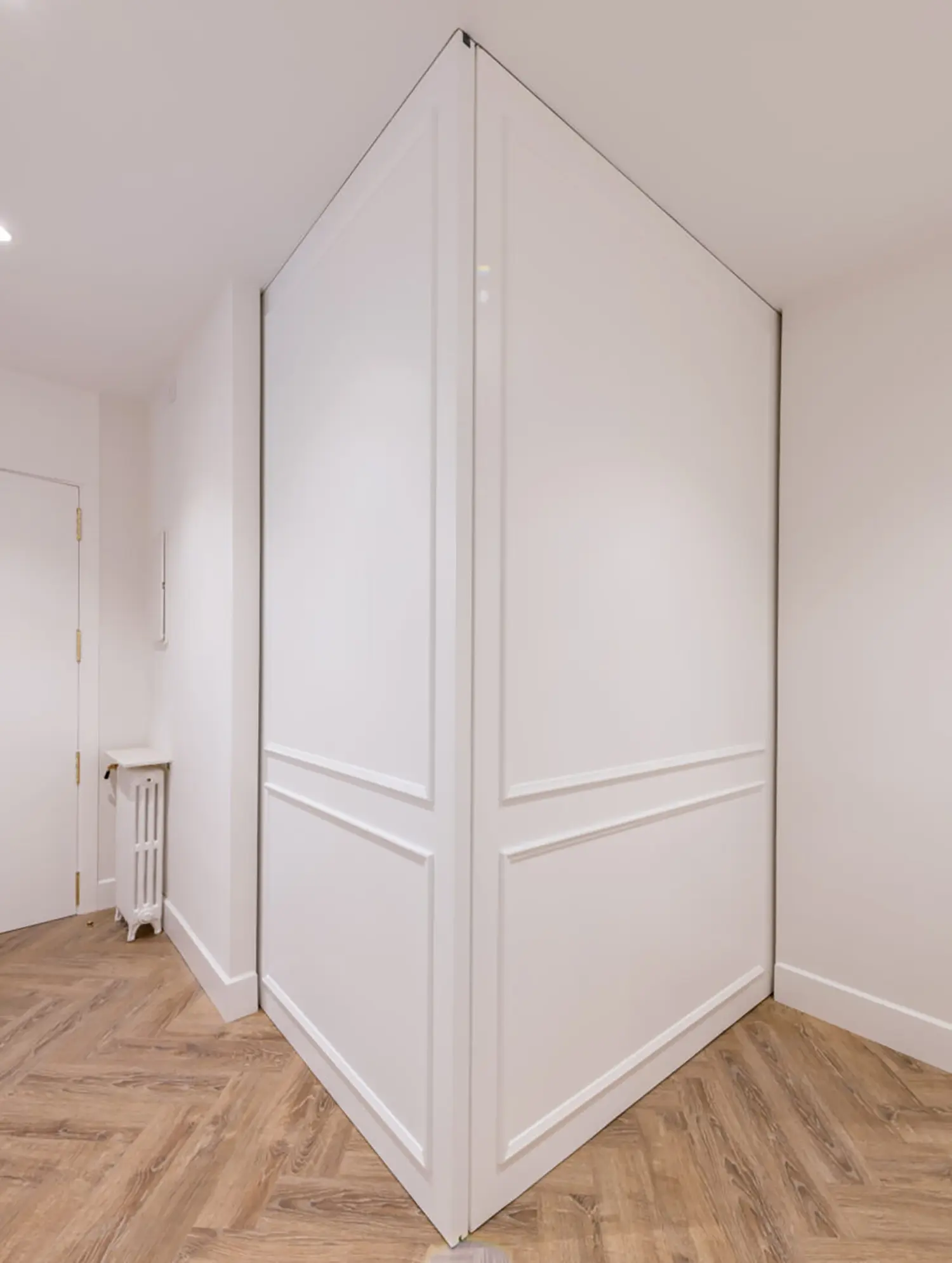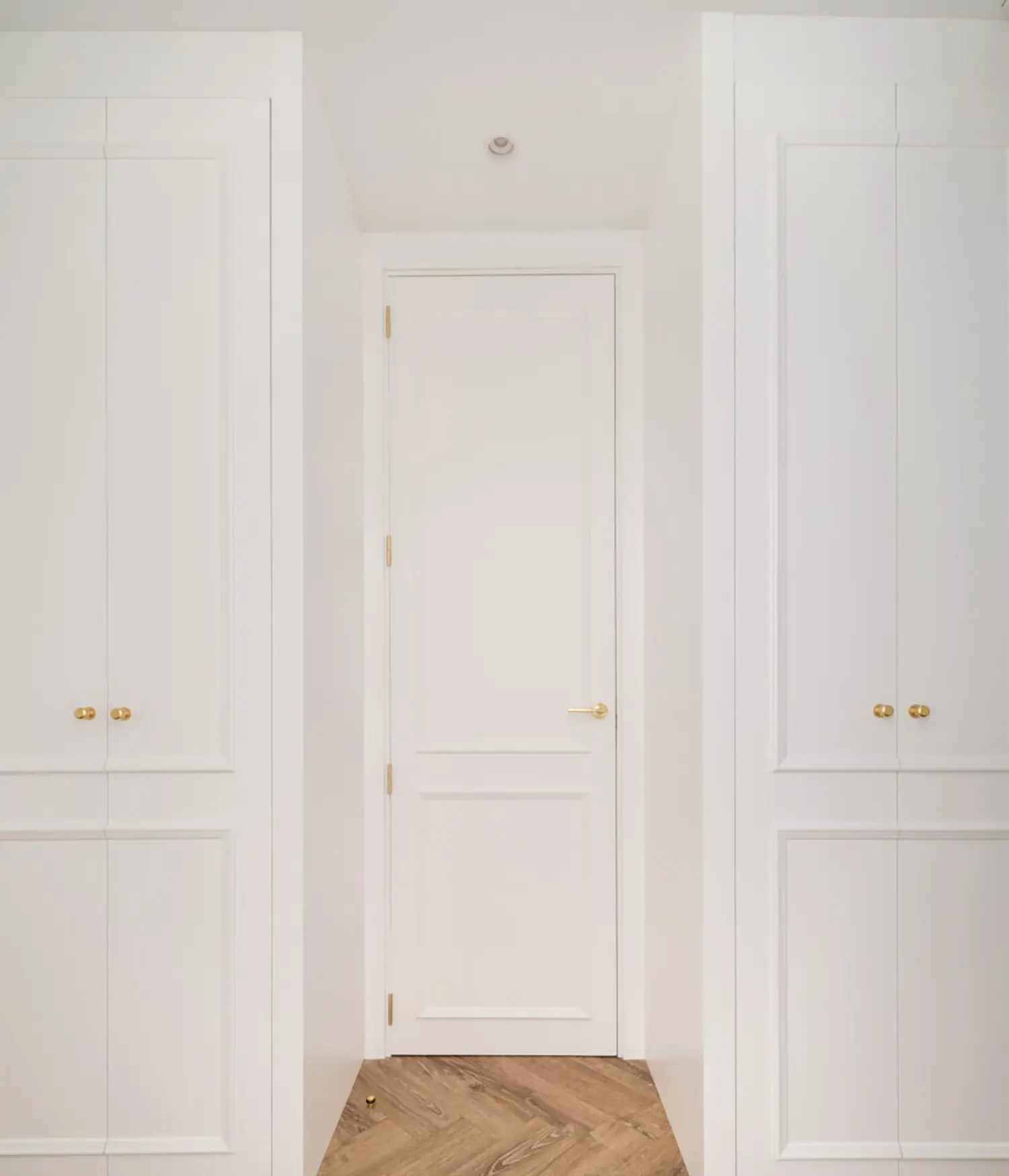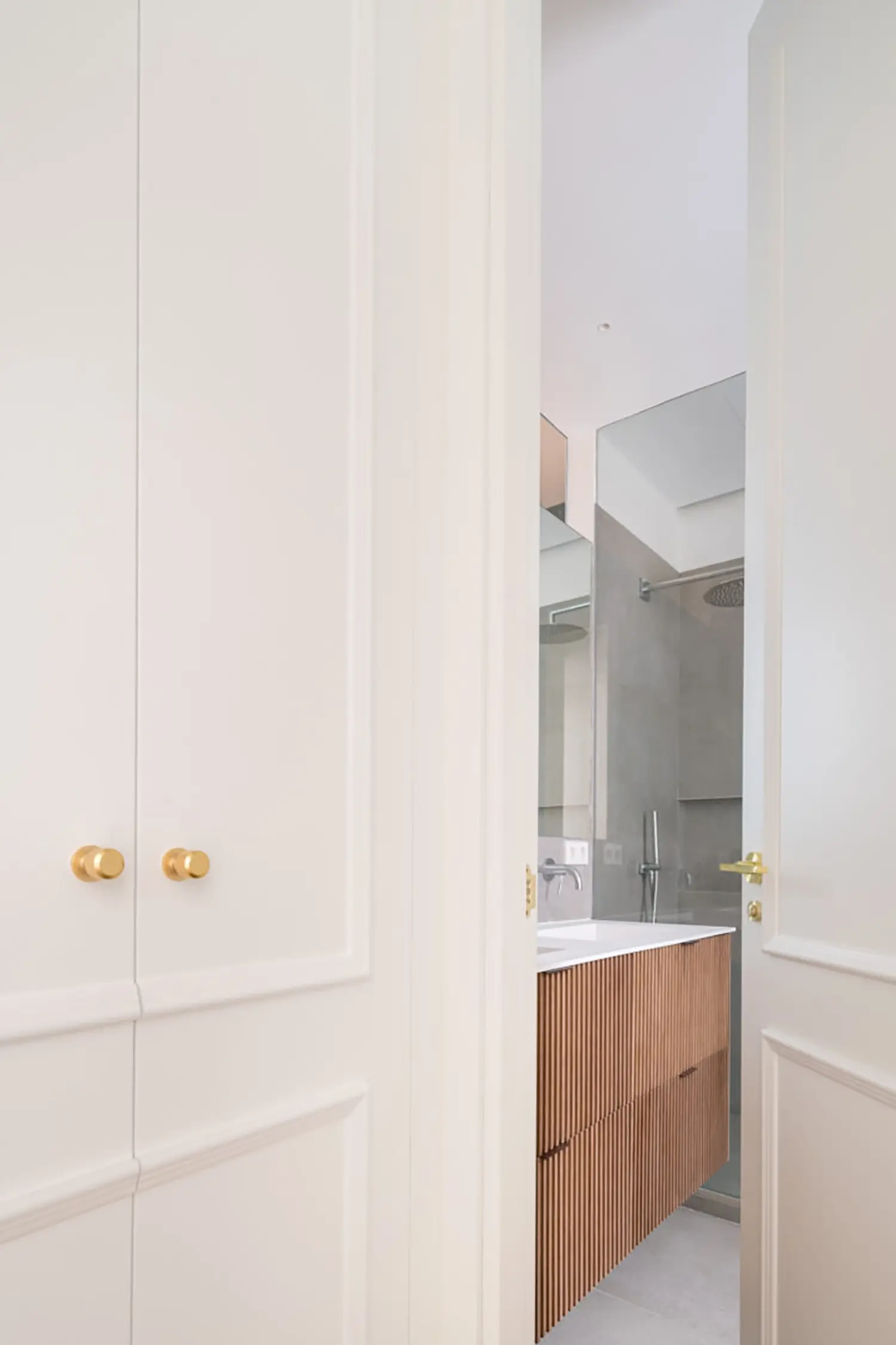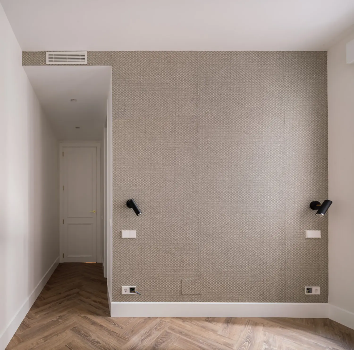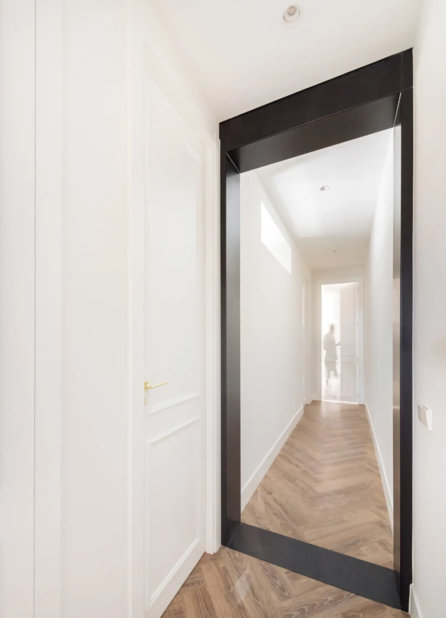Ubicada en el centro de Madrid en un edificio clásico, esta vivienda combina el encanto de la arquitectura clásica con elementos modernos. Los techos altos y las molduras ornamentadas en paredes y techos aportan una sensación de amplitud y elegancia. El suelo de espiga en madera complementa el diseño y hace un guiño a la arquitectura clásica de la ciudad.