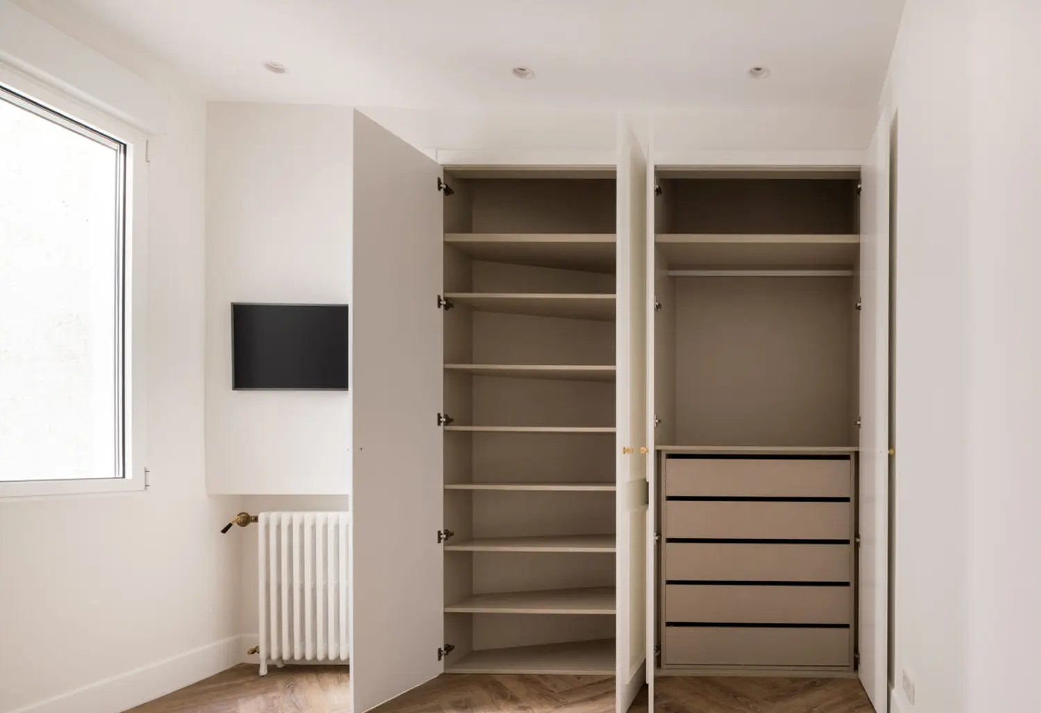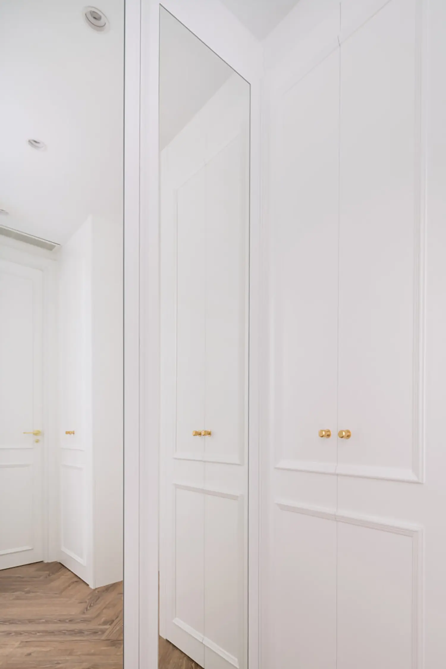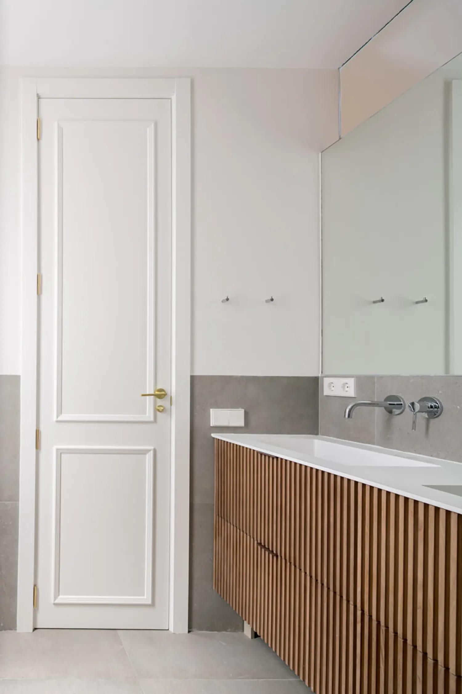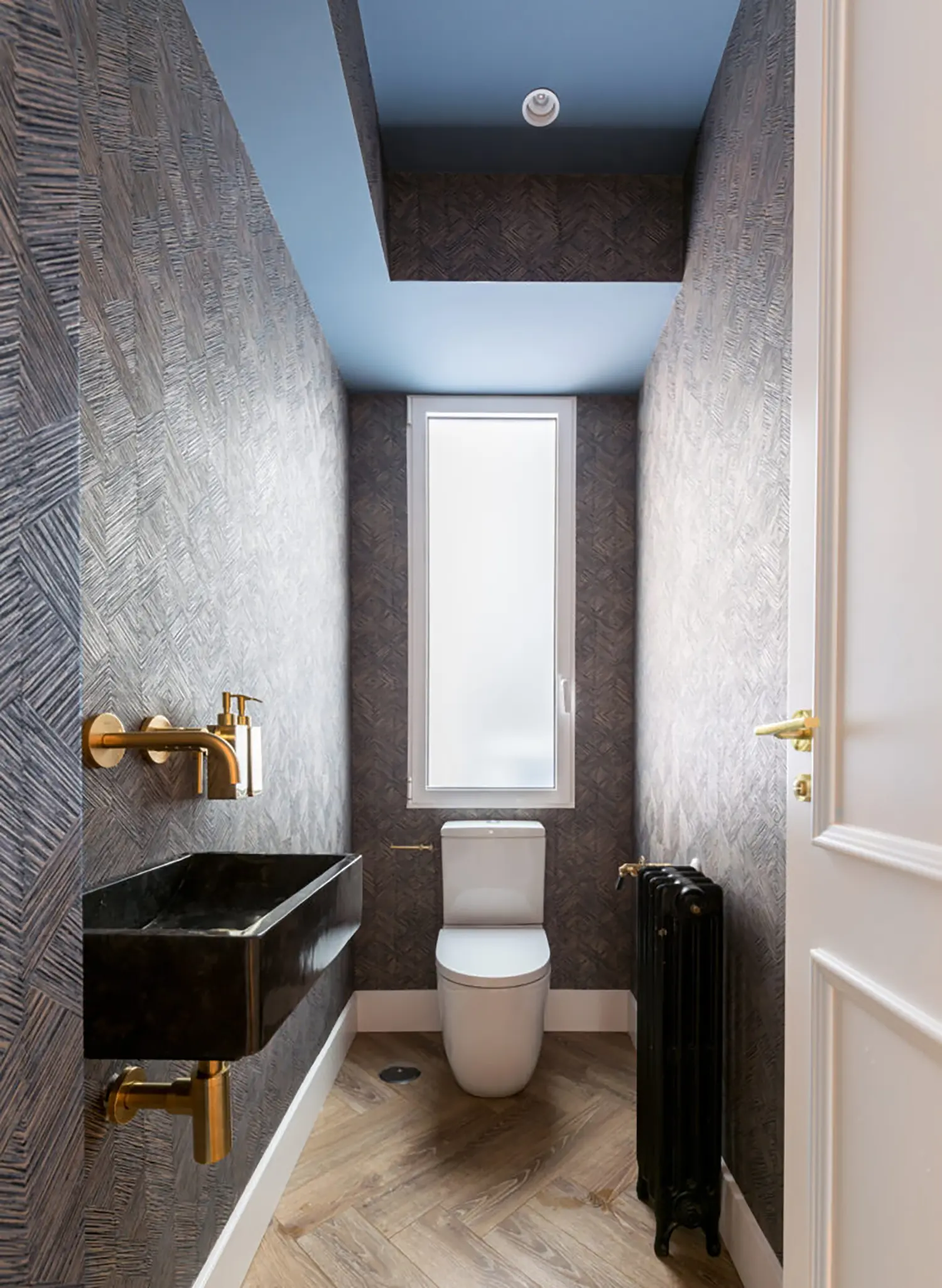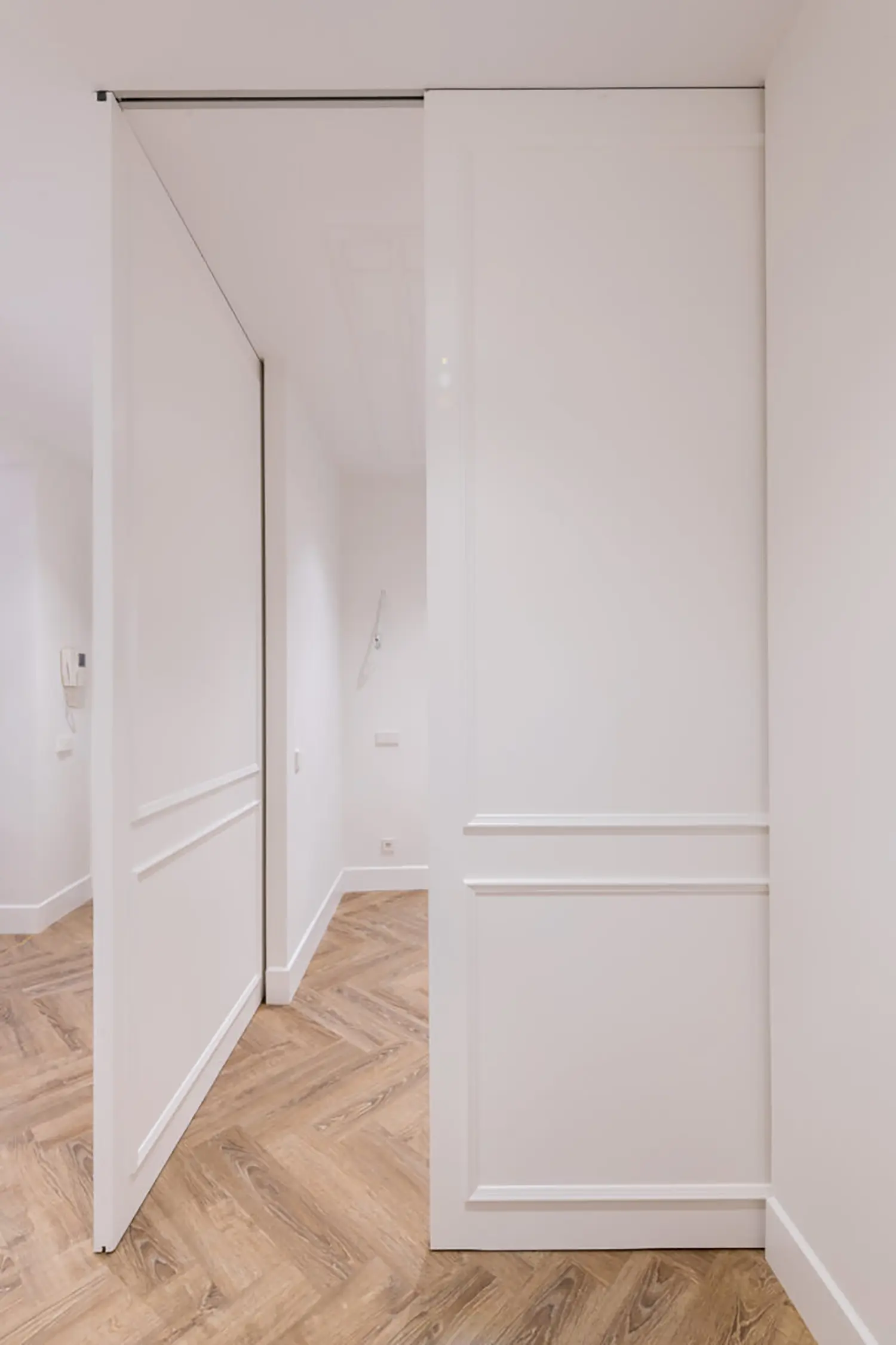 Ubicada en el centro de Madrid en un edificio clásico, esta vivienda combina el encanto de la arquitectura clásica con elementos modernos. Los techos altos y las molduras ornamentadas en paredes y techos aportan una sensación de amplitud y elegancia. El suelo de espiga en madera complementa el diseño y hace un guiño a la arquitectura clásica de la ciudad.