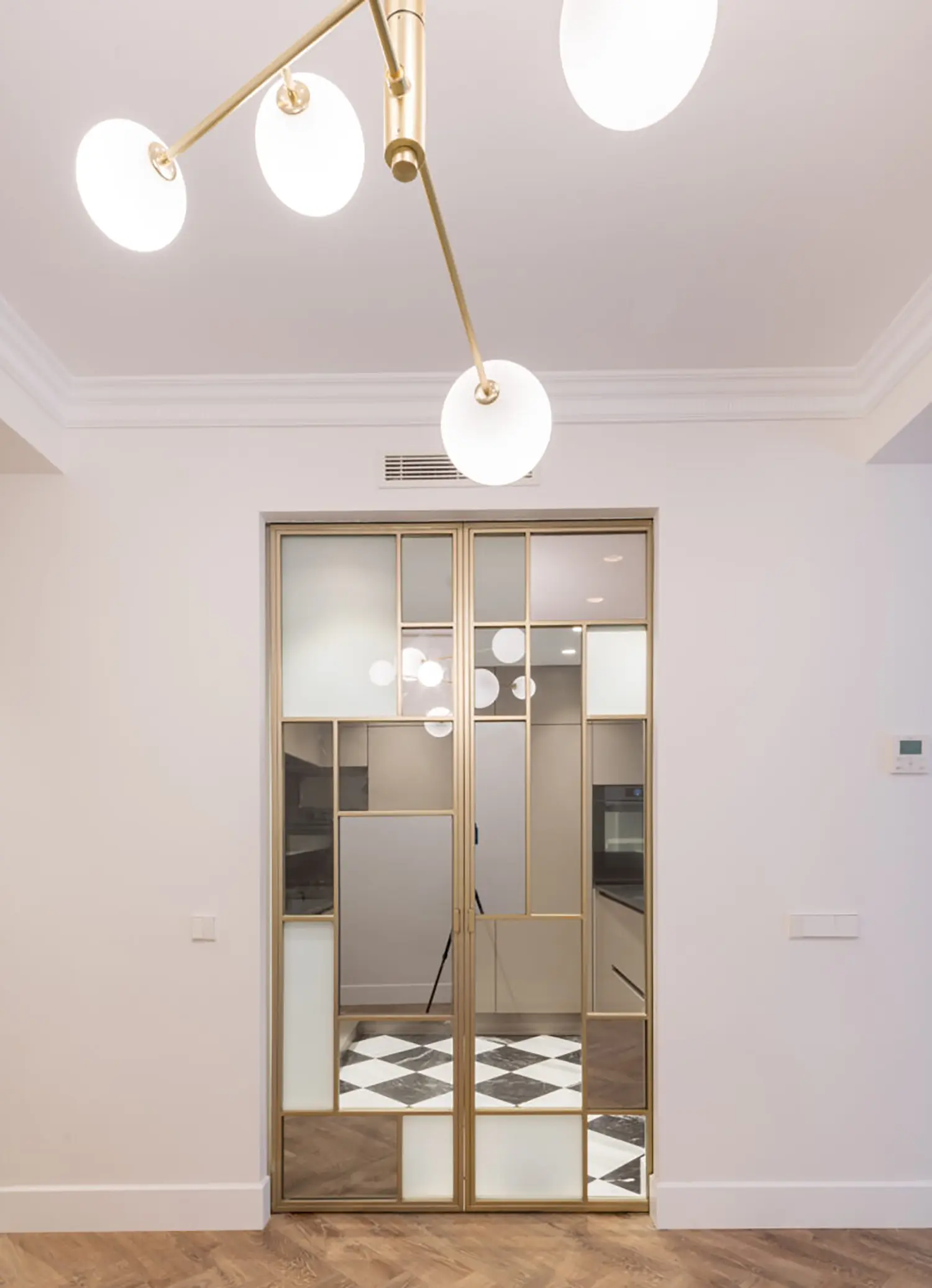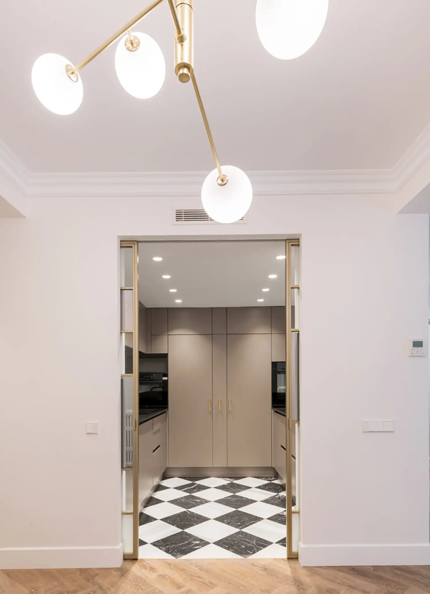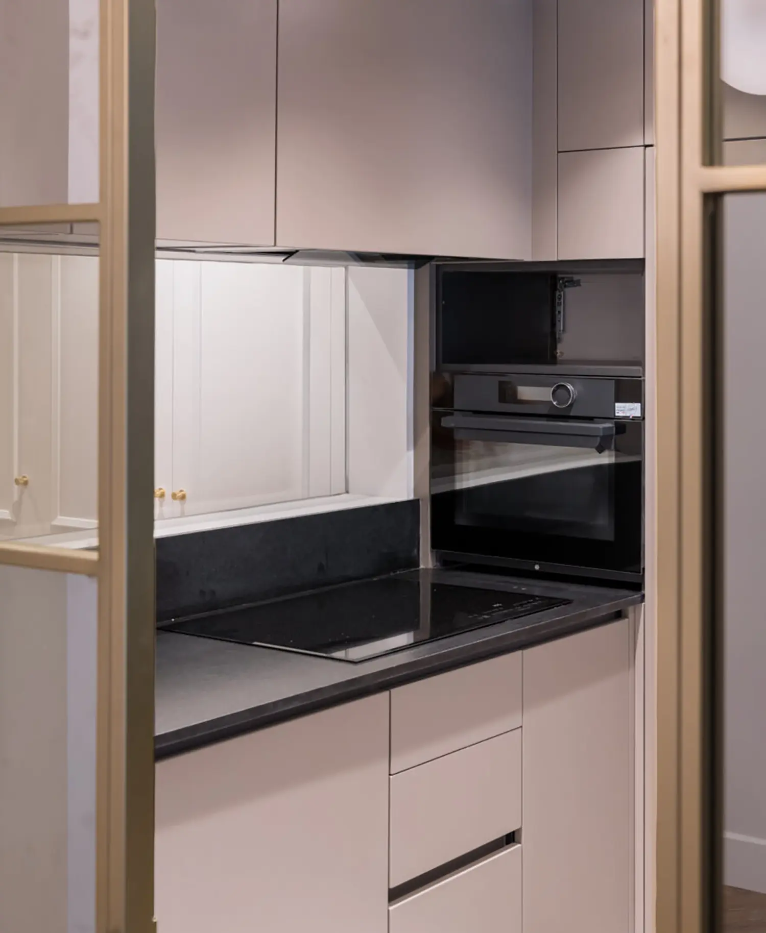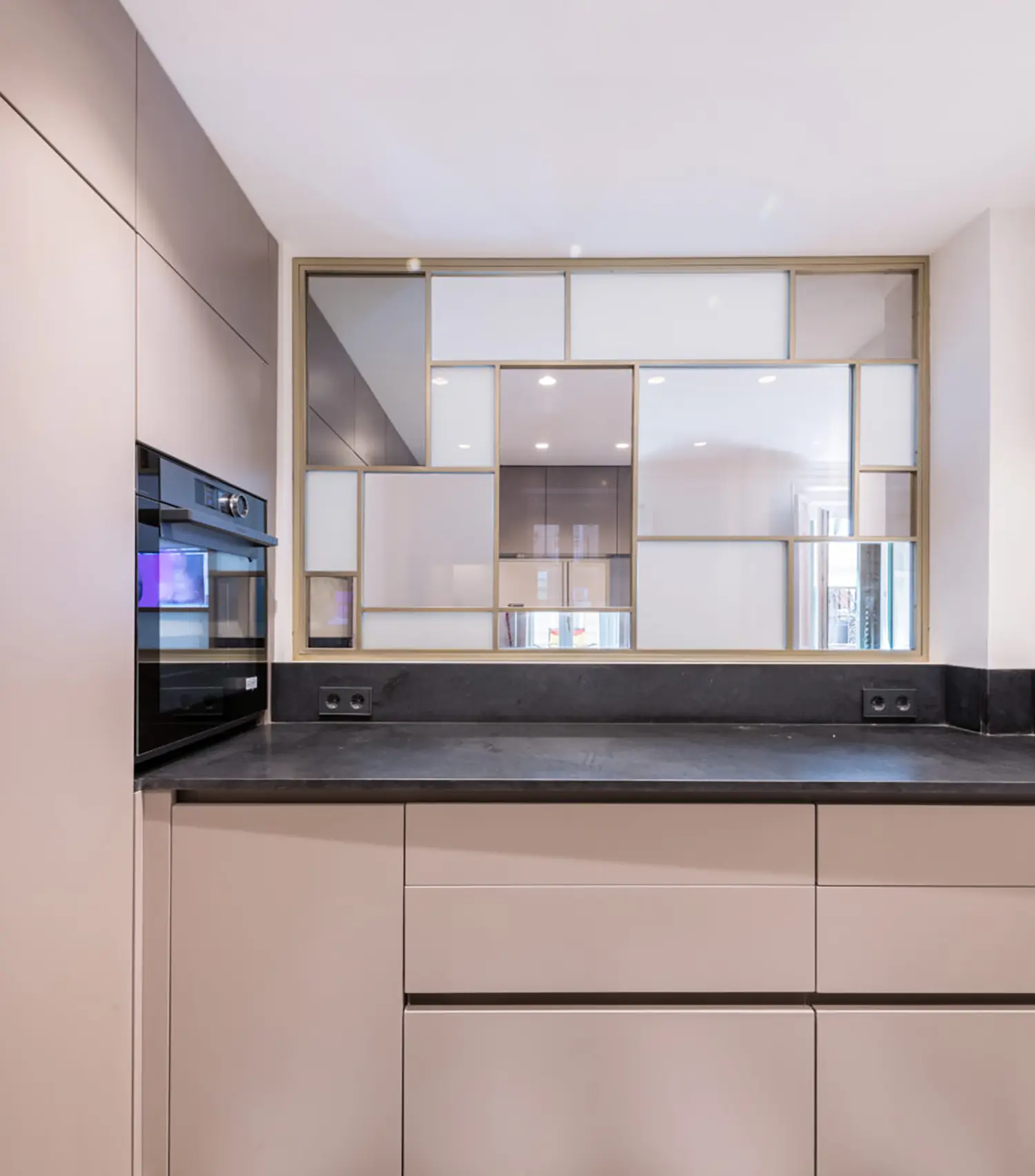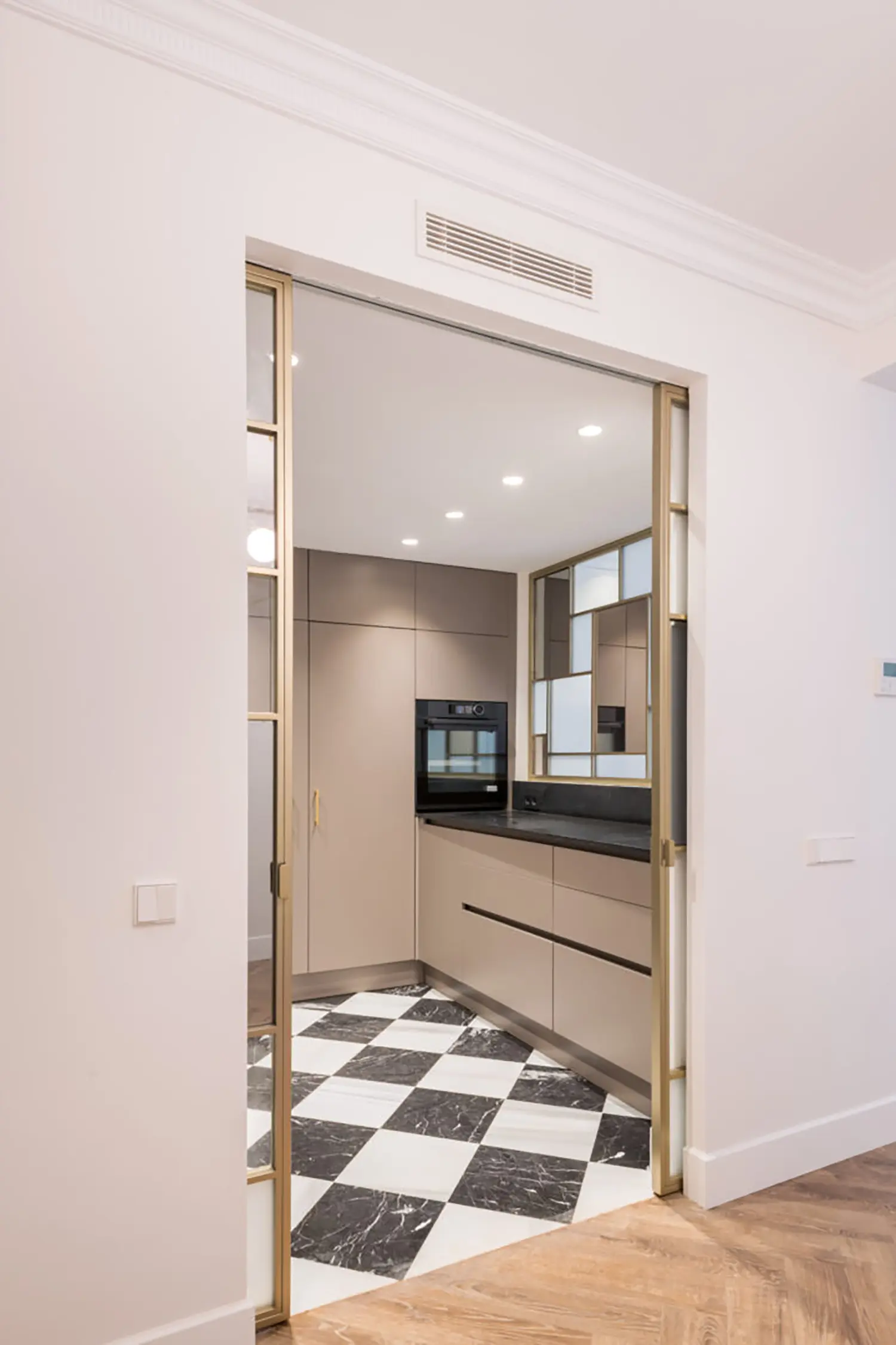 La cocina, aunque pequeña, está cuidadosamente diseñada para maximizar su funcionalidad sin sacrificar el estilo. Su cerramiento de vidrio y latón se convierte en un elemento decorativo en el salón. Se mantienen las ventanas originales con molduras que armonizan con el resto de la vivienda y permiten la entrada de luz natural, haciendo que el espacio sea luminoso y que gane amplitud.