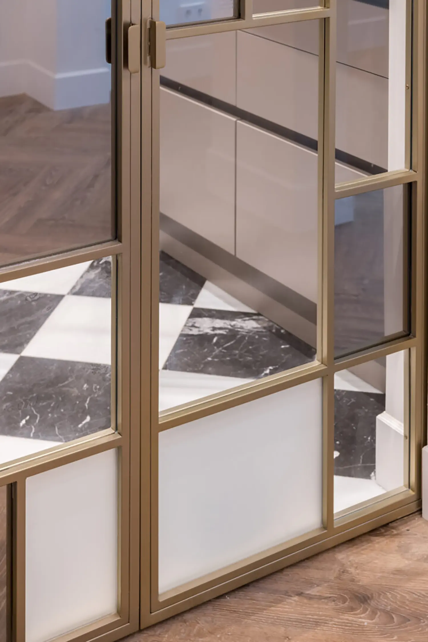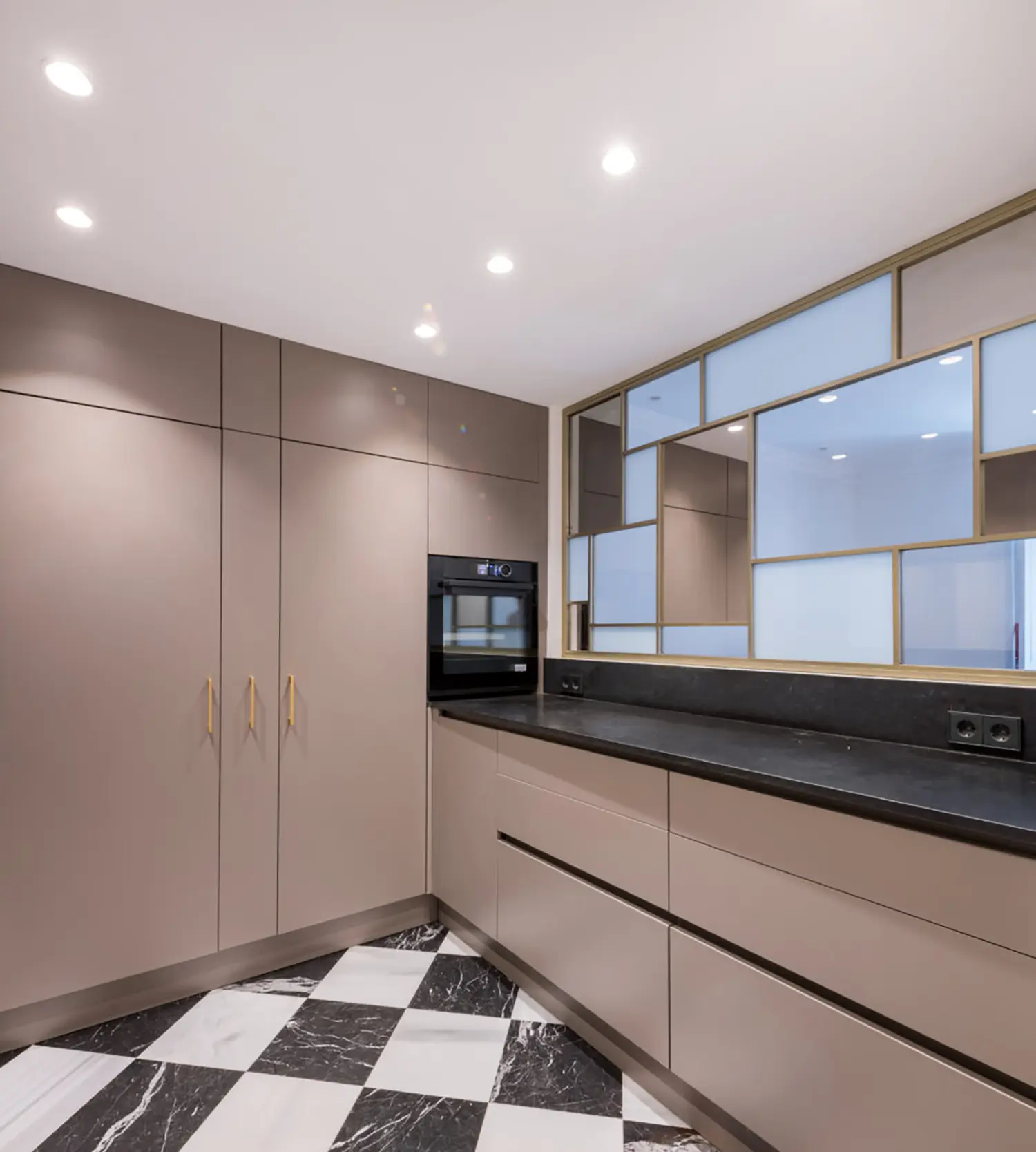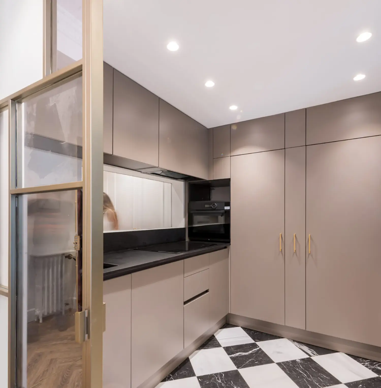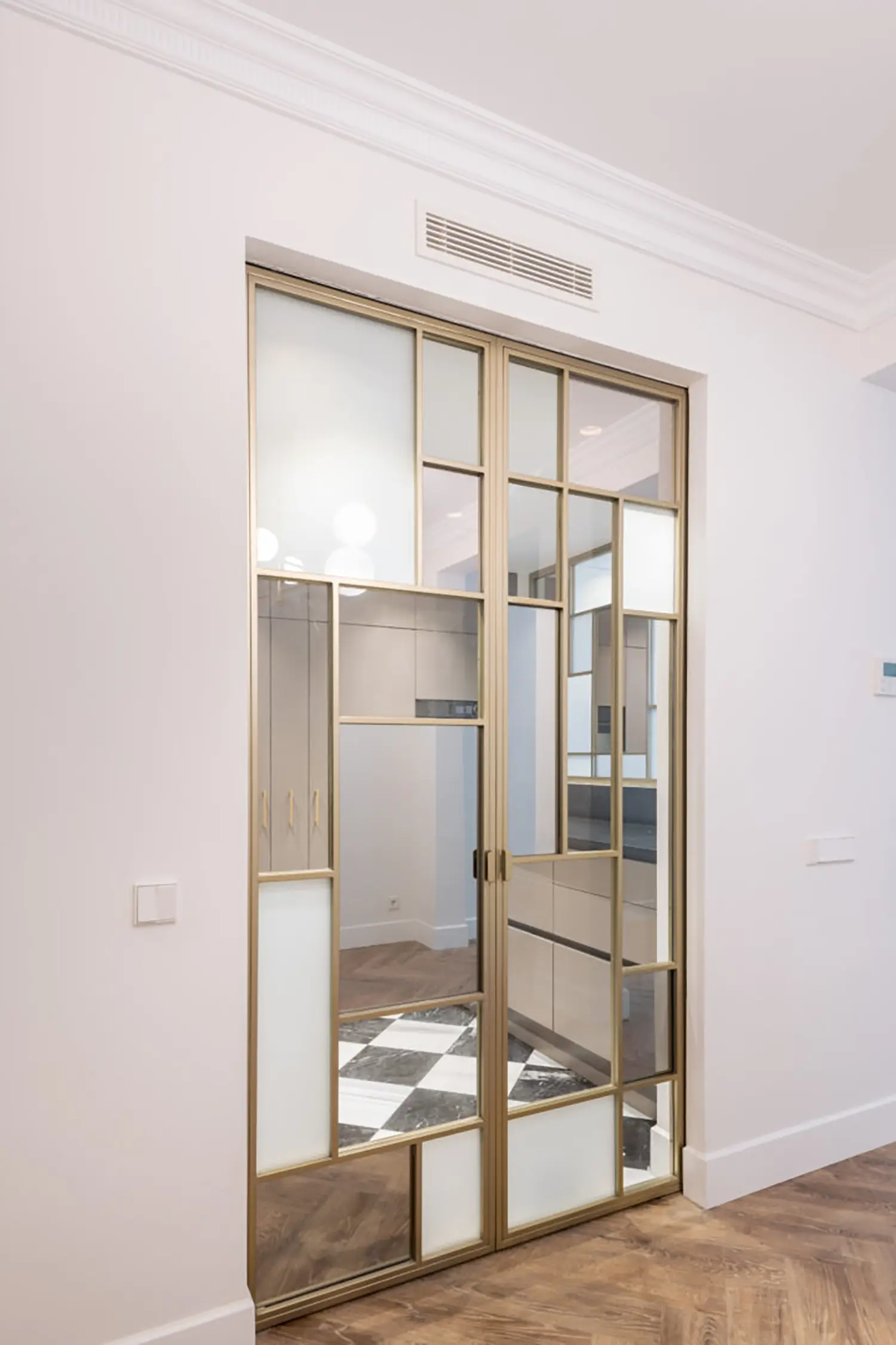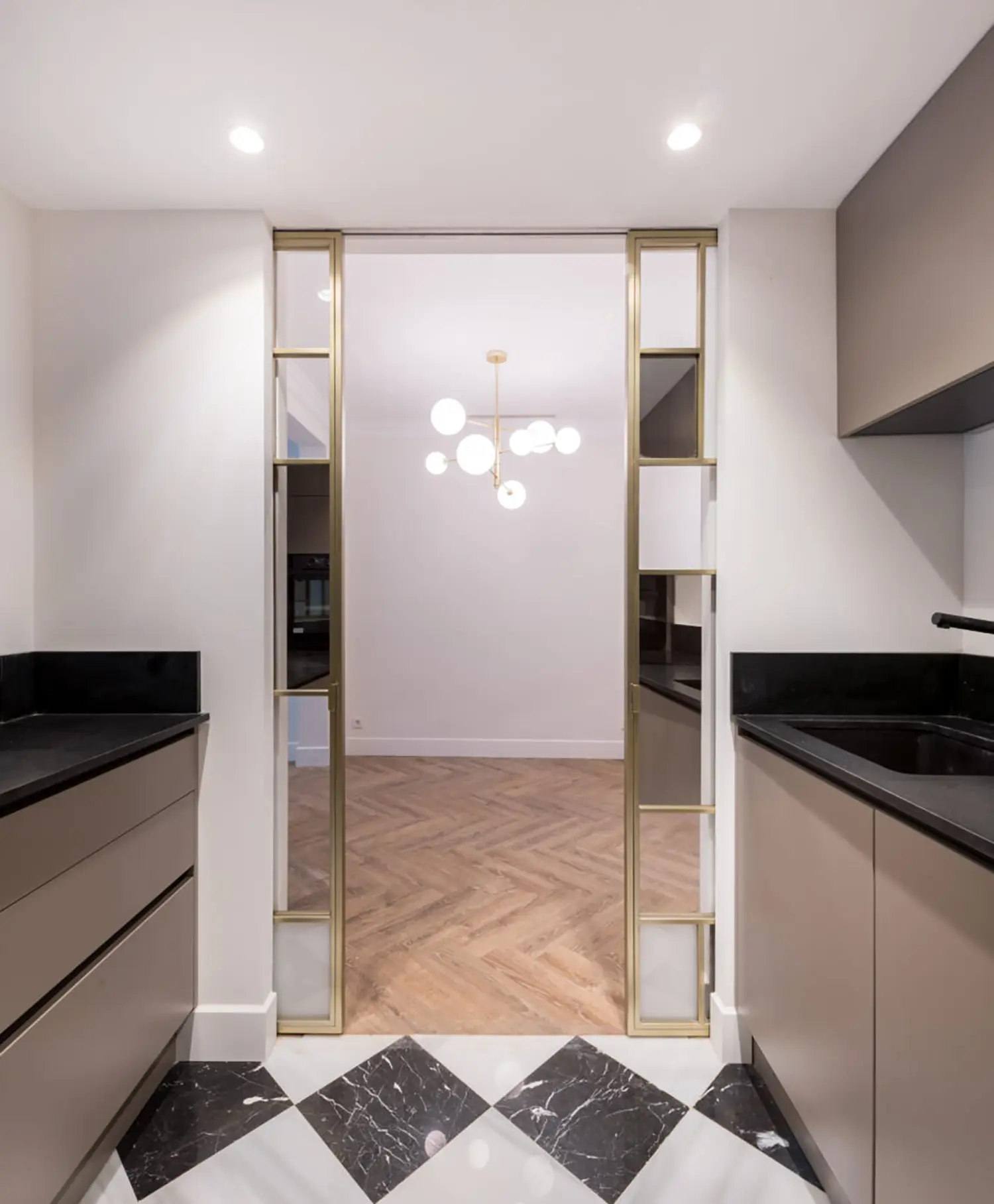 La cocina, aunque pequeña, está cuidadosamente diseñada para maximizar su funcionalidad sin sacrificar el estilo. Su cerramiento de vidrio y latón se convierte en un elemento decorativo en el salón. Se mantienen las ventanas originales con molduras que armonizan con el resto de la vivienda y permiten la entrada de luz natural, haciendo que el espacio sea luminoso y que gane amplitud.