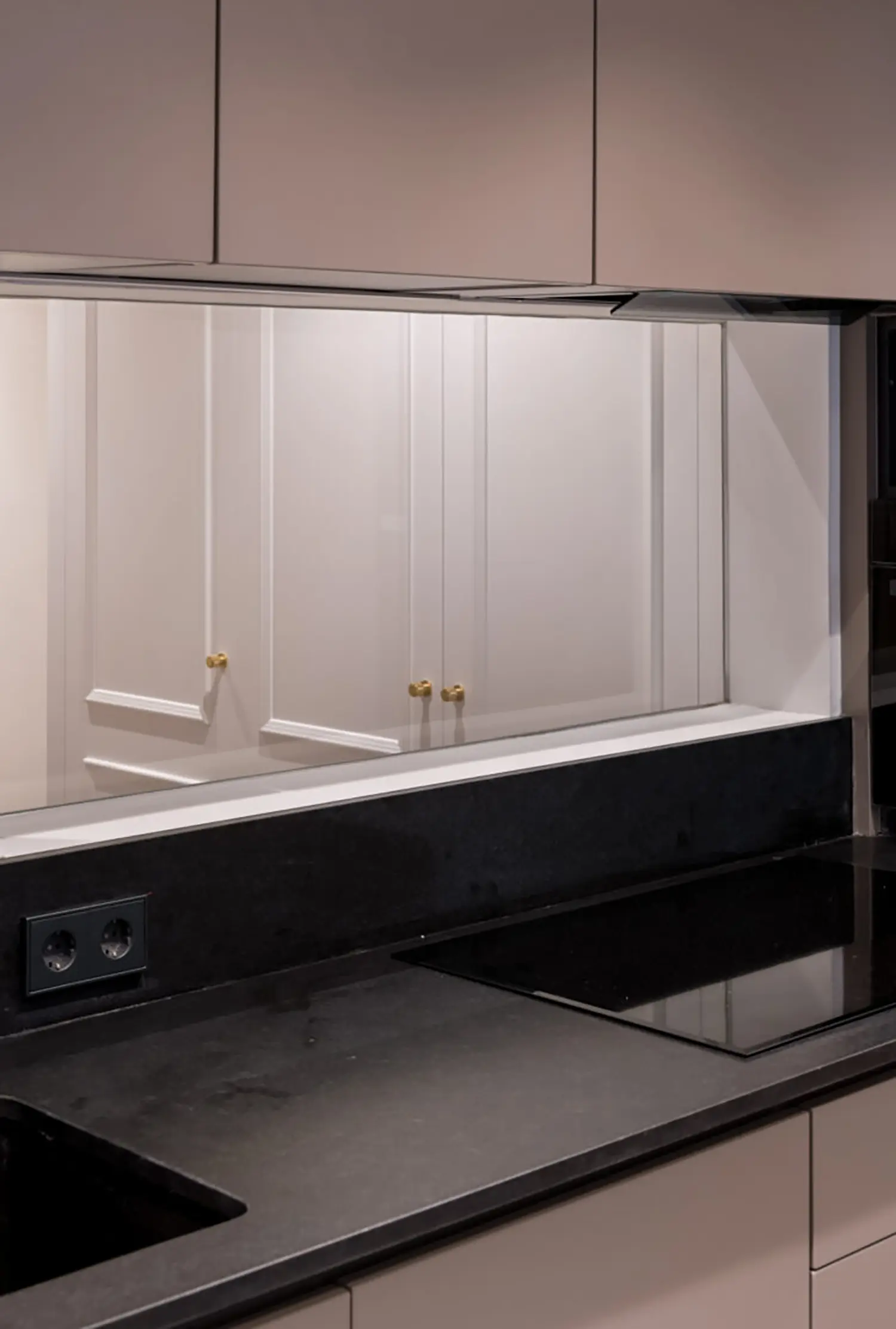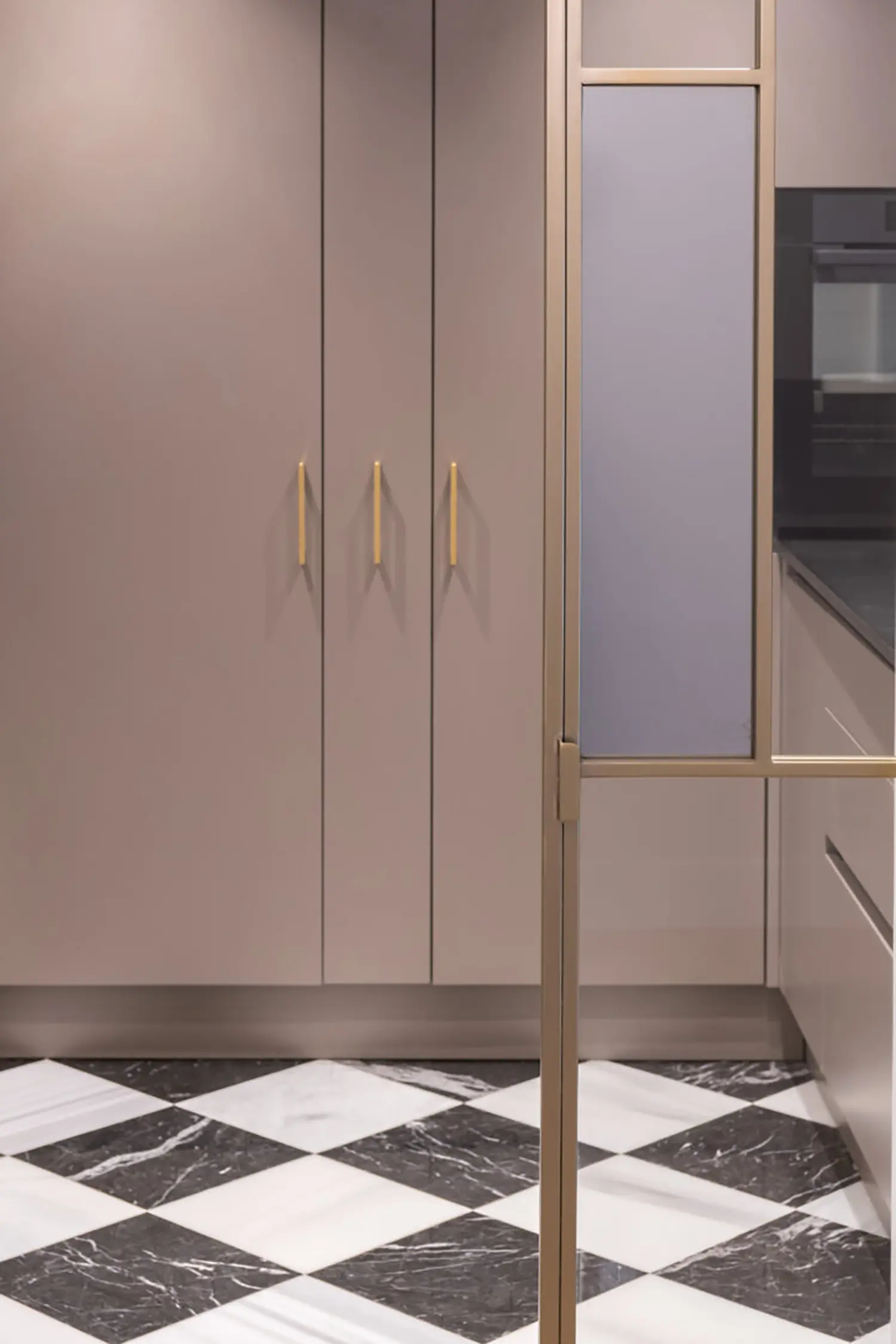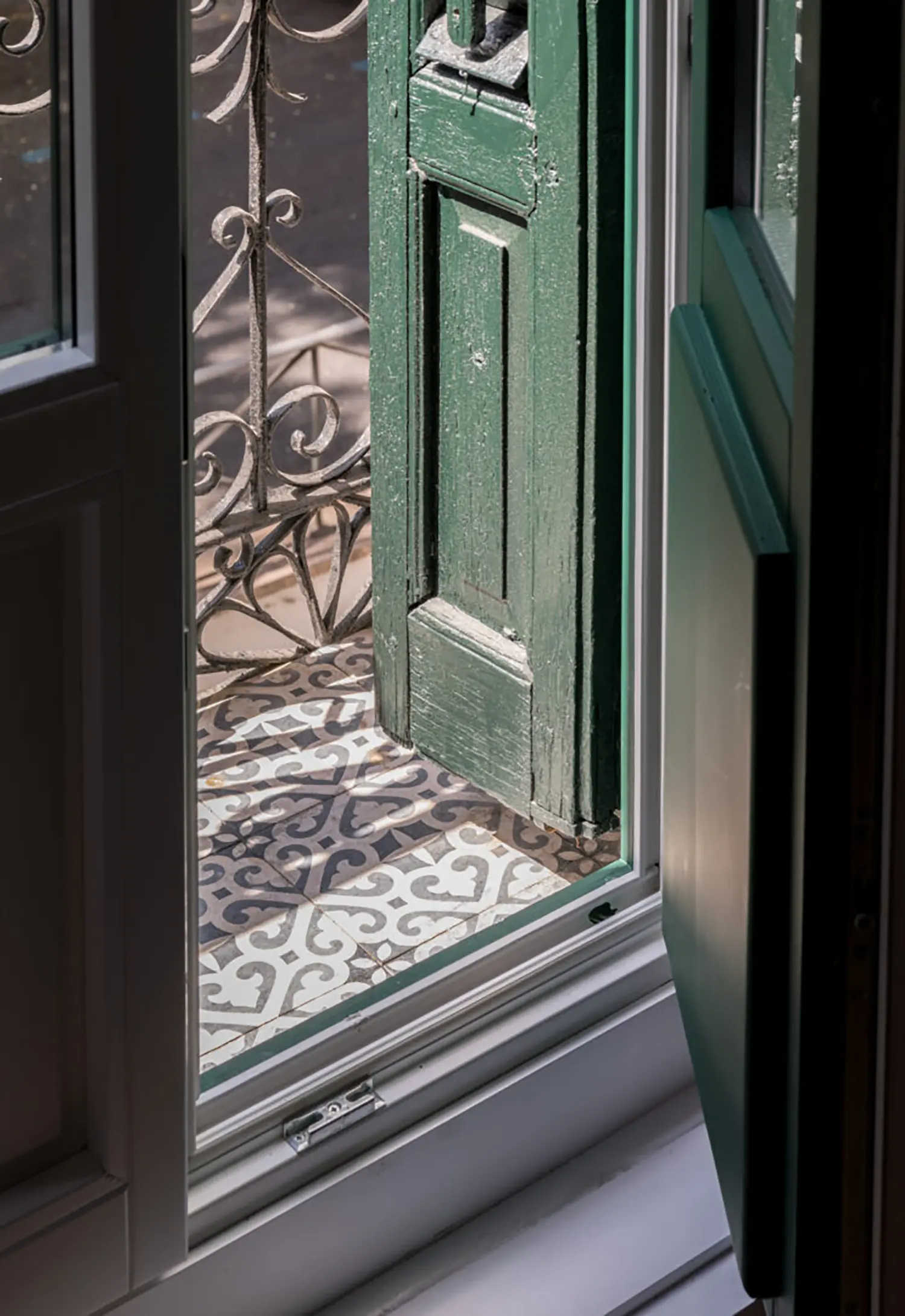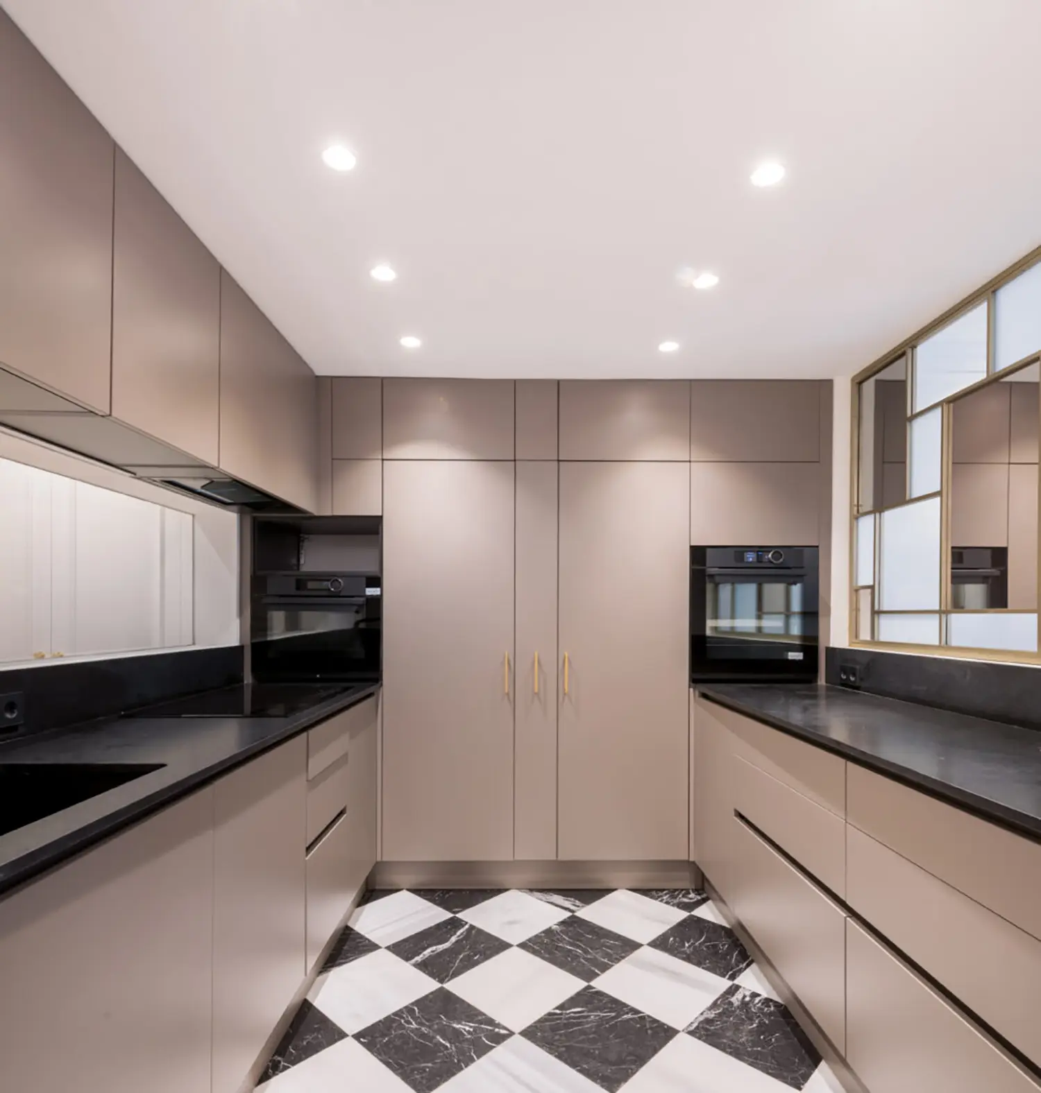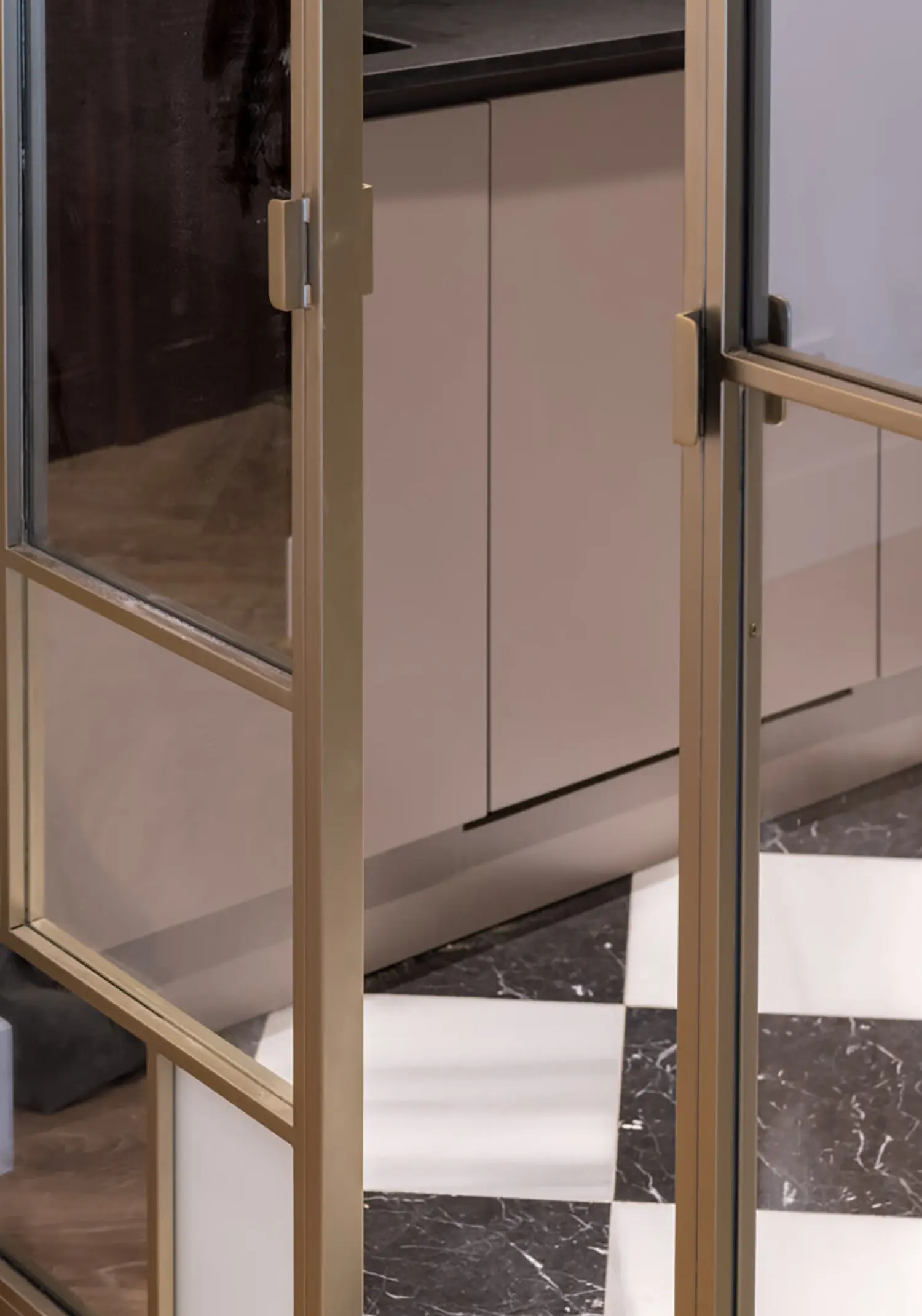 La cocina, aunque pequeña, está cuidadosamente diseñada para maximizar su funcionalidad sin sacrificar el estilo. Su cerramiento de vidrio y latón se convierte en un elemento decorativo en el salón. Se mantienen las ventanas originales con molduras que armonizan con el resto de la vivienda y permiten la entrada de luz natural, haciendo que el espacio sea luminoso y que gane amplitud.