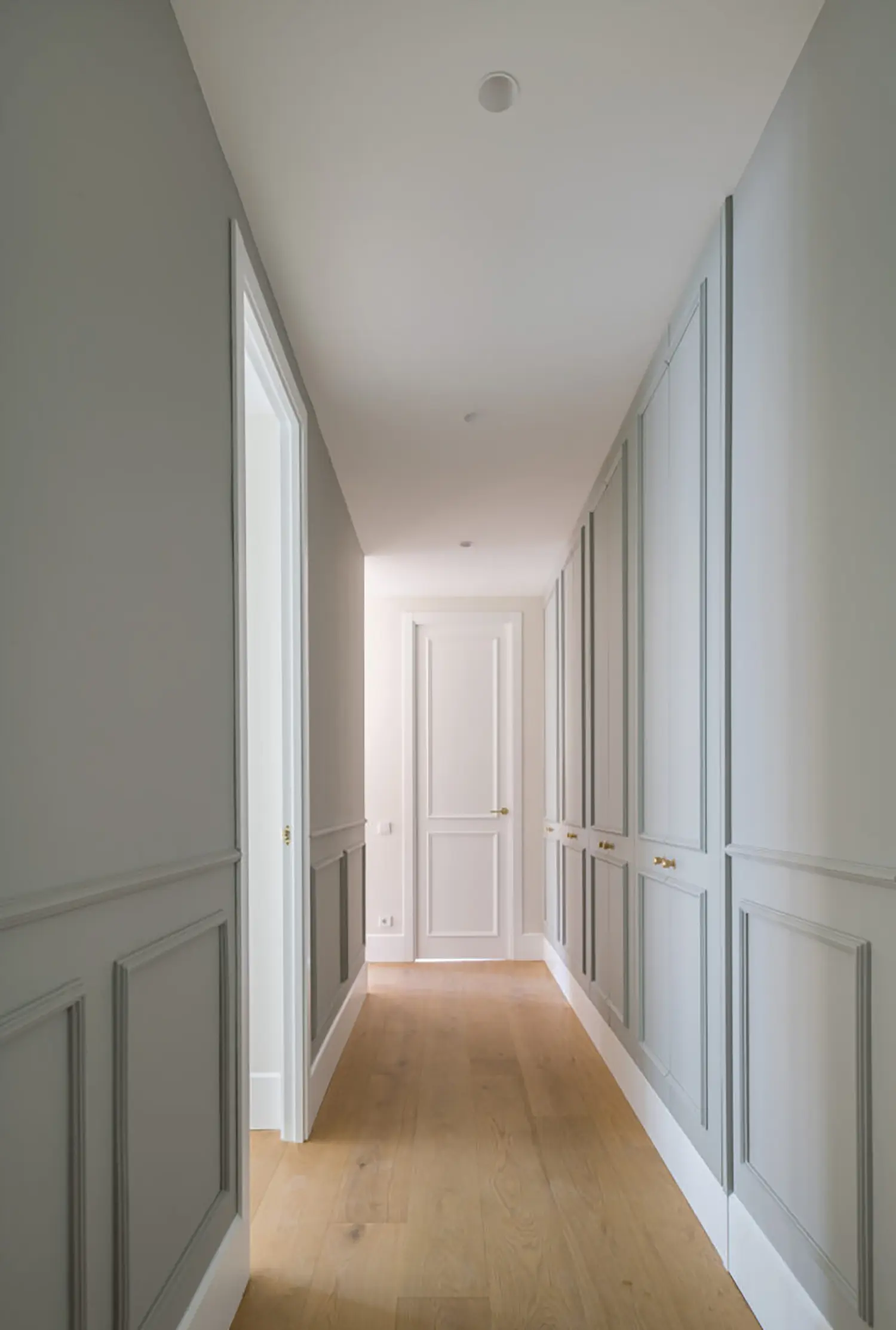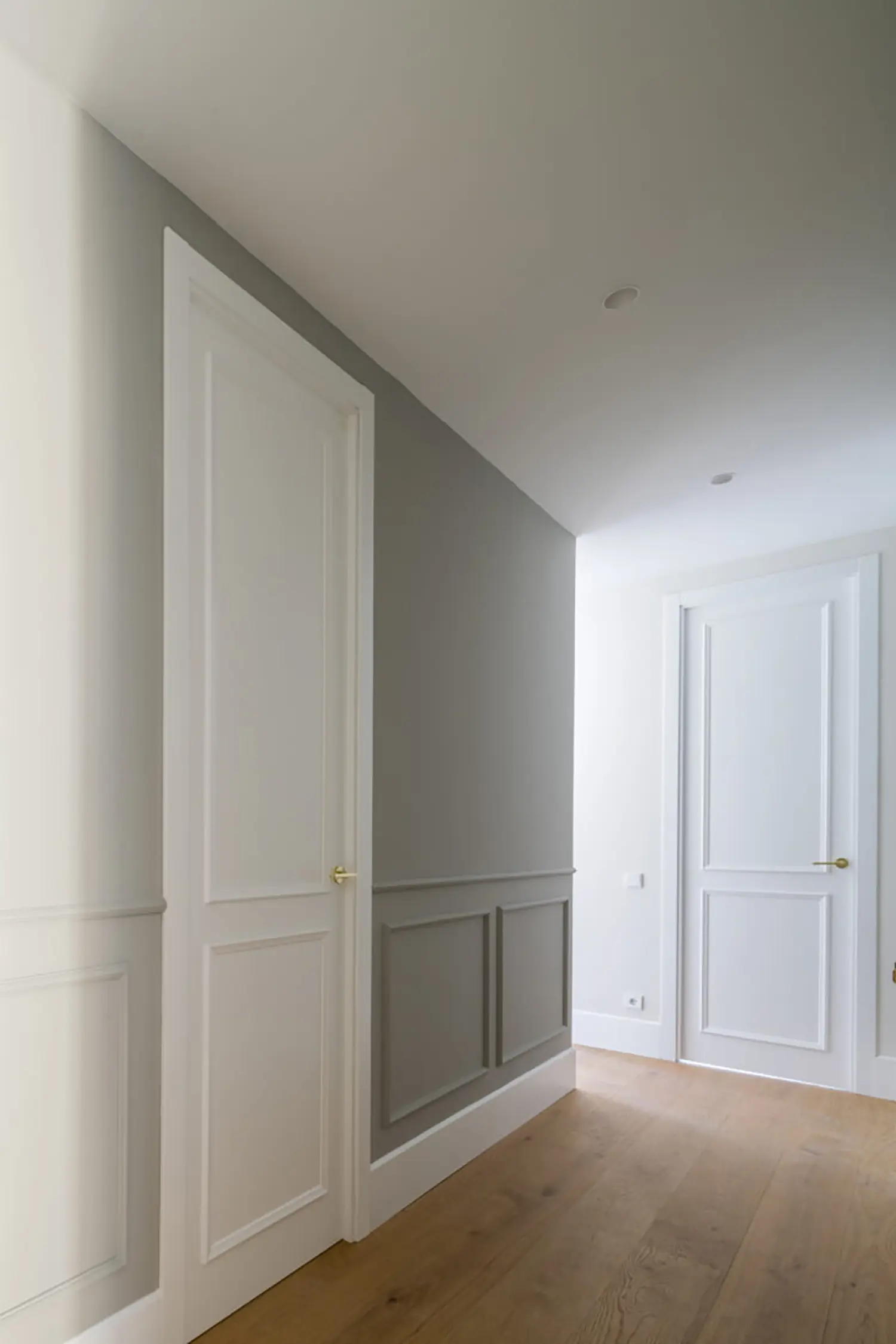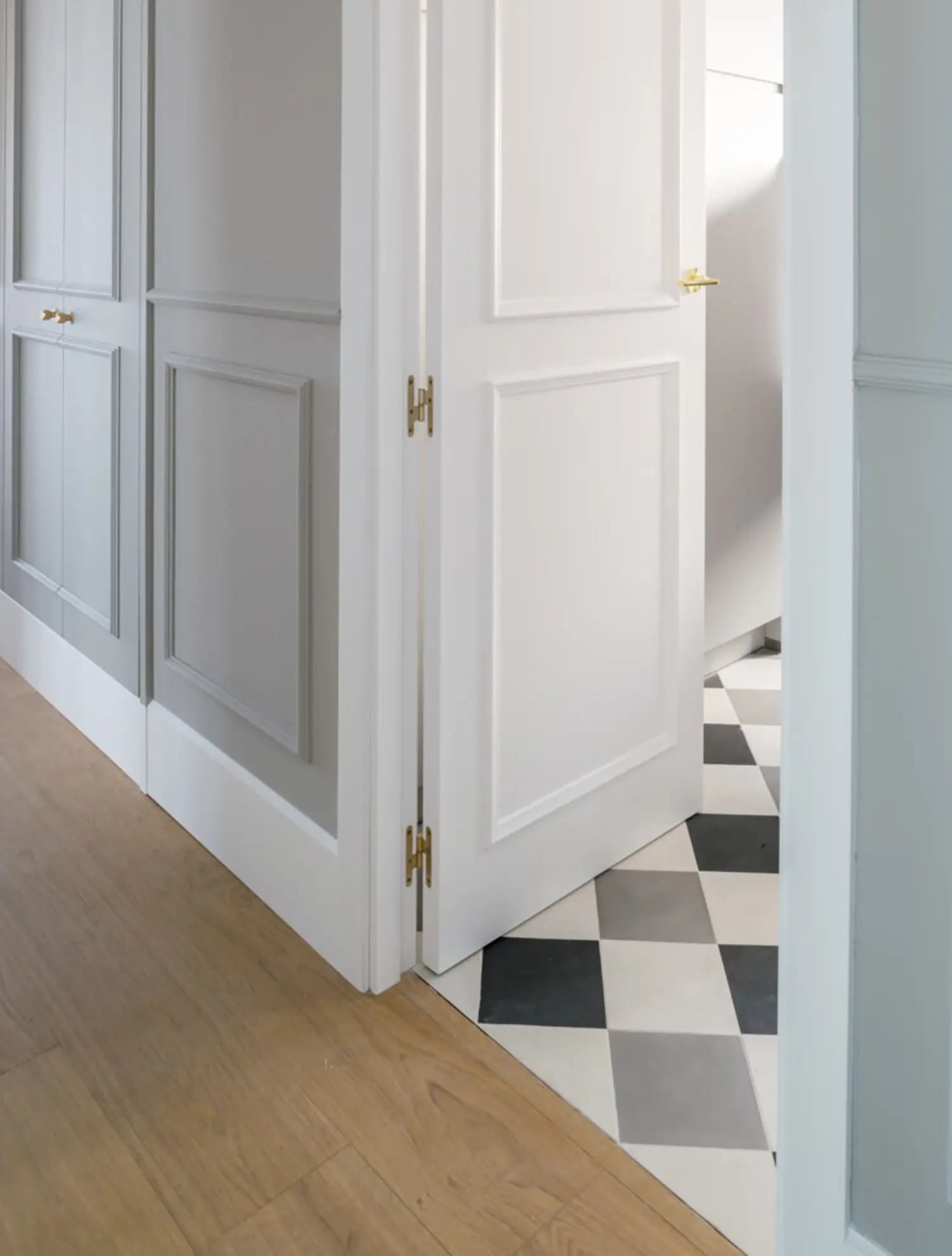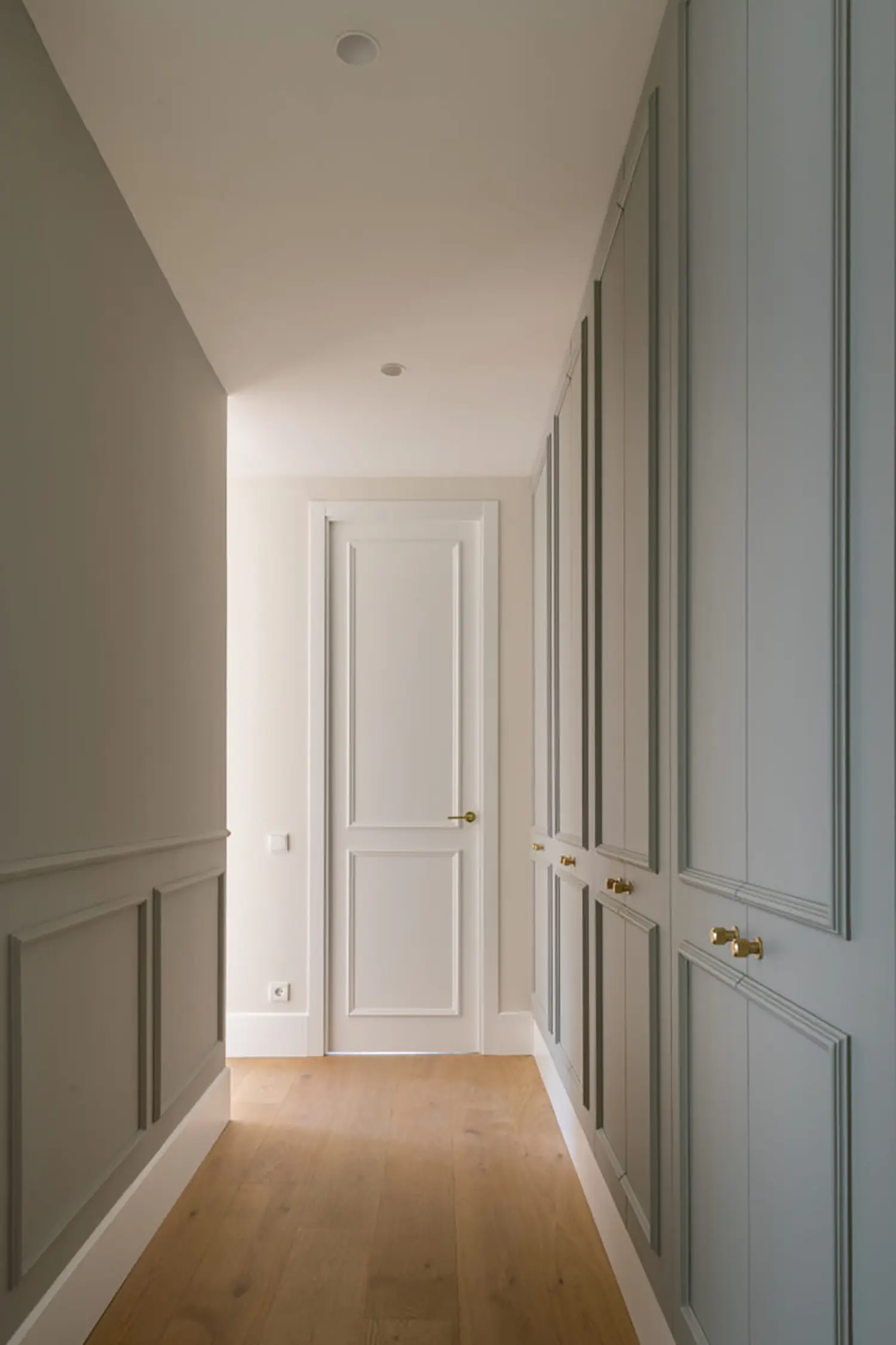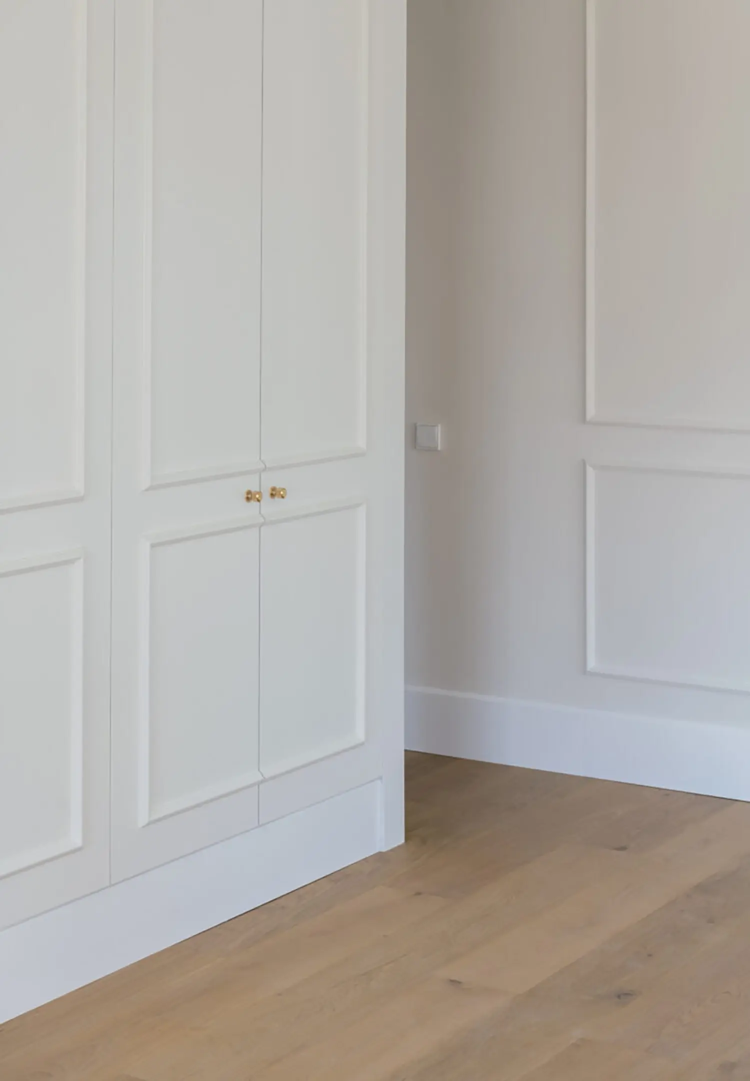 En esta vivienda destaca el toque clásico, atemporal y elegante de los baquetones presentes en las paredes y puertas de armarios a medida, que adquieren una personalidad especial combinando el color blanco general en la casa, con zonas
