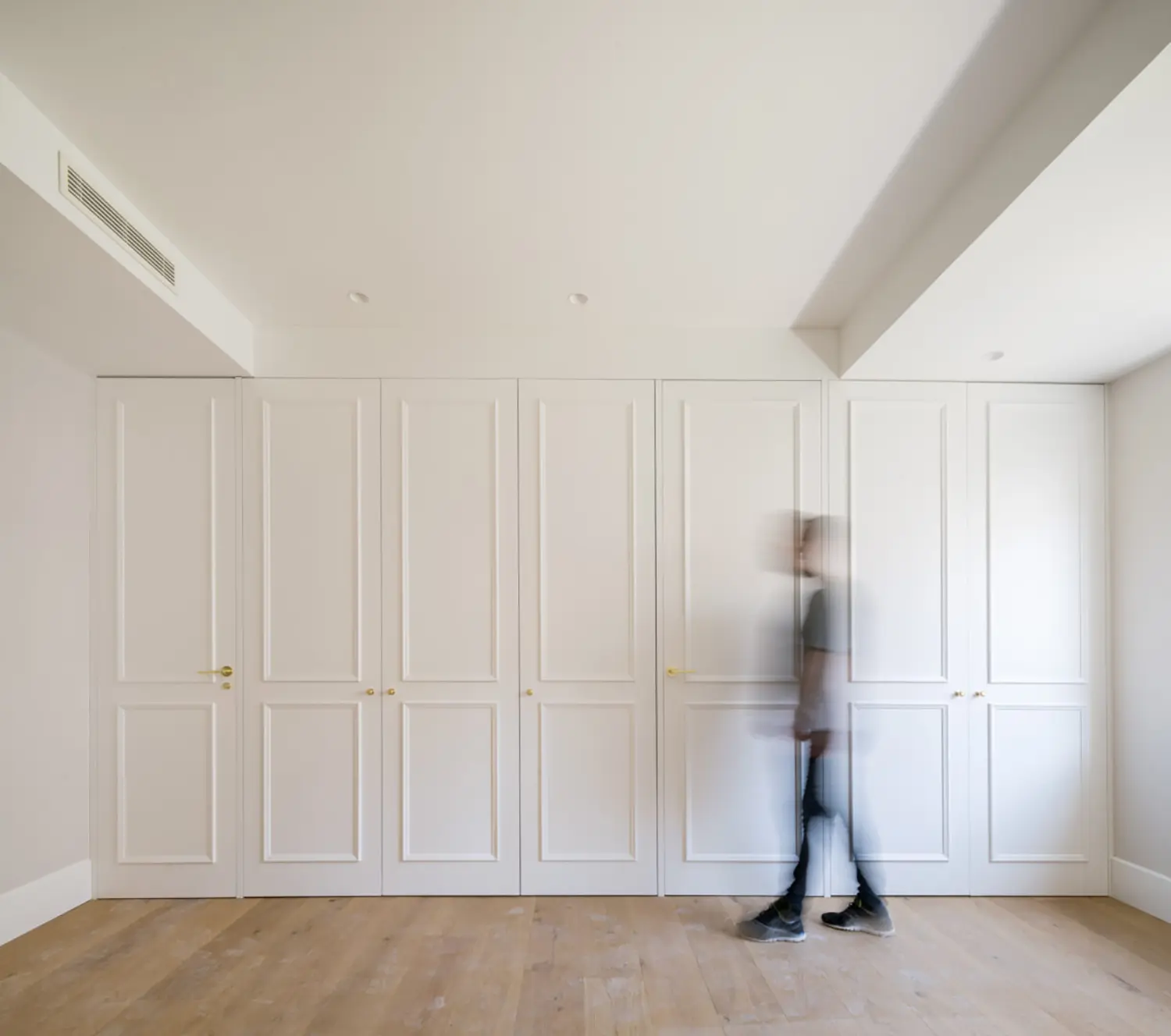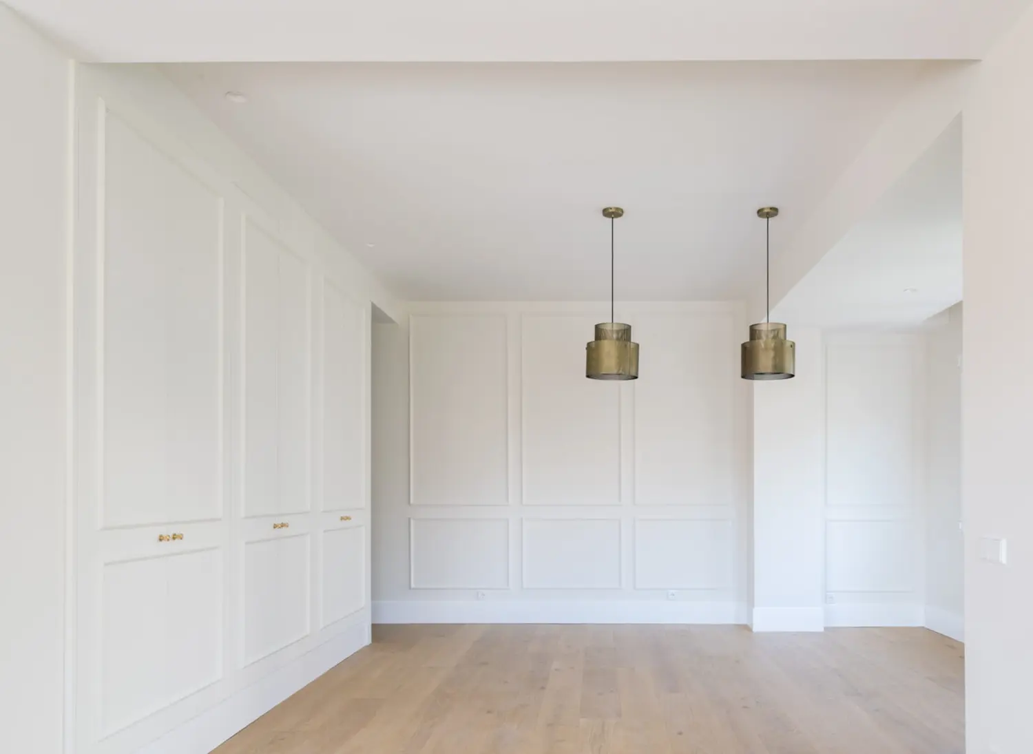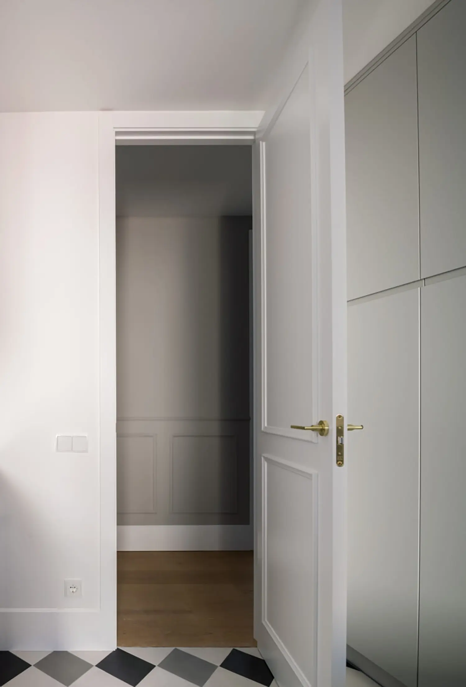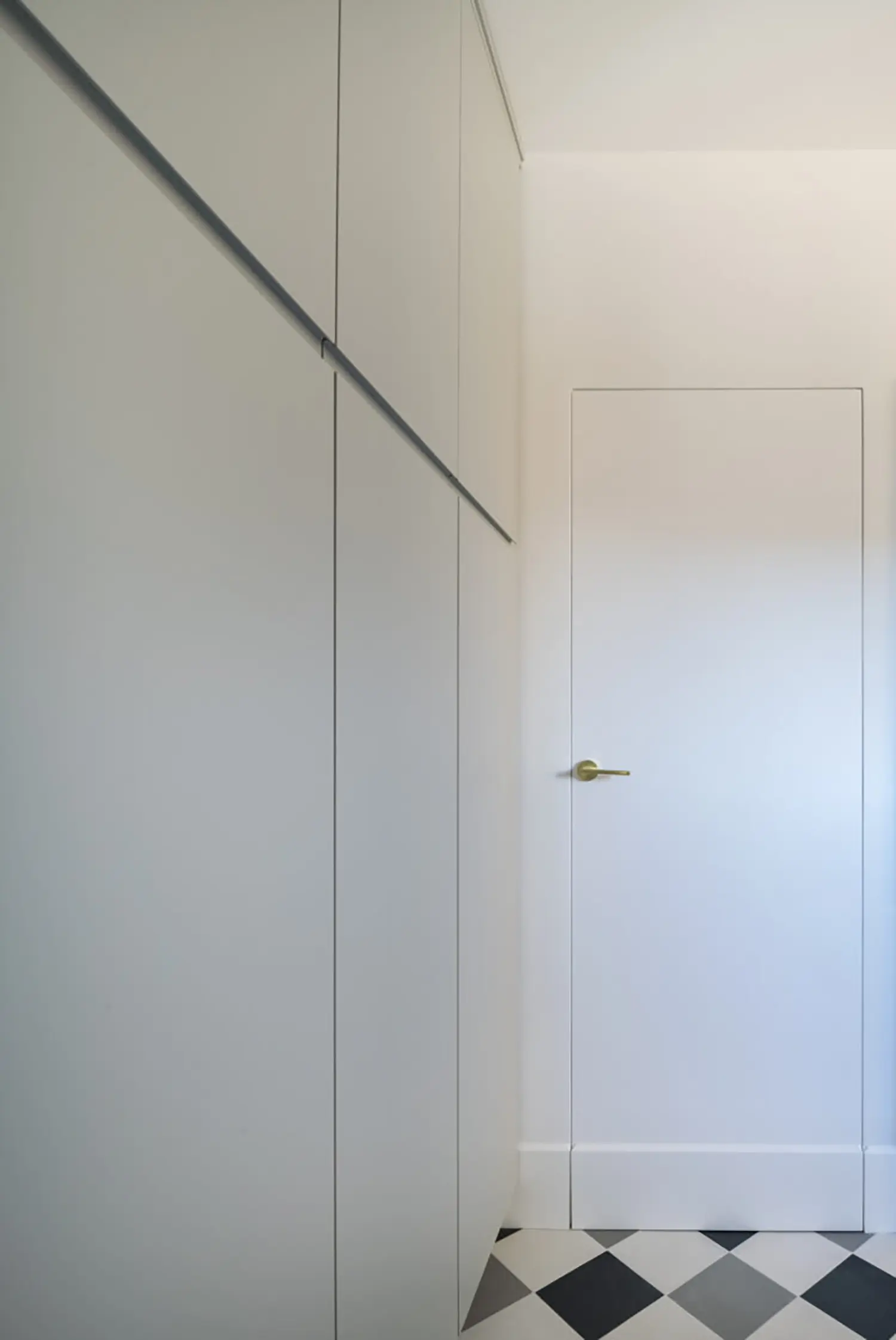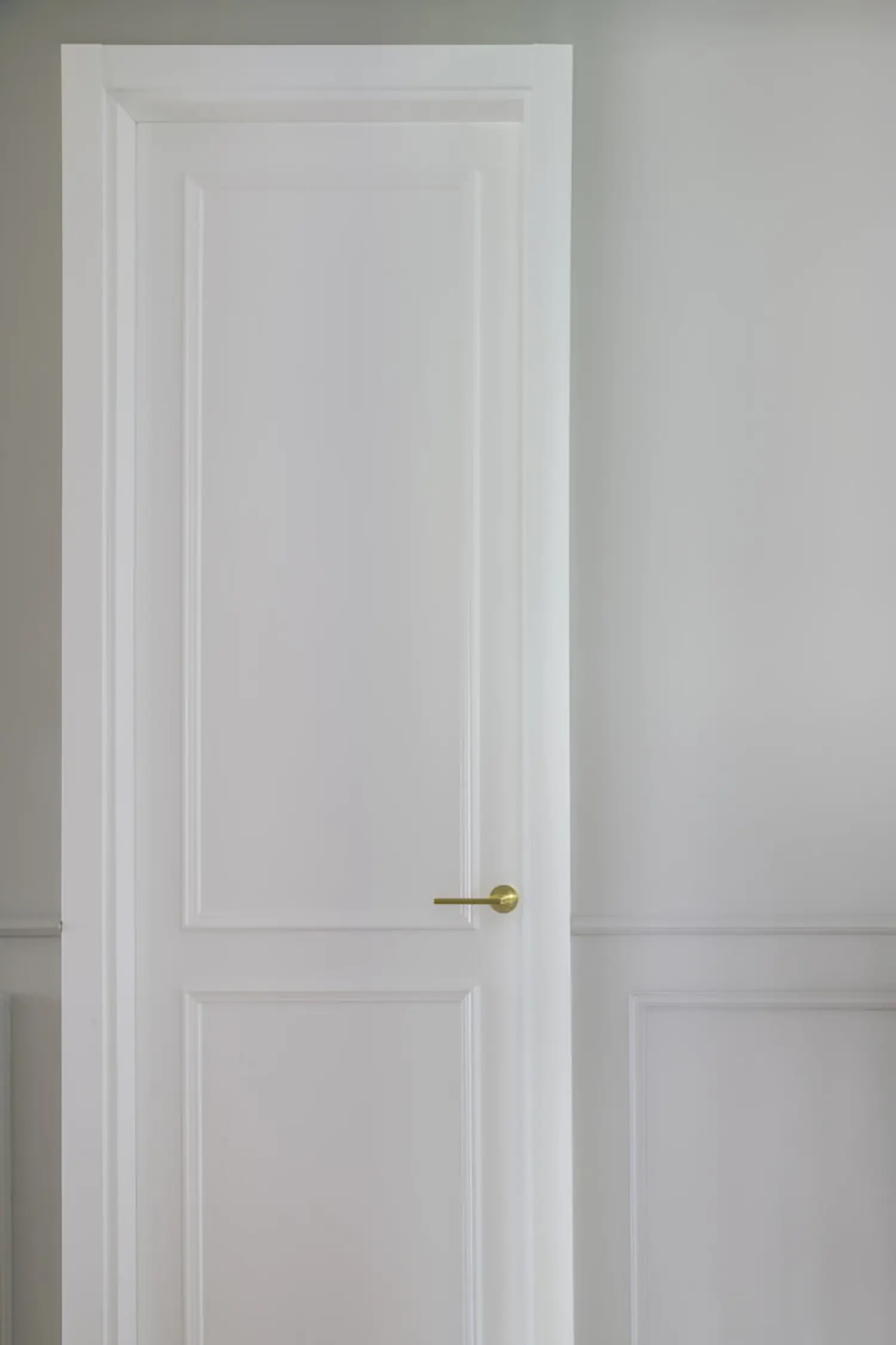 En esta vivienda destaca el toque clásico, atemporal y elegante de los baquetones presentes en las paredes y puertas de armarios a medida, que adquieren una personalidad especial combinando el color blanco general en la casa, con zonas