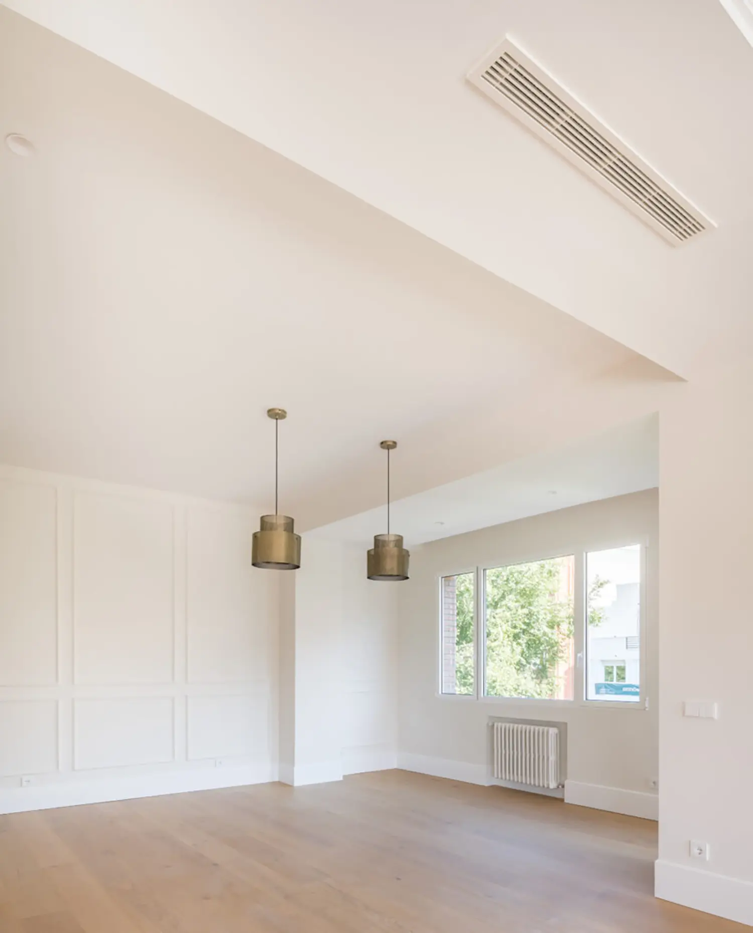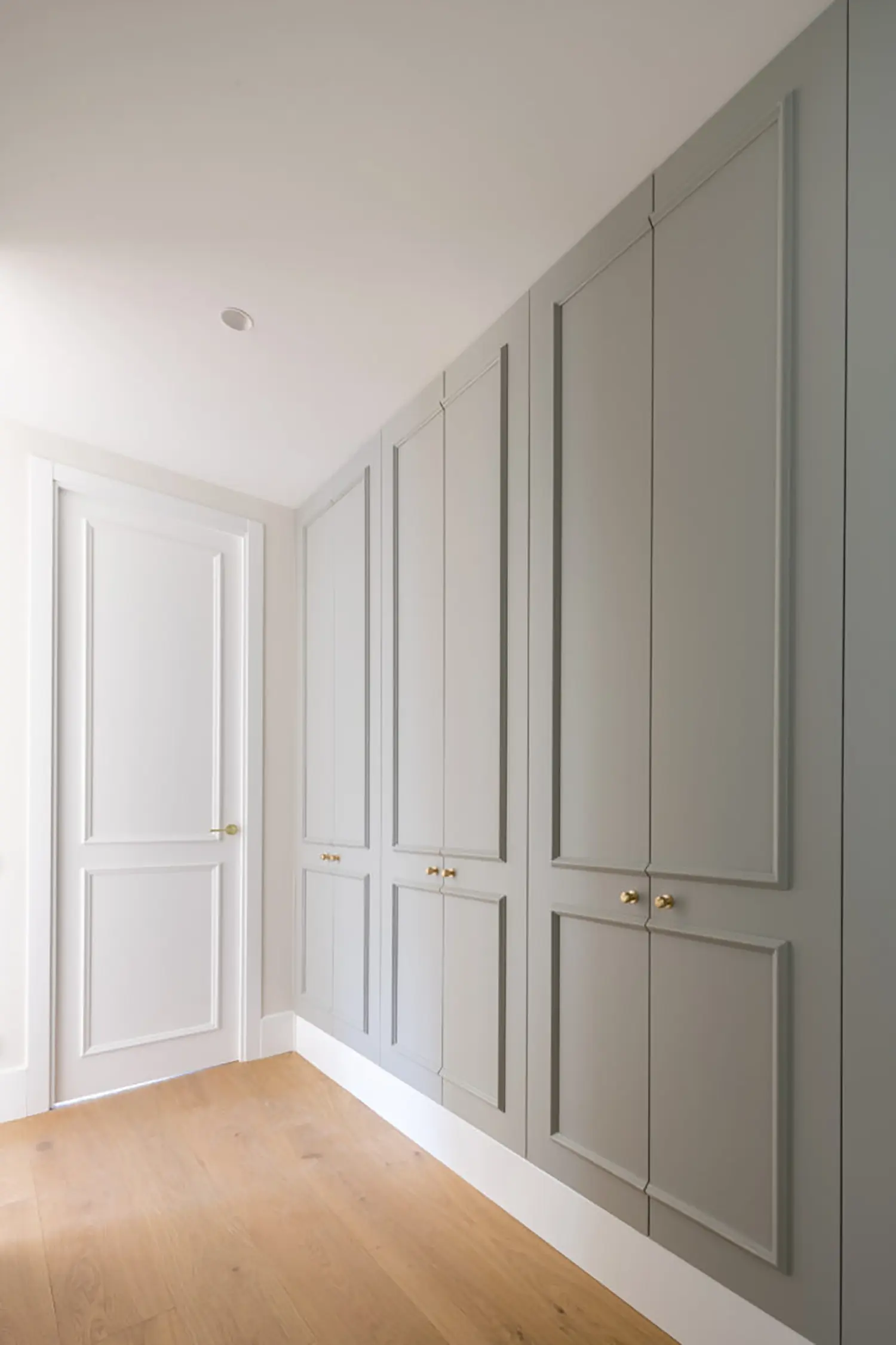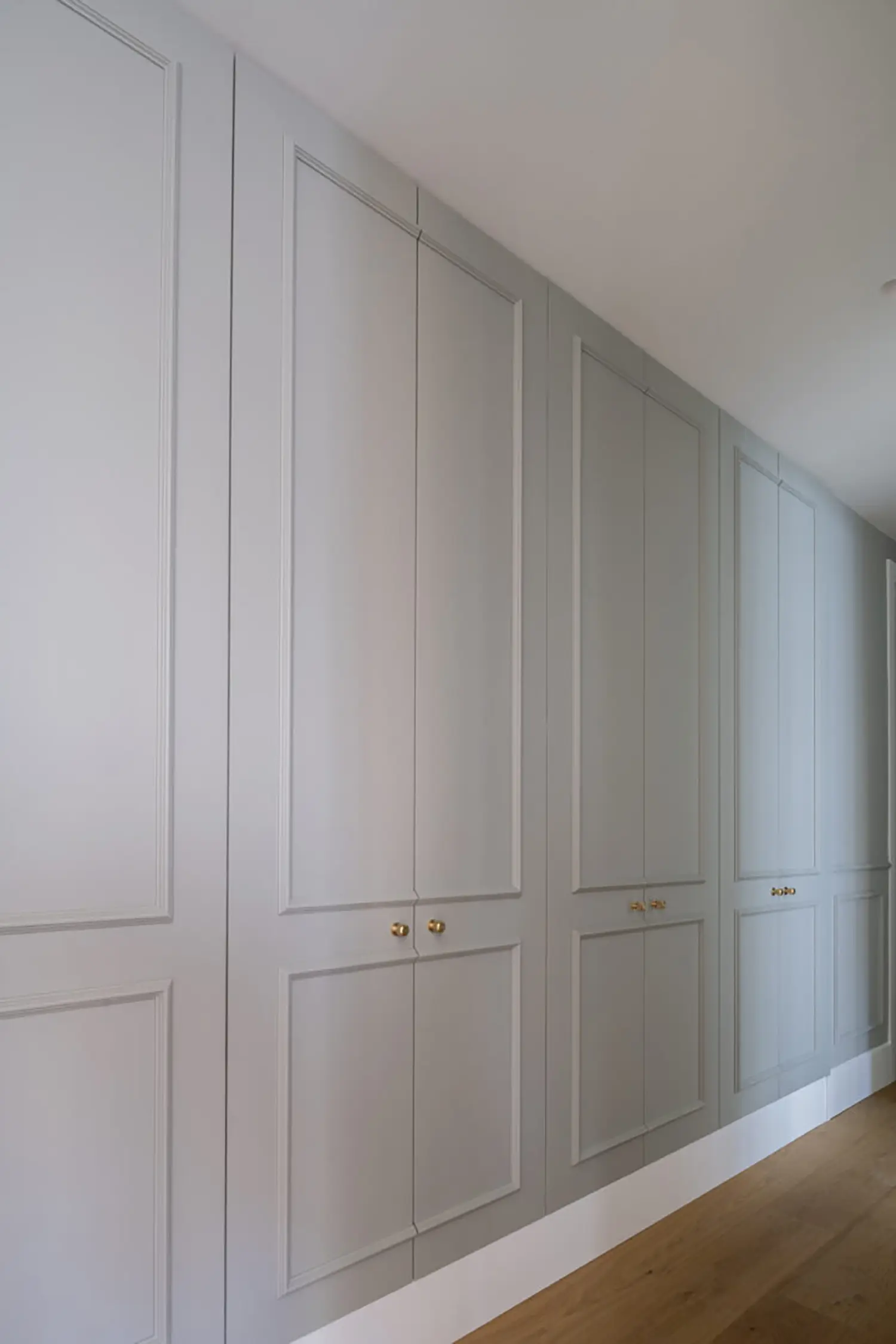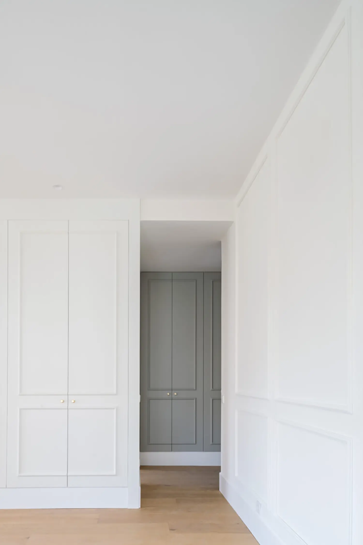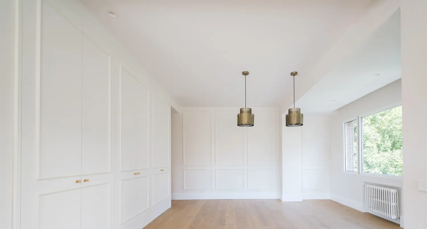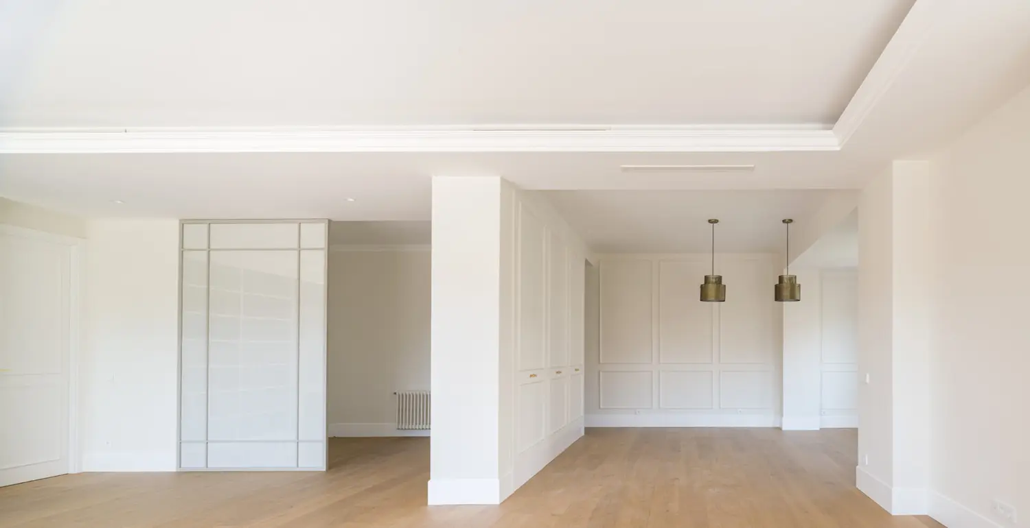 En esta vivienda destaca el toque clásico, atemporal y elegante de los baquetones presentes en las paredes y puertas de armarios a medida, que adquieren una personalidad especial combinando el color blanco general en la casa, con zonas