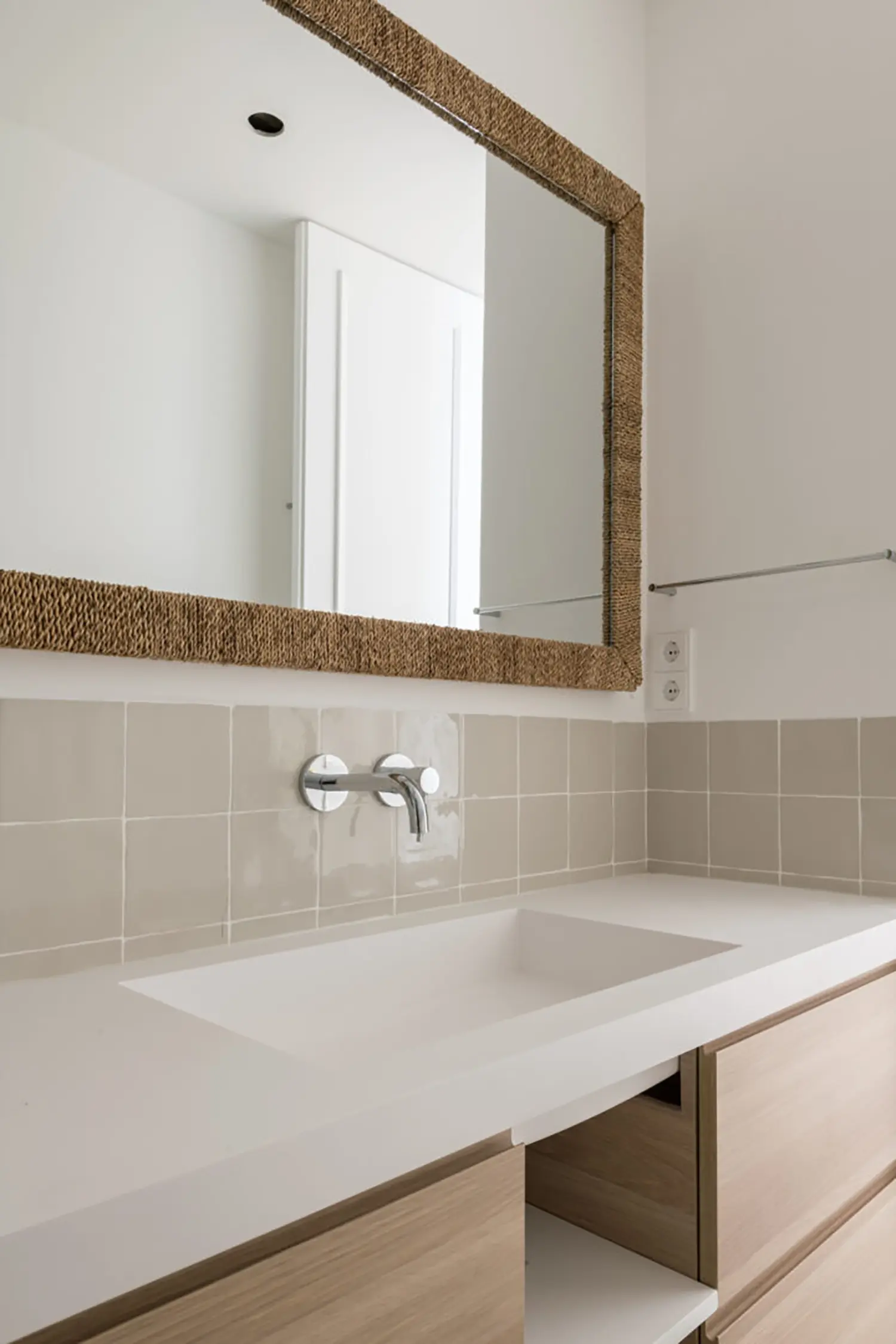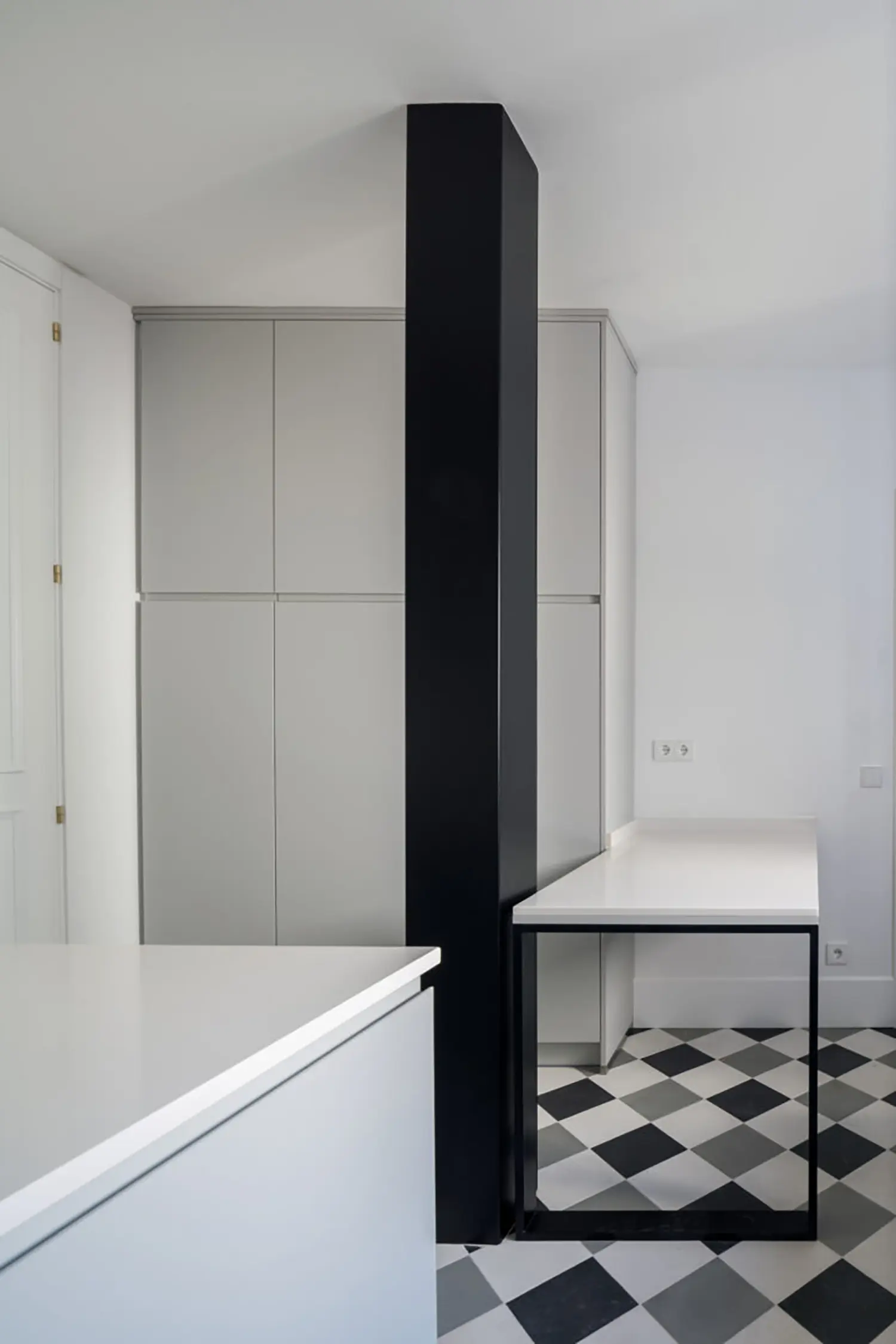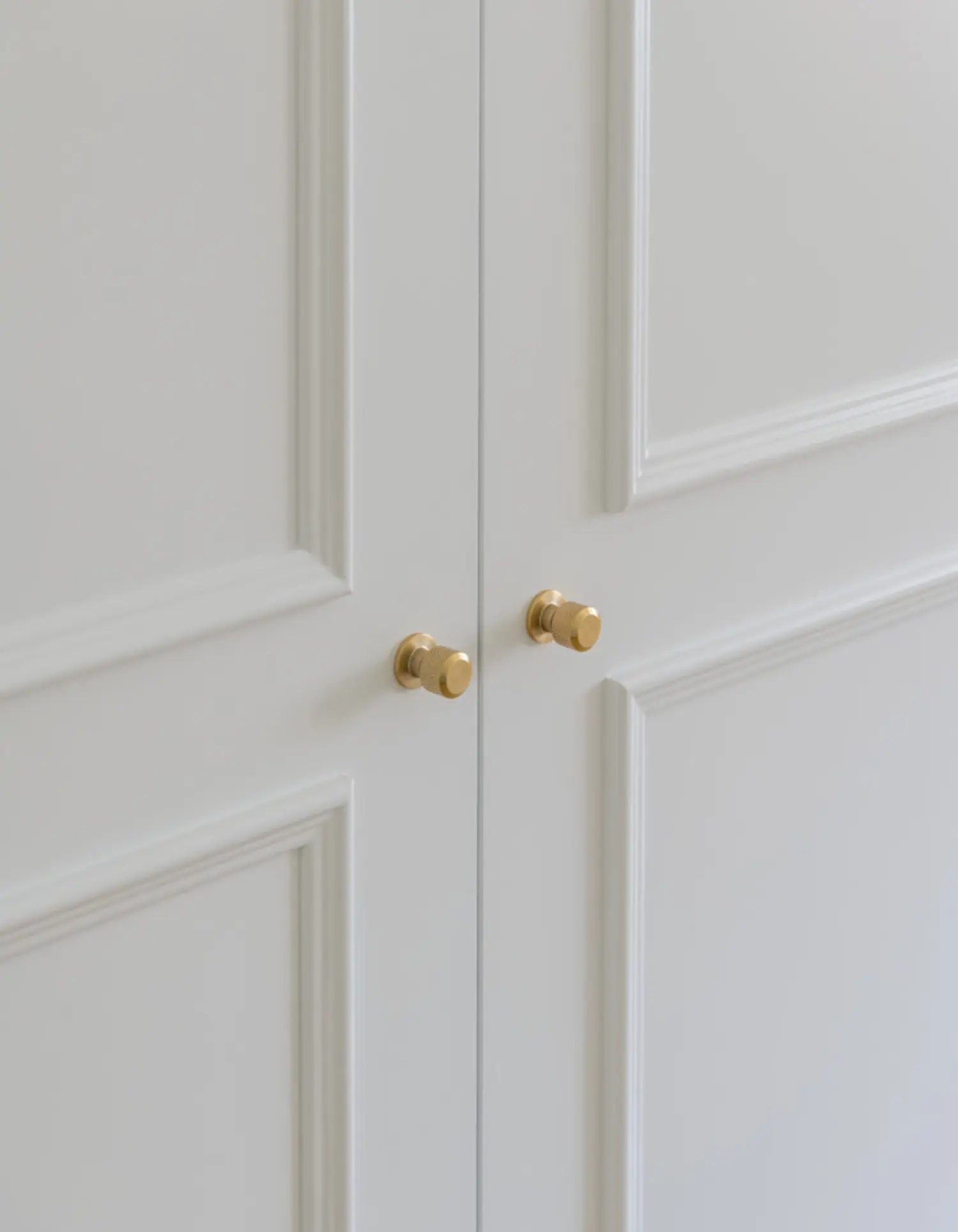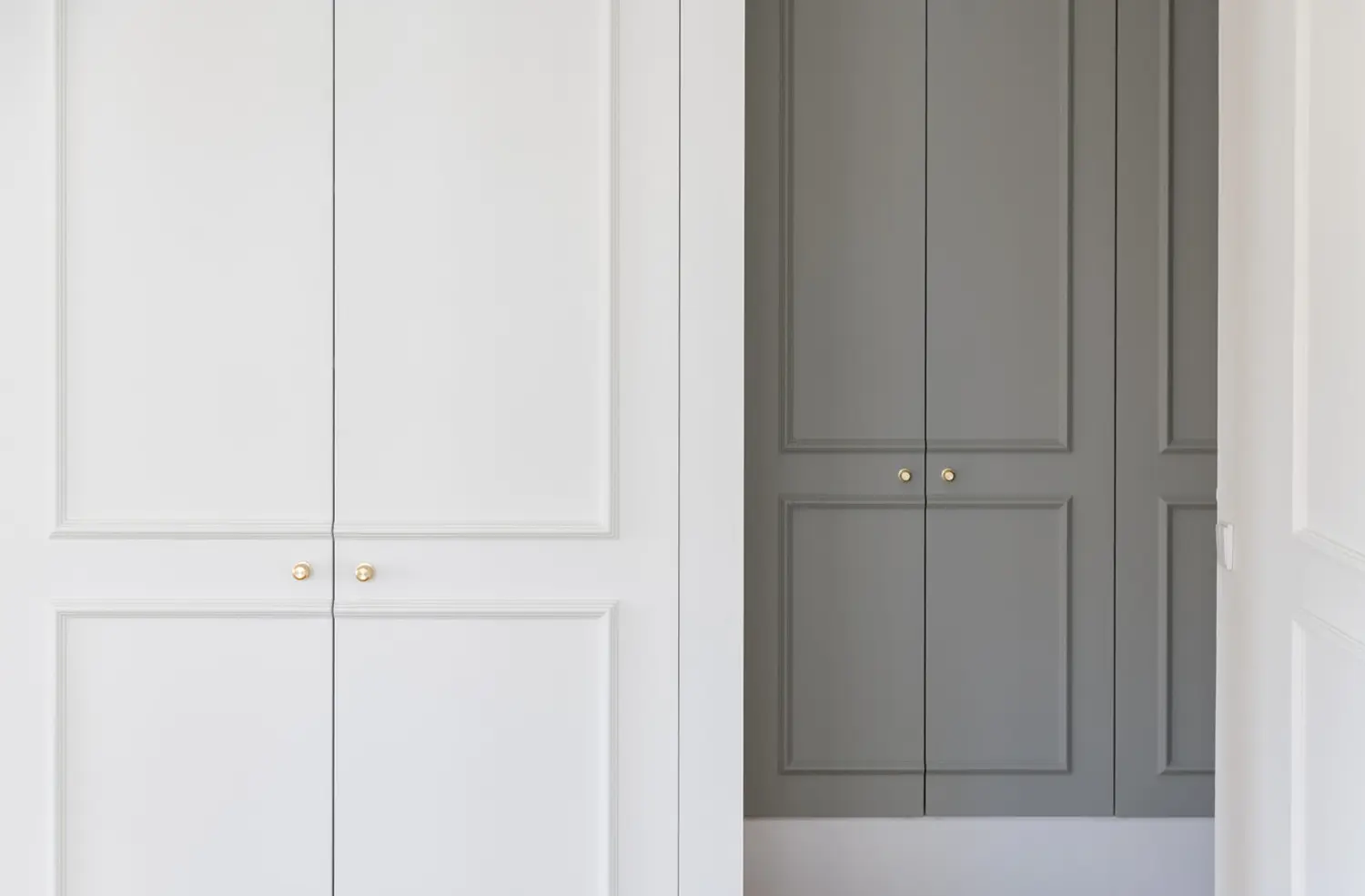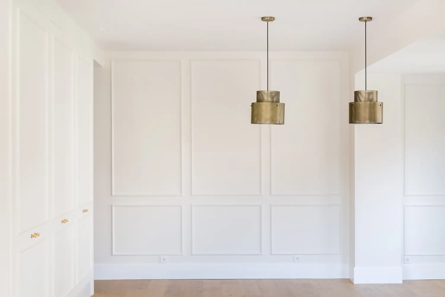 En esta vivienda destaca el toque clásico, atemporal y elegante de los baquetones presentes en las paredes y puertas de armarios a medida, que adquieren una personalidad especial combinando el color blanco general en la casa, con zonas
