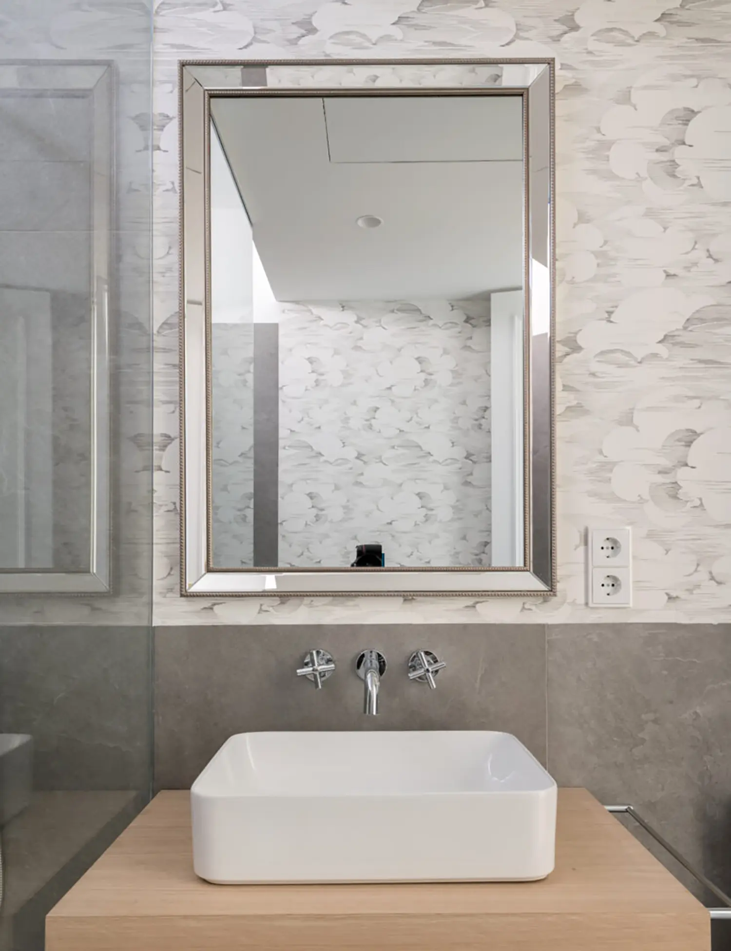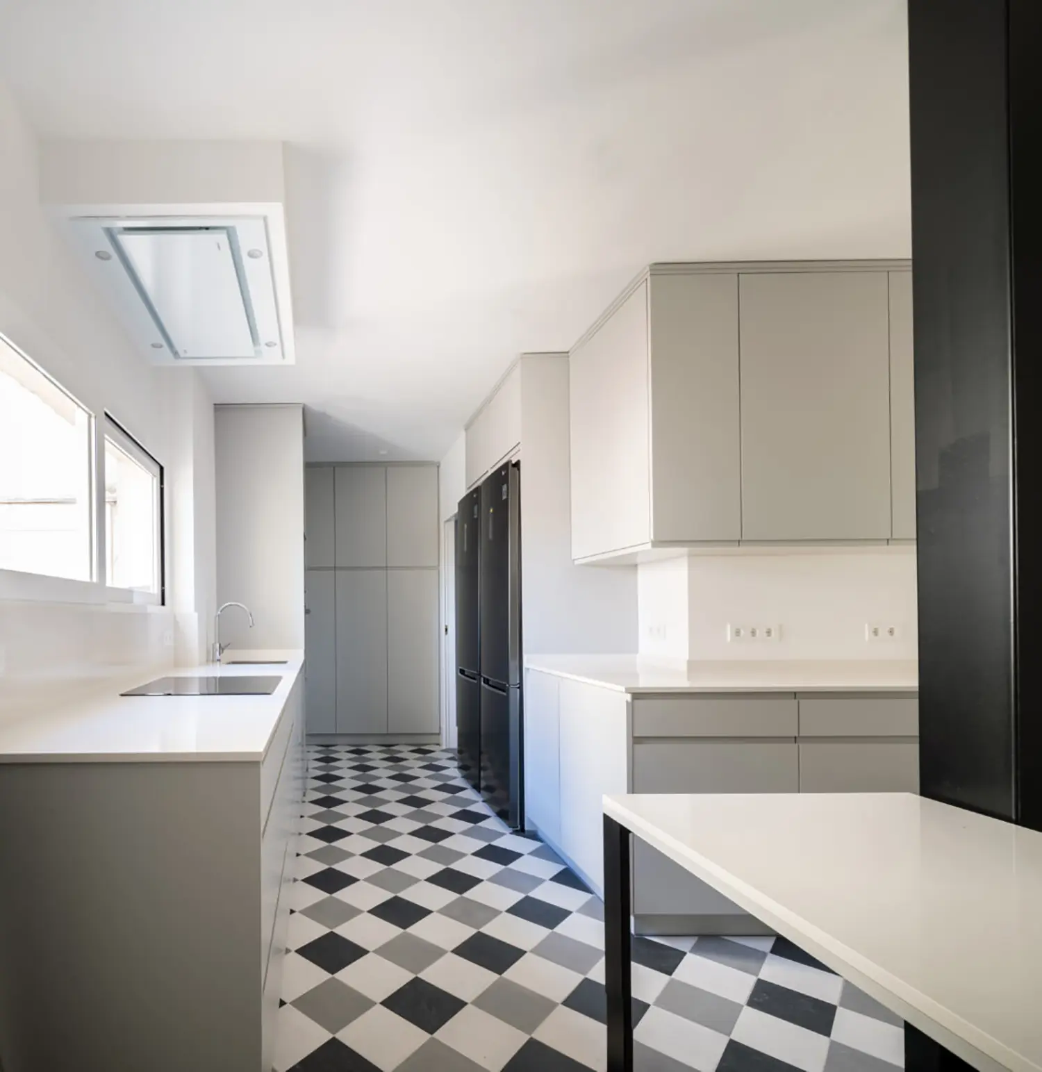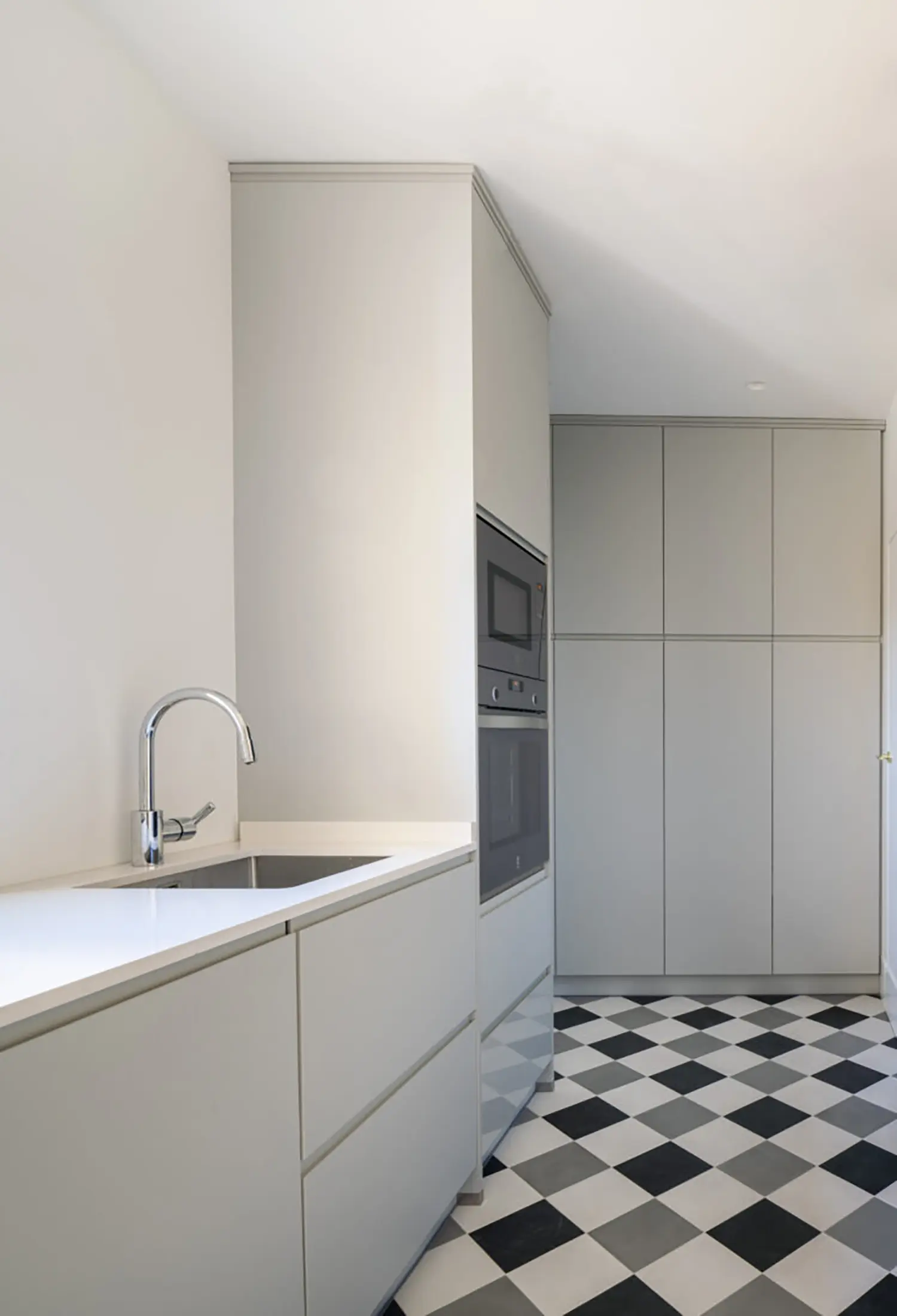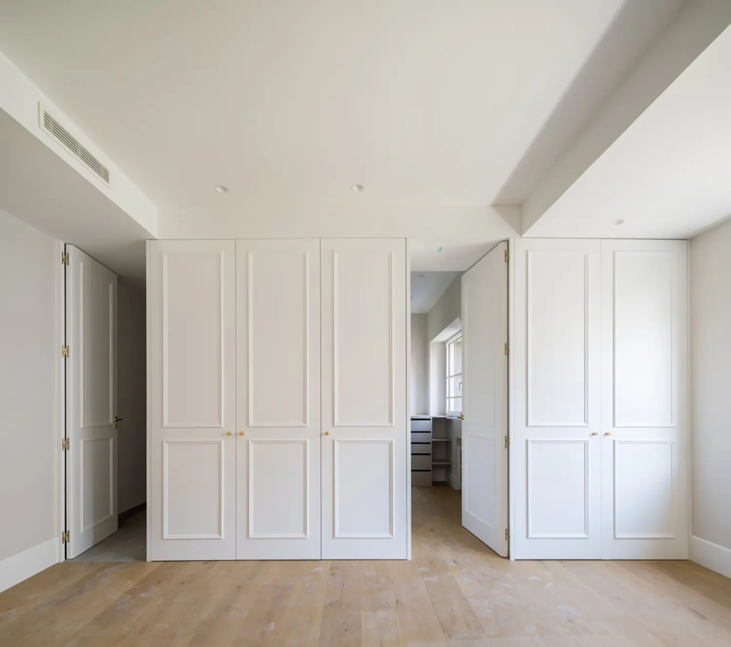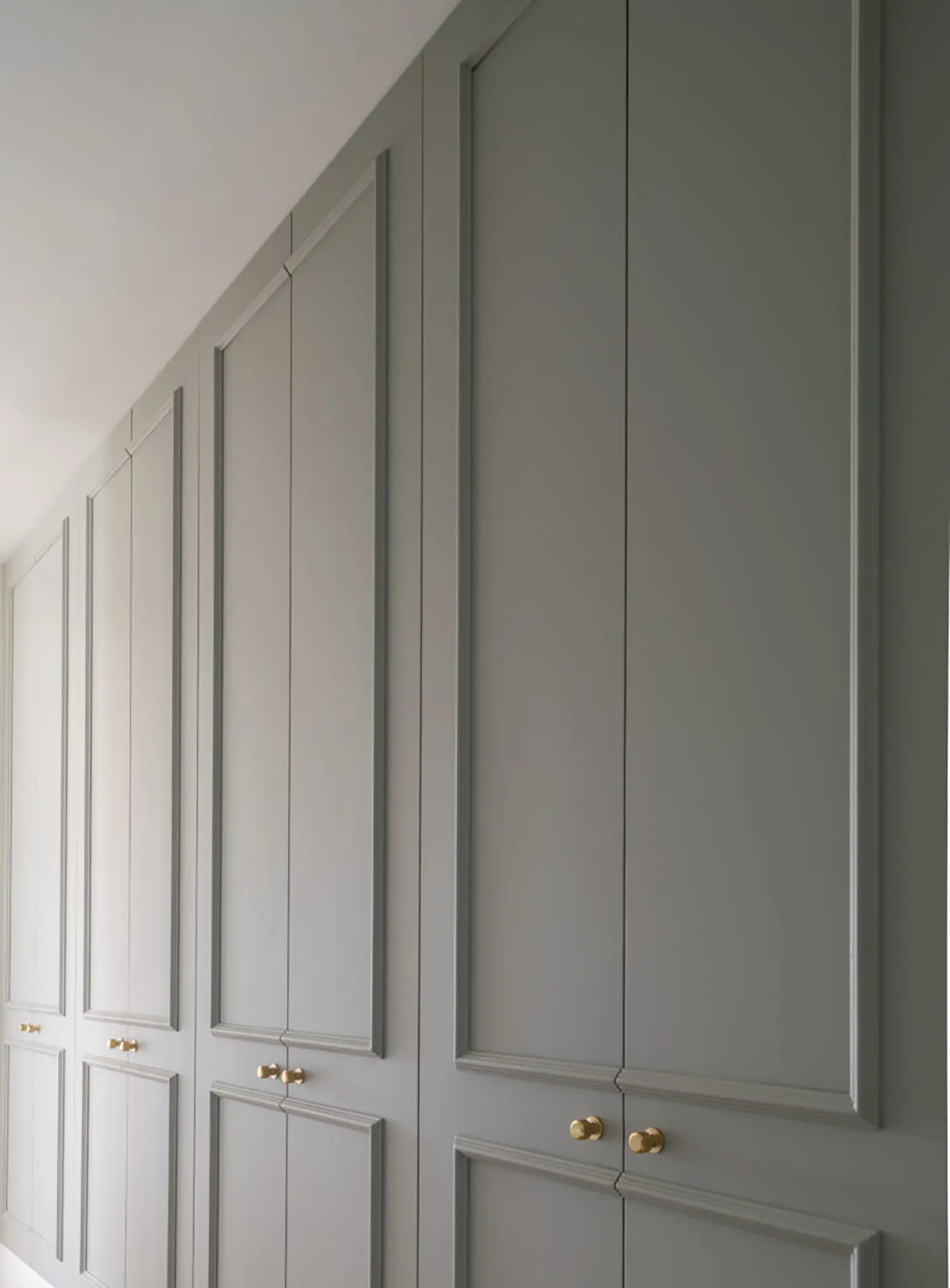 En esta vivienda destaca el toque clásico, atemporal y elegante de los baquetones presentes en las paredes y puertas de armarios a medida, que adquieren una personalidad especial combinando el color blanco general en la casa, con zonas