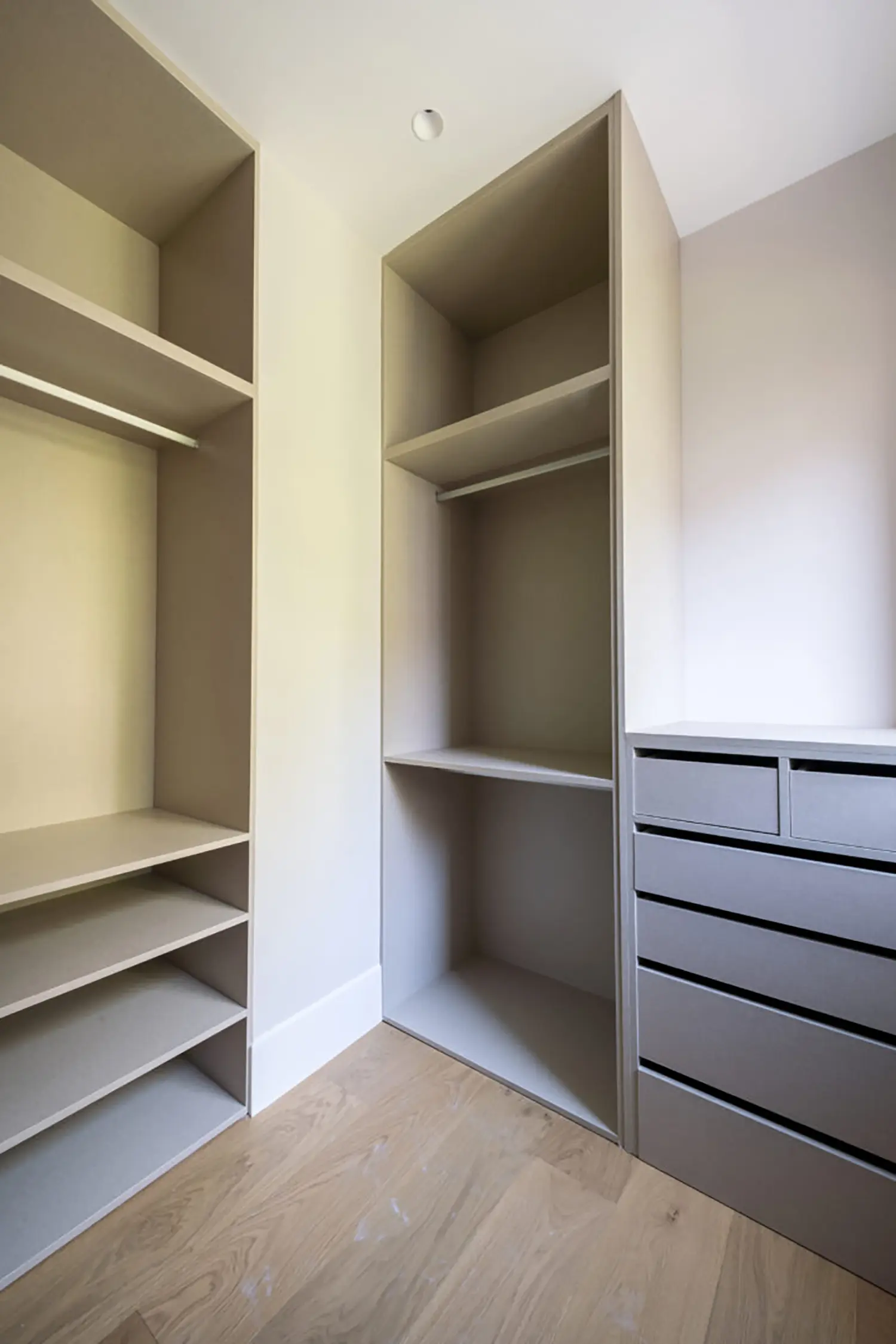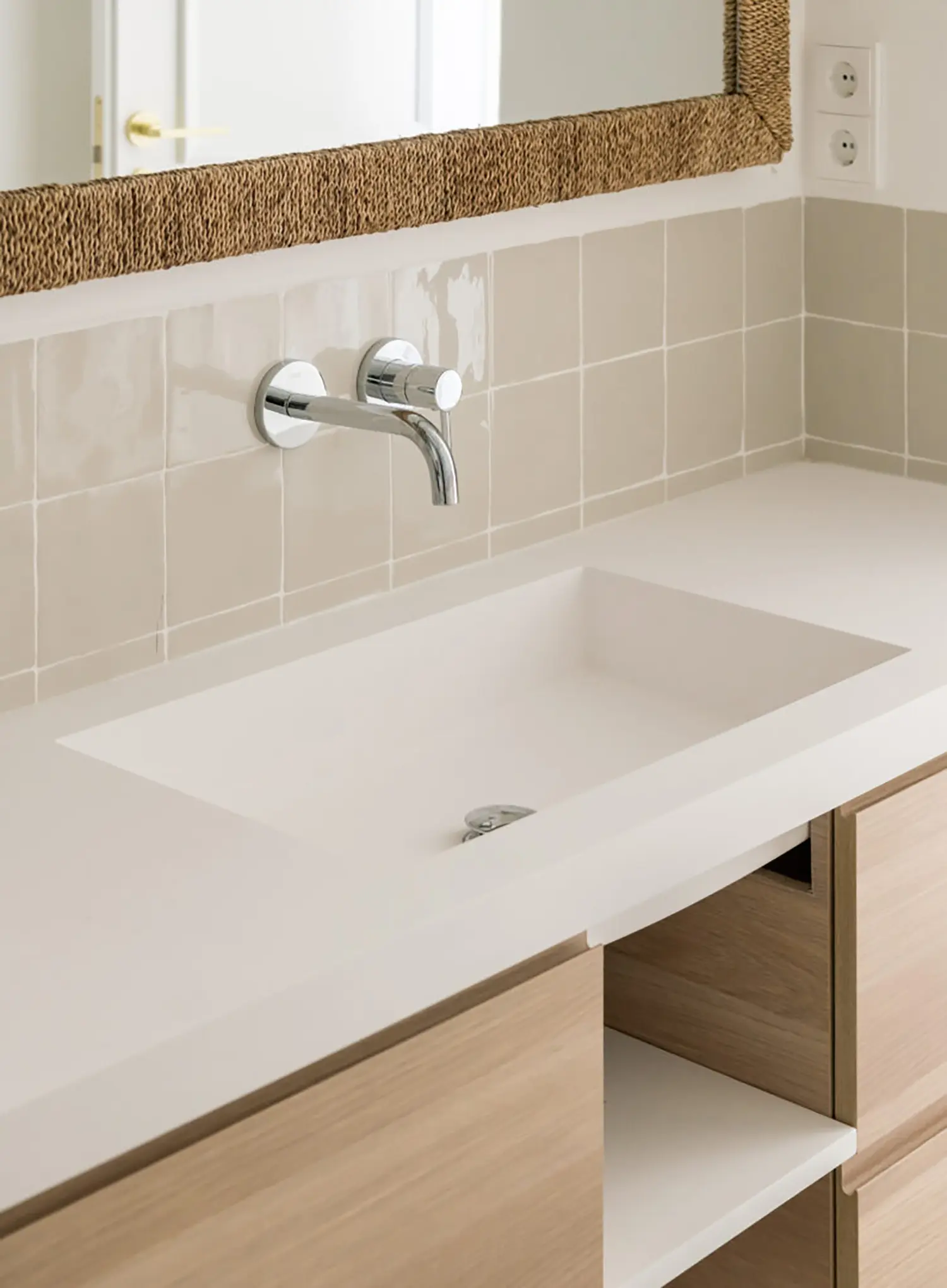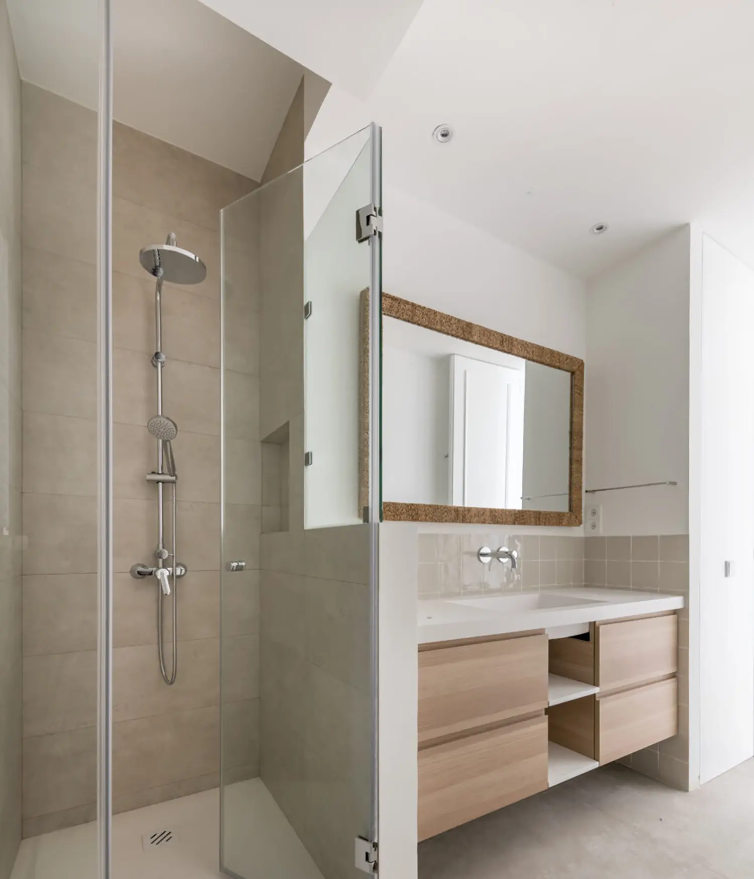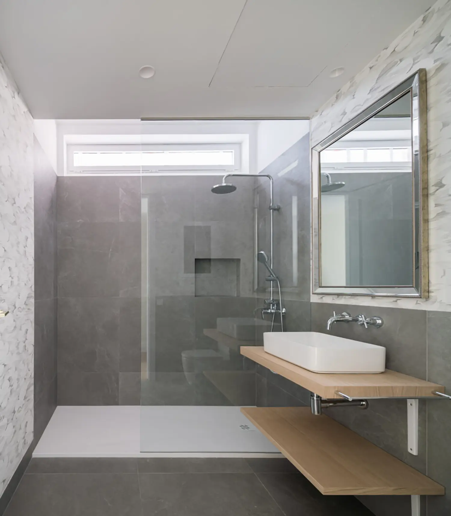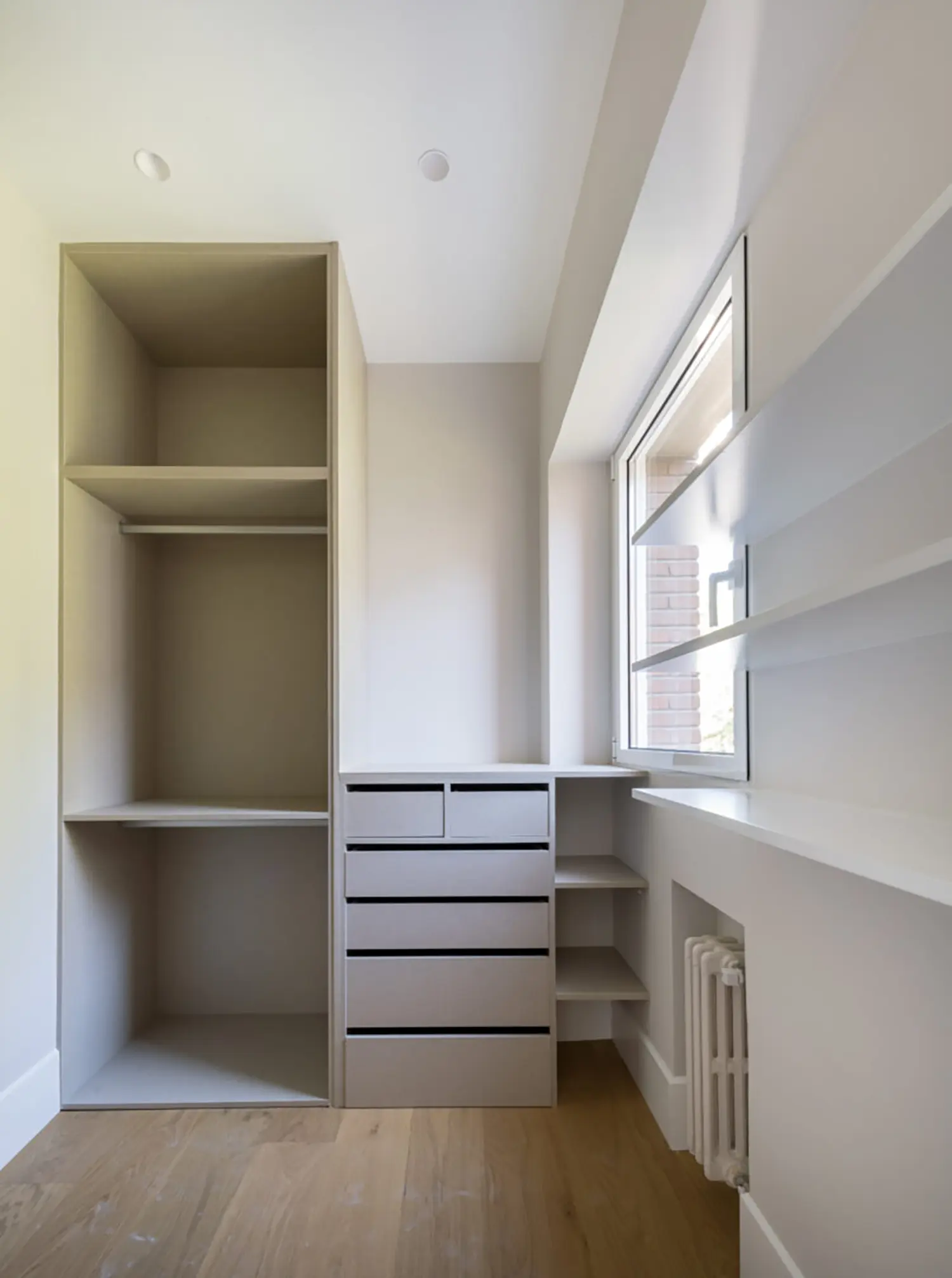 En esta vivienda destaca el toque clásico, atemporal y elegante de los baquetones presentes en las paredes y puertas de armarios a medida, que adquieren una personalidad especial combinando el color blanco general en la casa, con zonas