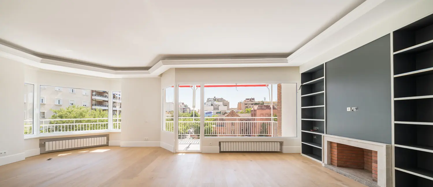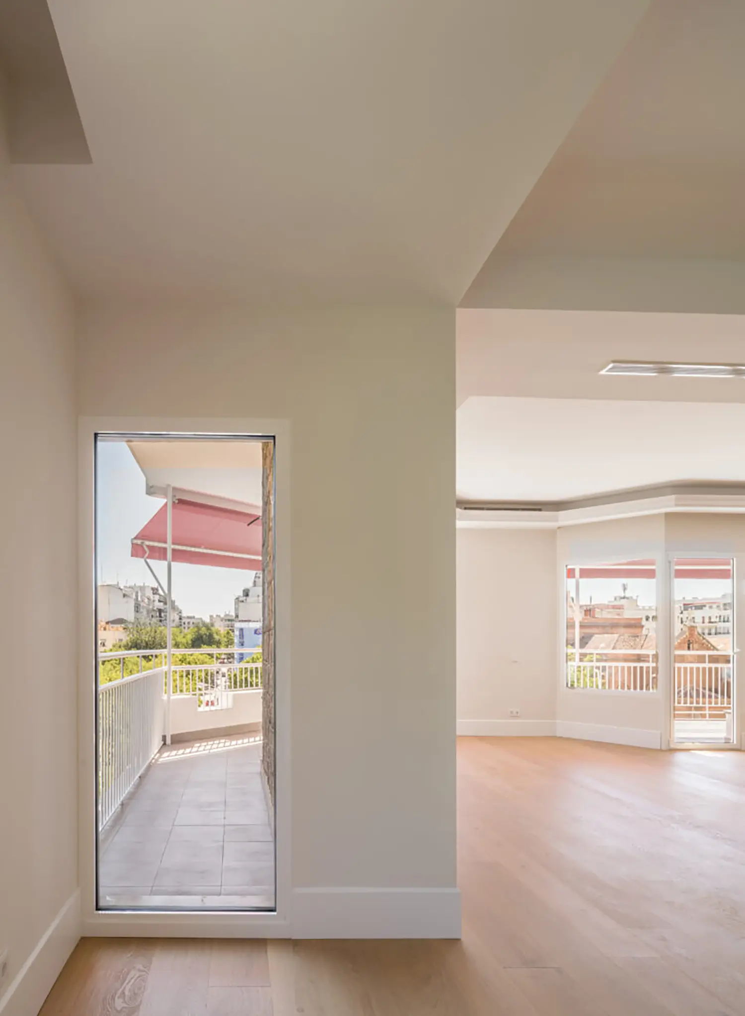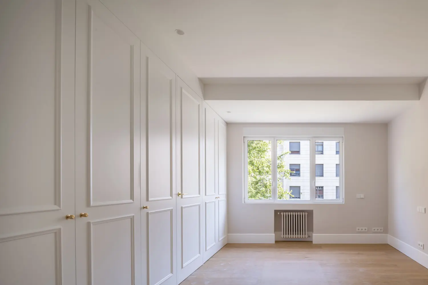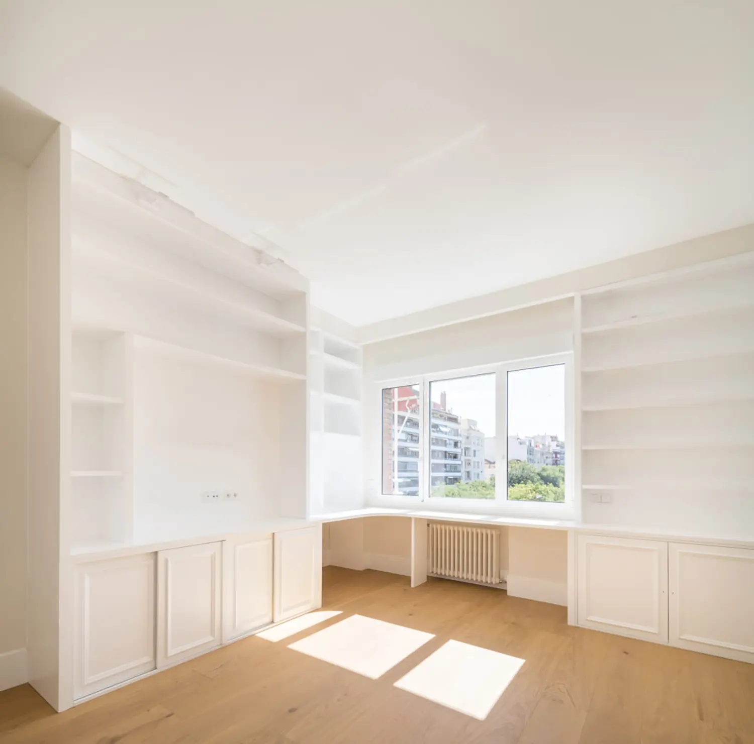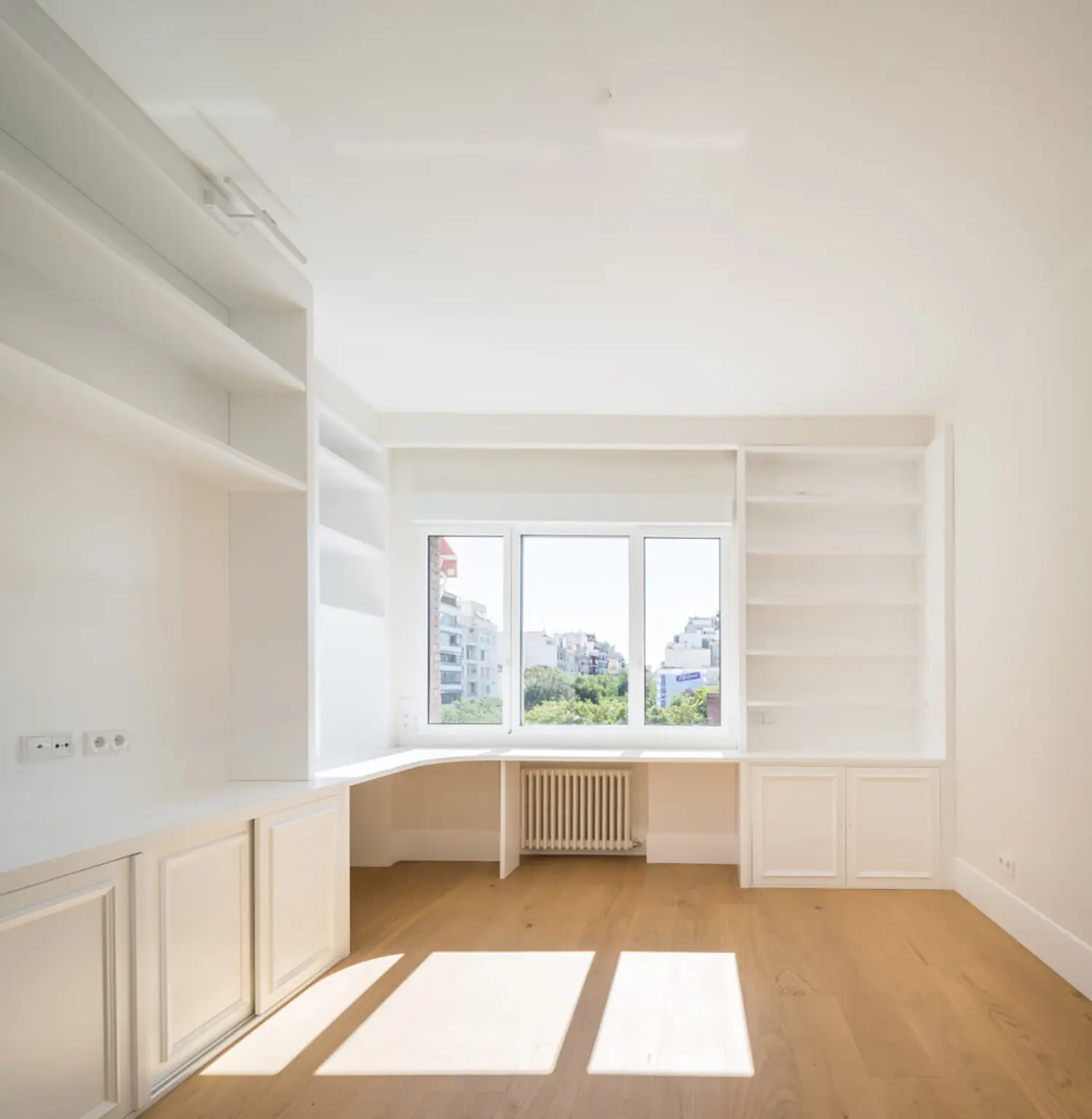 El amplio salón con chimenea y estantería a medida en el frente principal, tiene dos grandes ventanales y salida a una soleada terraza en esquina en pleno Barrio Salamanca de Madrid, lo que convierte a este espacio en el corazón de la vivienda. Además, está conectado espacialmente con el comedor, que disfruta de otro ventanal y otro acceso a la terraza. Desde el recibidor y desde el comedor se accede directamente al distribuidor, que tiene una pared completa de armarios a medida y acceso a la cocina, a un baño completo y a los dos dormitorios dobles. El dormitorio principal destaca por su frente de armarios a medida de lado a lado, que oculta dos puertas tras las cuales se esconden un vestidor por un lado, y el baño en suite por otro.