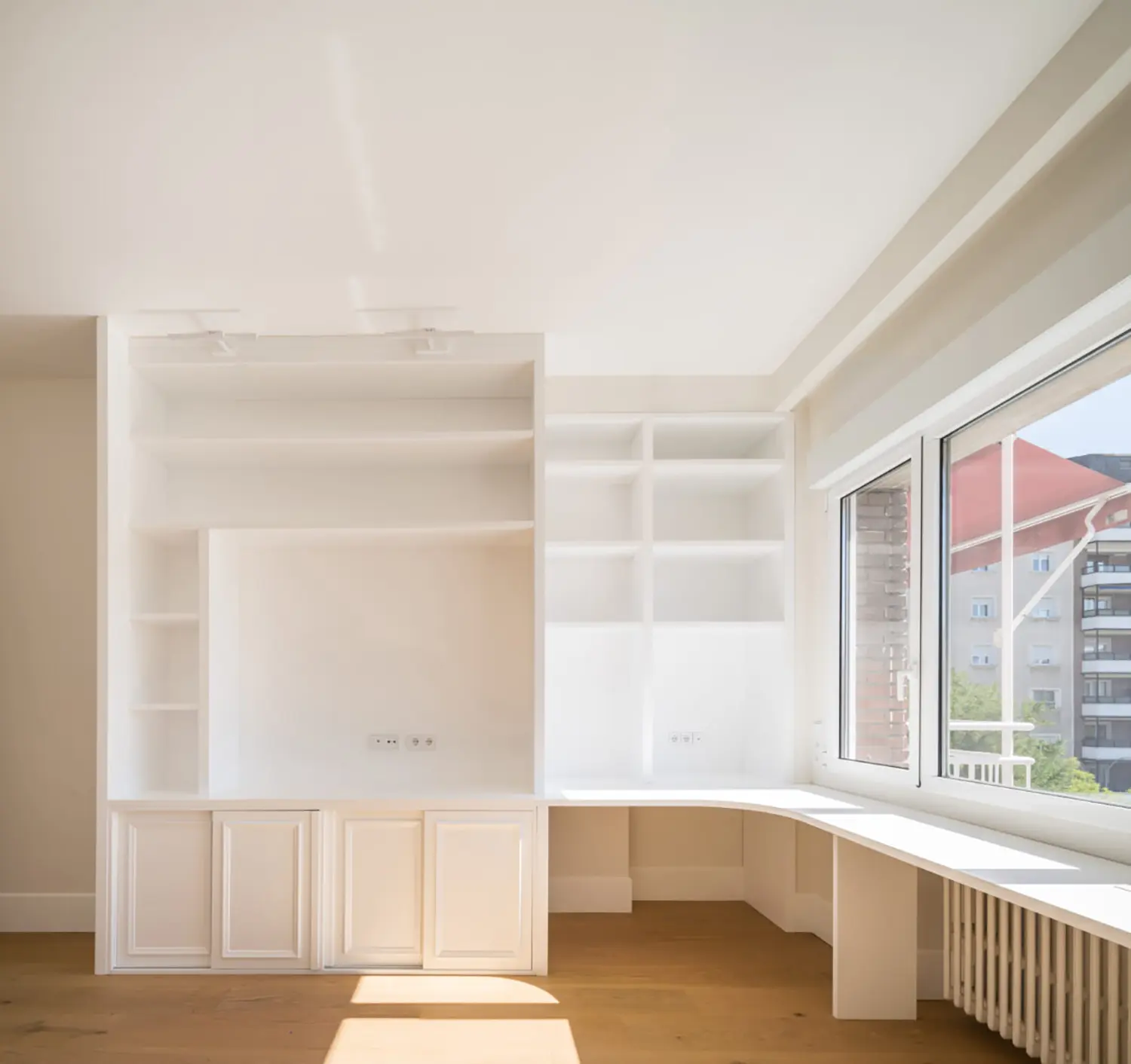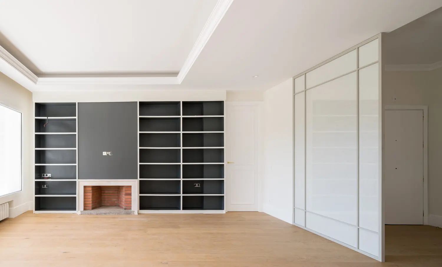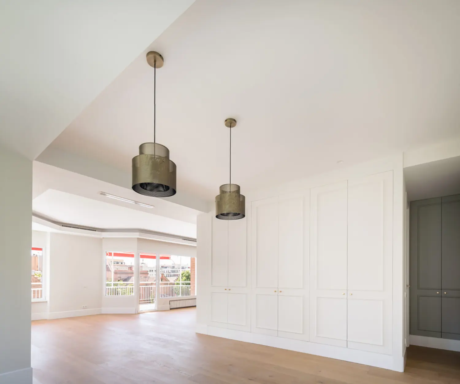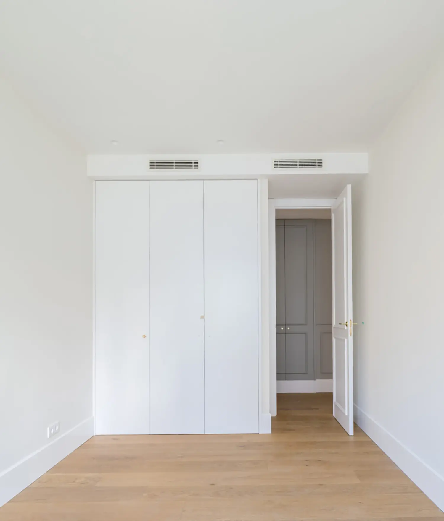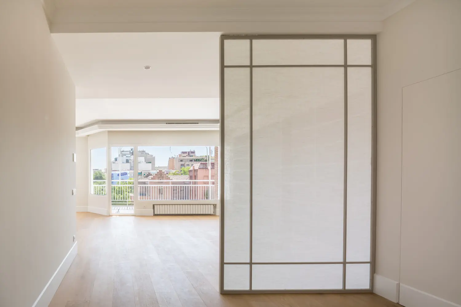 El amplio salón con chimenea y estantería a medida en el frente principal, tiene dos grandes ventanales y salida a una soleada terraza en esquina en pleno Barrio Salamanca de Madrid, lo que convierte a este espacio en el corazón de la vivienda. Además, está conectado espacialmente con el comedor, que disfruta de otro ventanal y otro acceso a la terraza. Desde el recibidor y desde el comedor se accede directamente al distribuidor, que tiene una pared completa de armarios a medida y acceso a la cocina, a un baño completo y a los dos dormitorios dobles. El dormitorio principal destaca por su frente de armarios a medida de lado a lado, que oculta dos puertas tras las cuales se esconden un vestidor por un lado, y el baño en suite por otro.