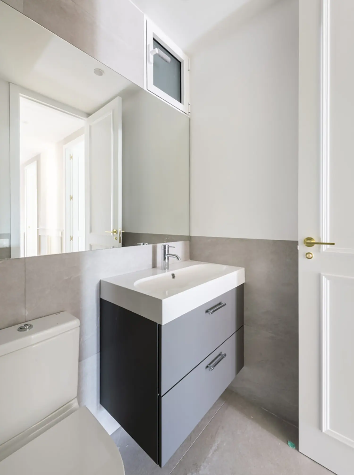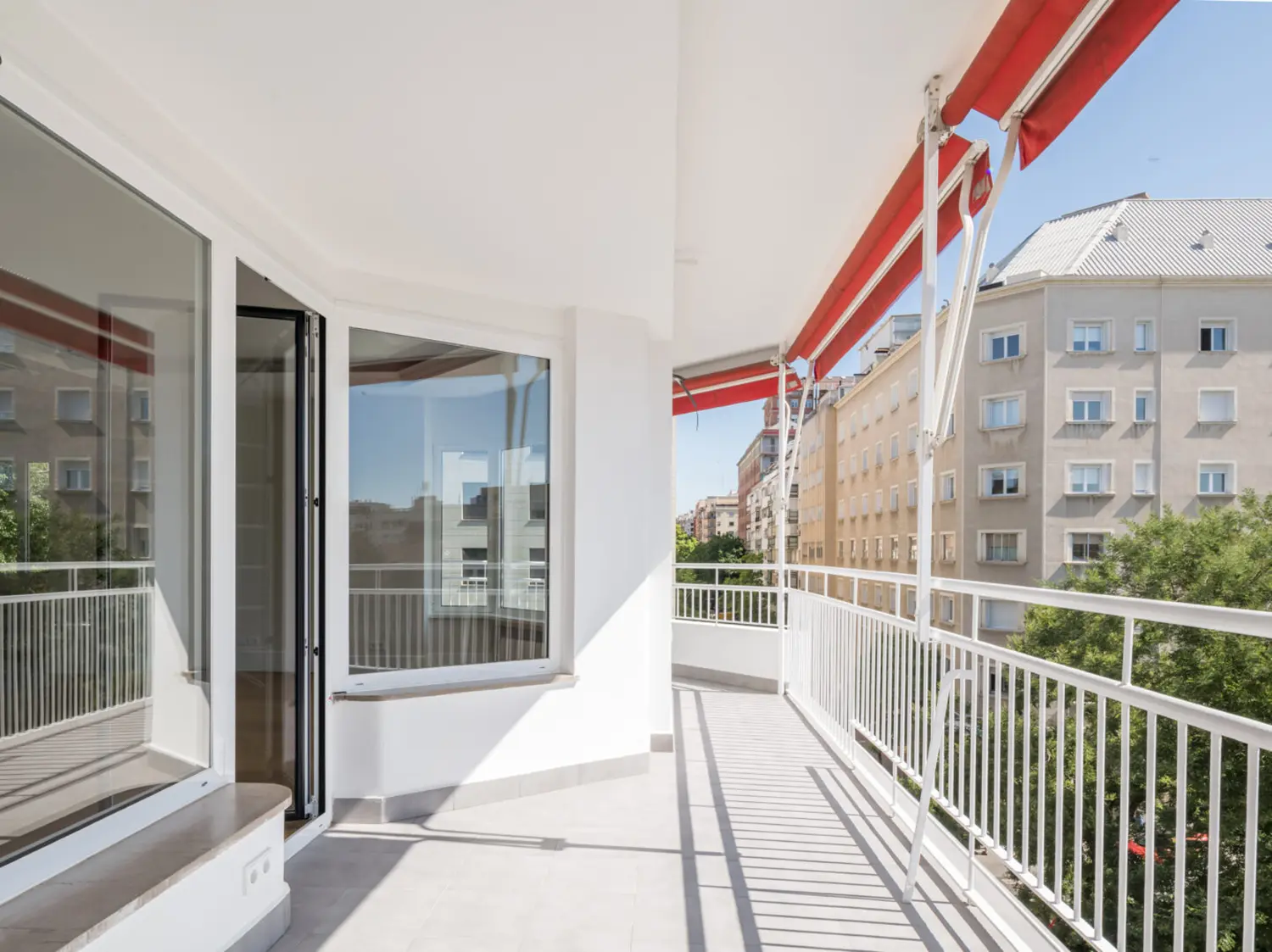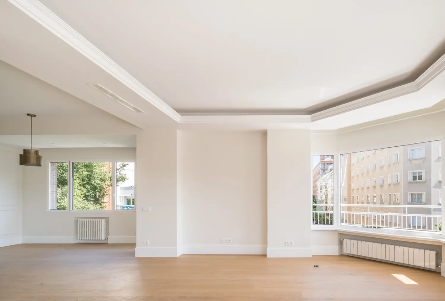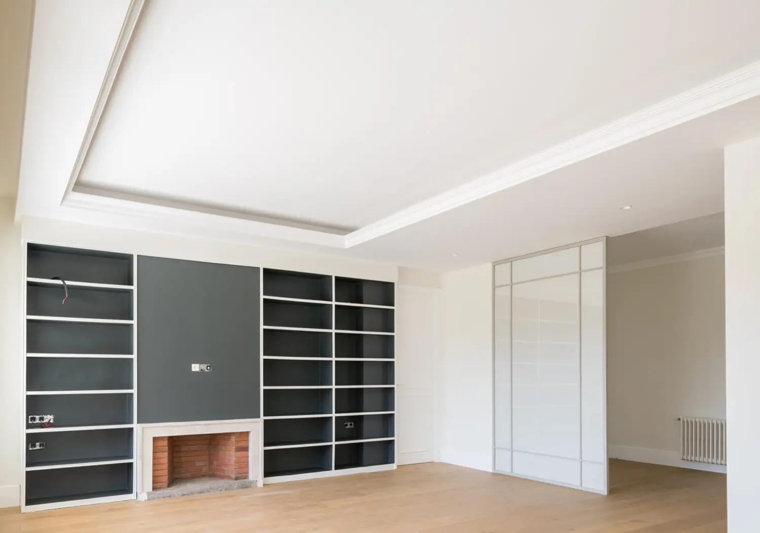 El amplio salón con chimenea y estantería a medida en el frente principal, tiene dos grandes ventanales y salida a una soleada terraza en esquina en pleno Barrio Salamanca de Madrid, lo que convierte a este espacio en el corazón de la vivienda. Además, está conectado espacialmente con el comedor, que disfruta de otro ventanal y otro acceso a la terraza. Desde el recibidor y desde el comedor se accede directamente al distribuidor, que tiene una pared completa de armarios a medida y acceso a la cocina, a un baño completo y a los dos dormitorios dobles. El dormitorio principal destaca por su frente de armarios a medida de lado a lado, que oculta dos puertas tras las cuales se esconden un vestidor por un lado, y el baño en suite por otro.