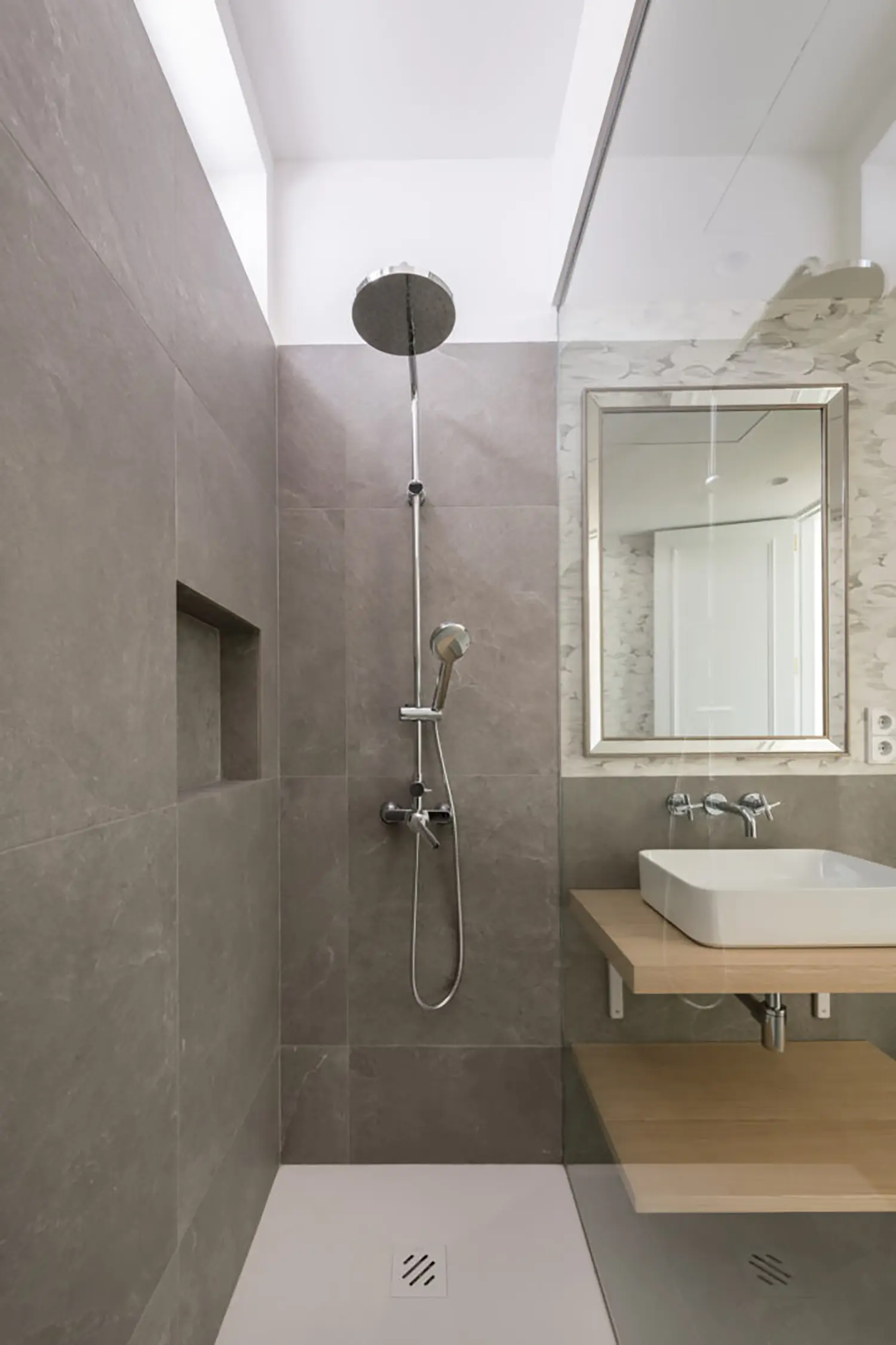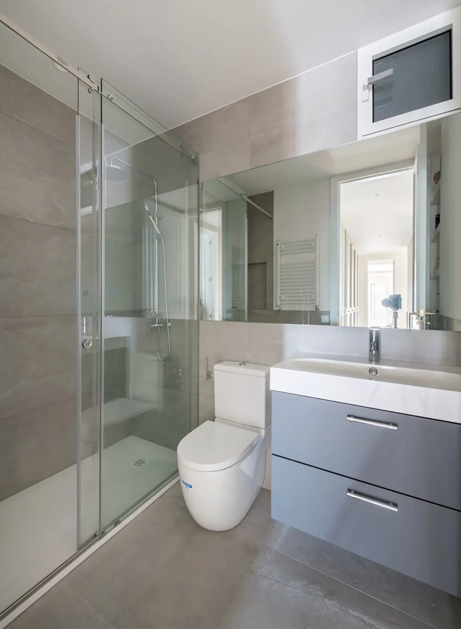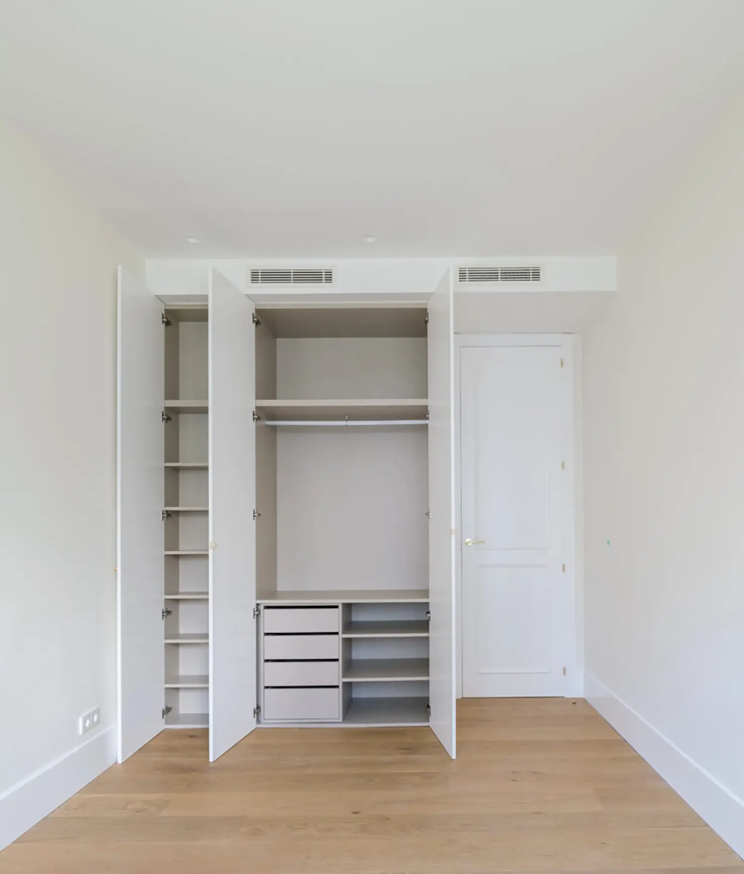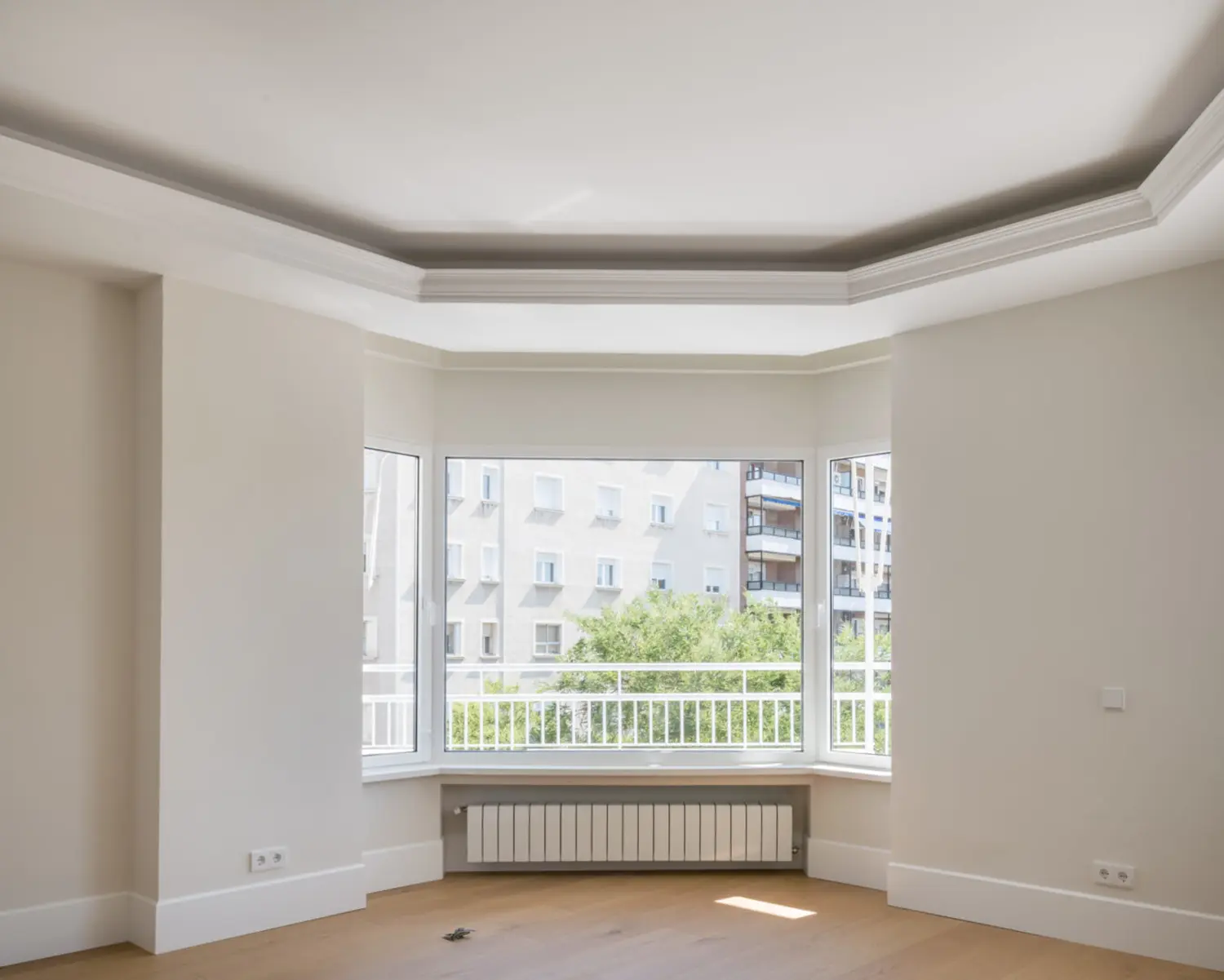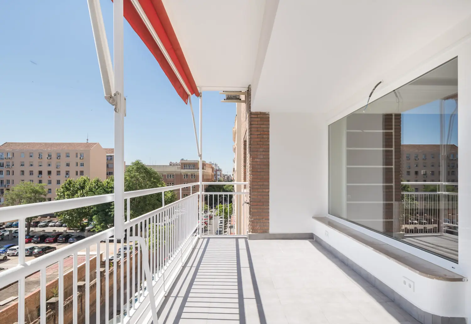 El amplio salón con chimenea y estantería a medida en el frente principal, tiene dos grandes ventanales y salida a una soleada terraza en esquina en pleno Barrio Salamanca de Madrid, lo que convierte a este espacio en el corazón de la vivienda. Además, está conectado espacialmente con el comedor, que disfruta de otro ventanal y otro acceso a la terraza. Desde el recibidor y desde el comedor se accede directamente al distribuidor, que tiene una pared completa de armarios a medida y acceso a la cocina, a un baño completo y a los dos dormitorios dobles. El dormitorio principal destaca por su frente de armarios a medida de lado a lado, que oculta dos puertas tras las cuales se esconden un vestidor por un lado, y el baño en suite por otro.