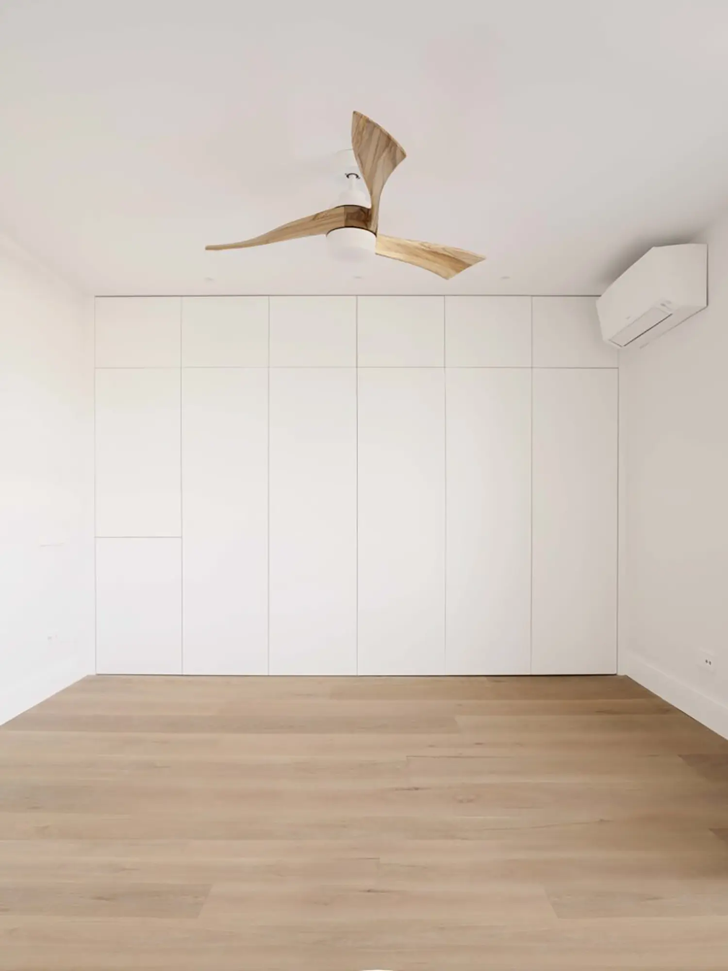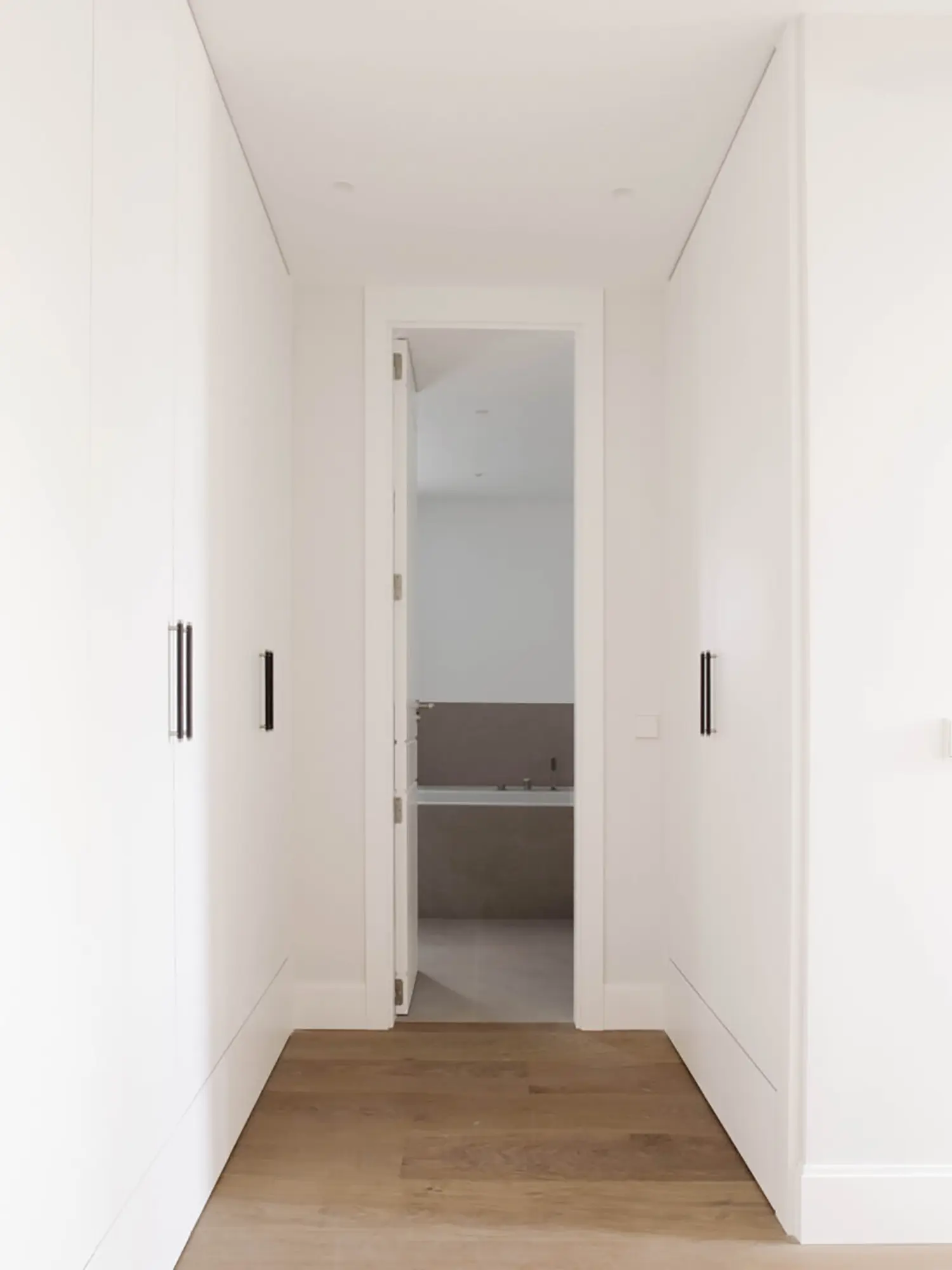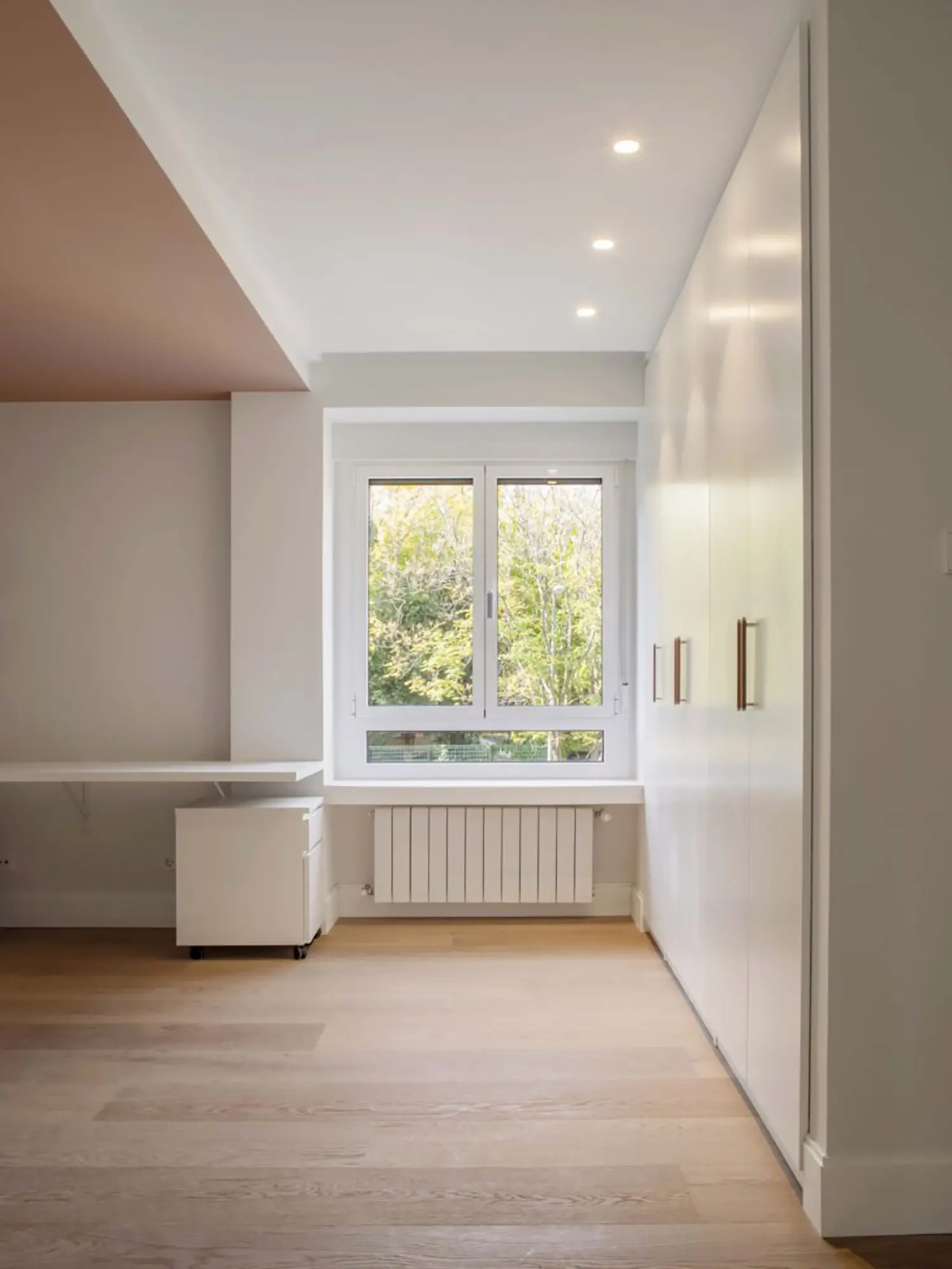 Previamente, la vivienda disponía de 3 dormitorios, uno de ellos en suite, más el de servicio también con su propio baño. En el proyecto, estos espacios se transforman dando lugar a grandes dormitorios y manteniendo el de servicio, que además se conecta directamente con la cocina dando mayores posibilidades de recorridos de uso. El dormitorio principal mantiene su baño doble y gana un gran vestidor además de comunicarse directamente con el despacho. El dormitorio infantil gana espacio de almacenaje y una zona de estar que puede utilizarse también para invitados, además de incluir su propio espacio de trabajo y su baño en suite.