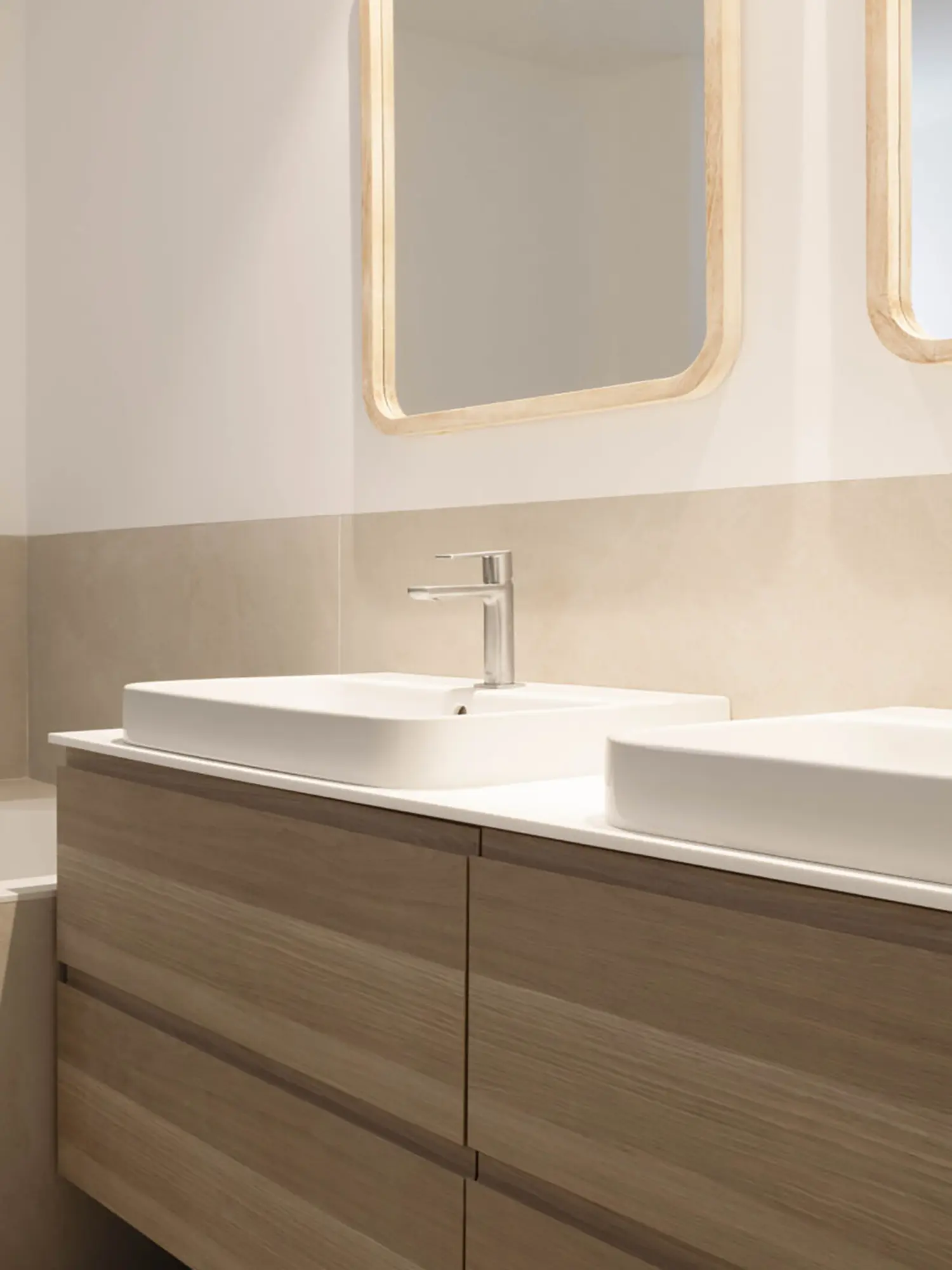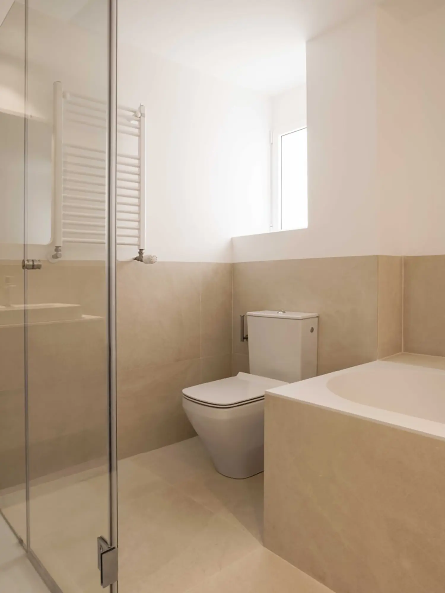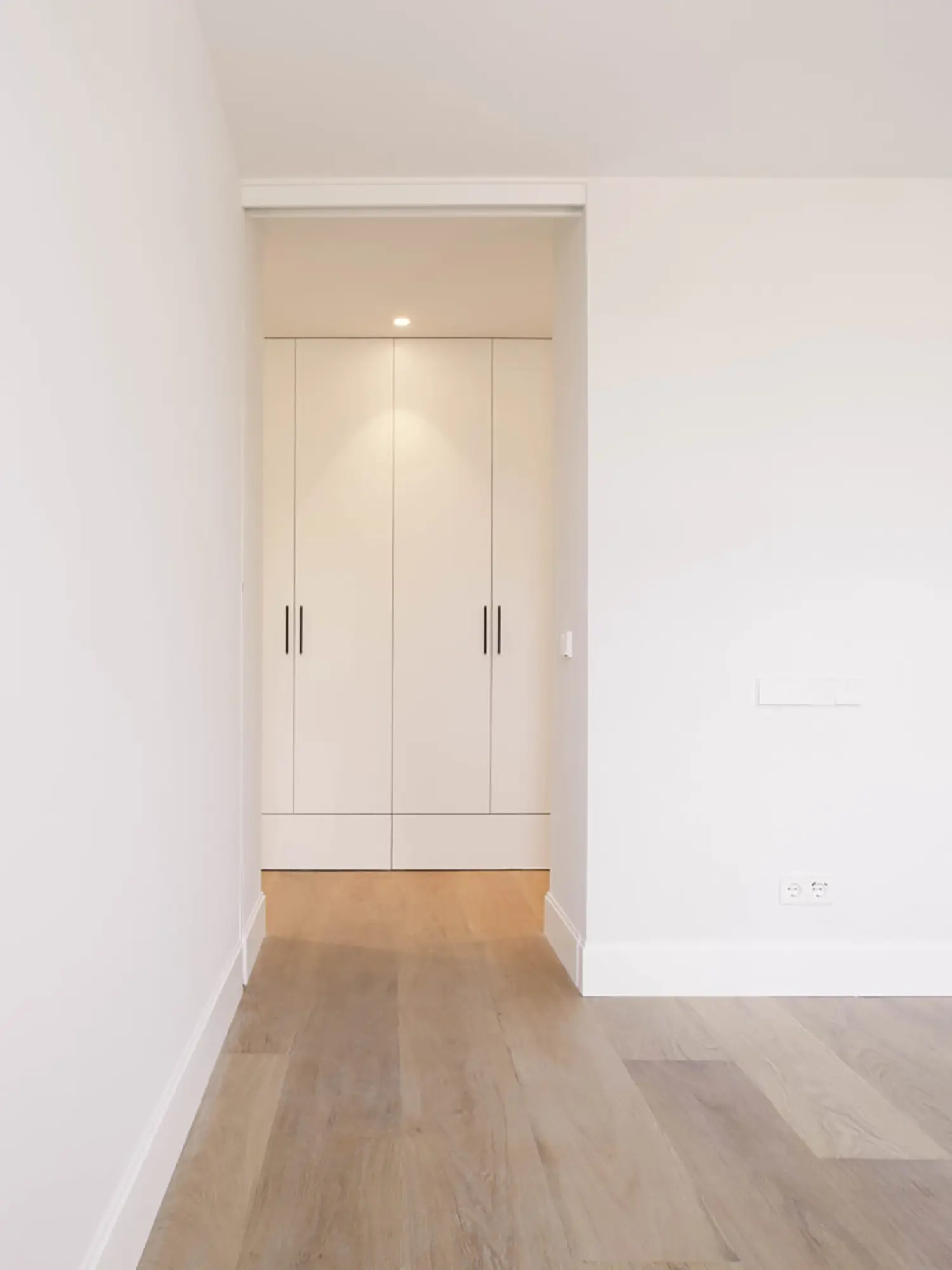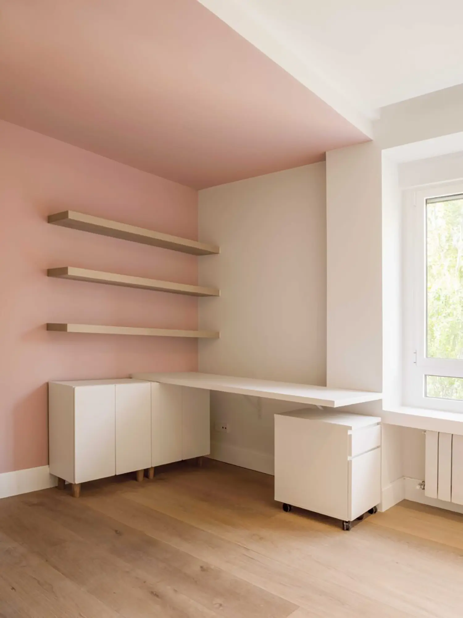 Previamente, la vivienda disponía de 3 dormitorios, uno de ellos en suite, más el de servicio también con su propio baño. En el proyecto, estos espacios se transforman dando lugar a grandes dormitorios y manteniendo el de servicio, que además se conecta directamente con la cocina dando mayores posibilidades de recorridos de uso. El dormitorio principal mantiene su baño doble y gana un gran vestidor además de comunicarse directamente con el despacho. El dormitorio infantil gana espacio de almacenaje y una zona de estar que puede utilizarse también para invitados, además de incluir su propio espacio de trabajo y su baño en suite.