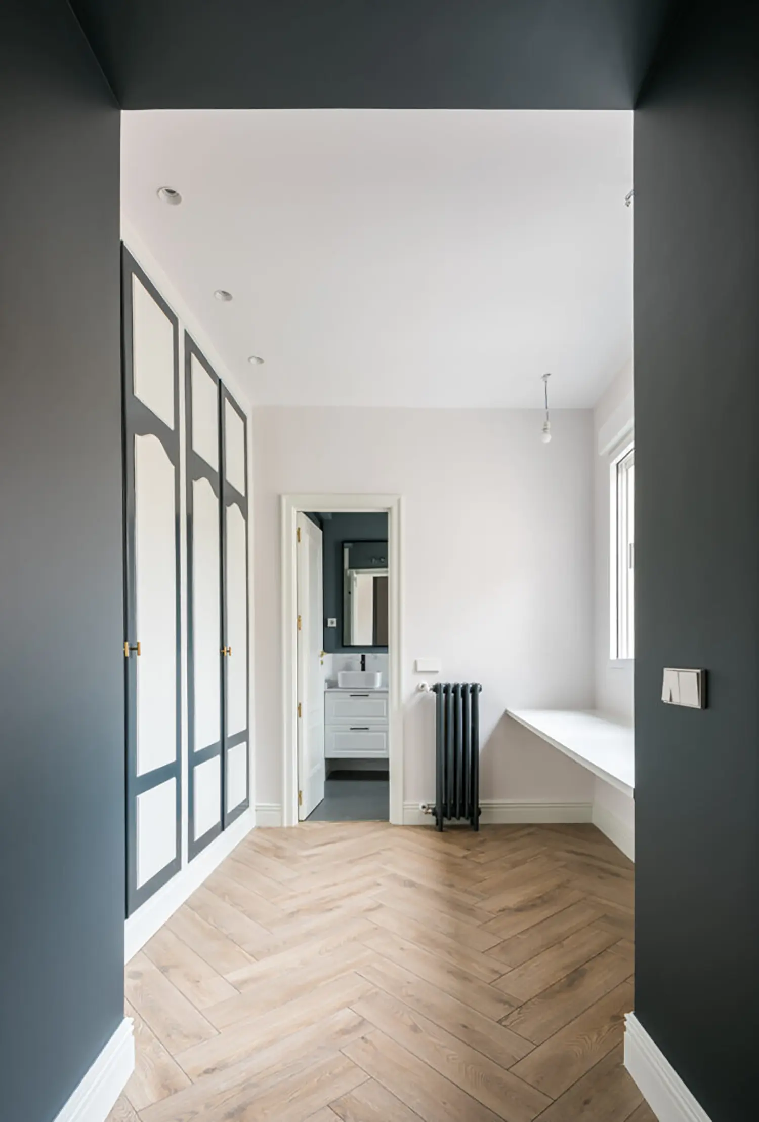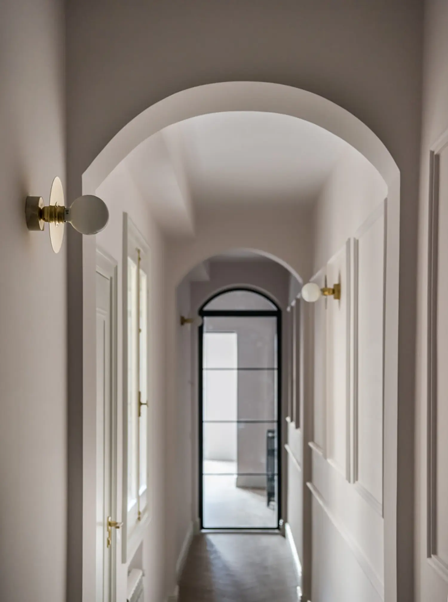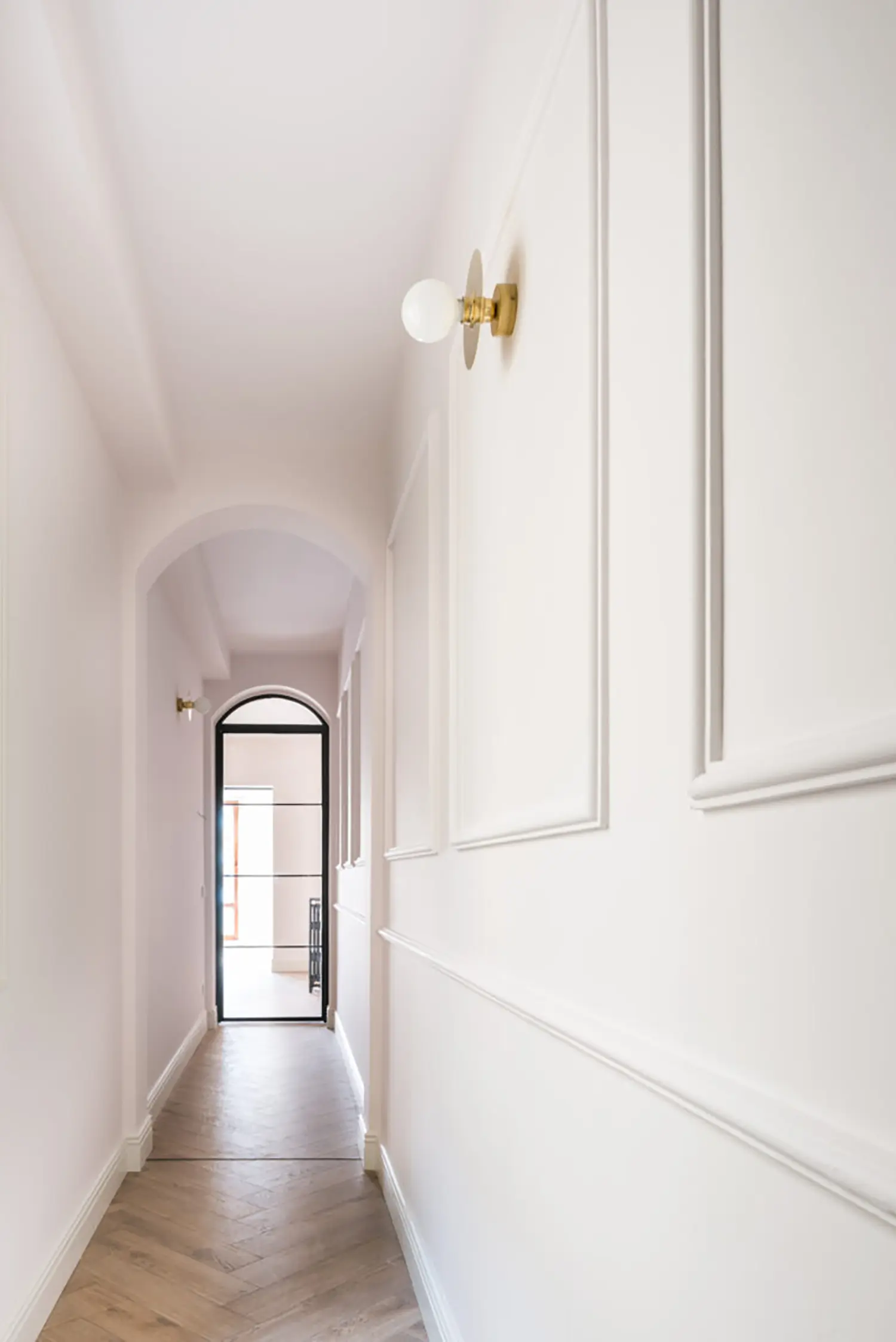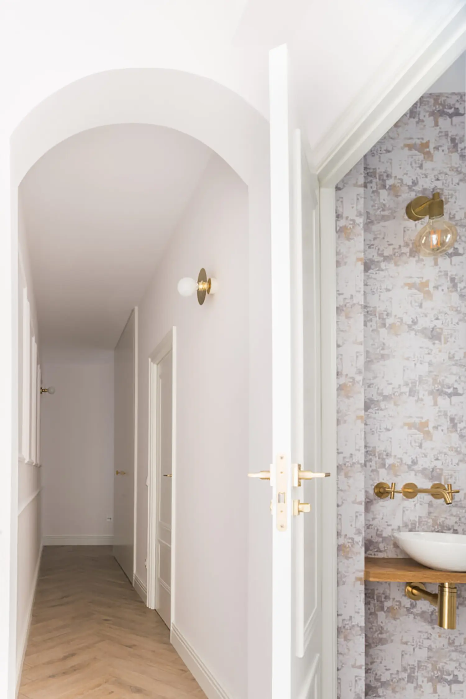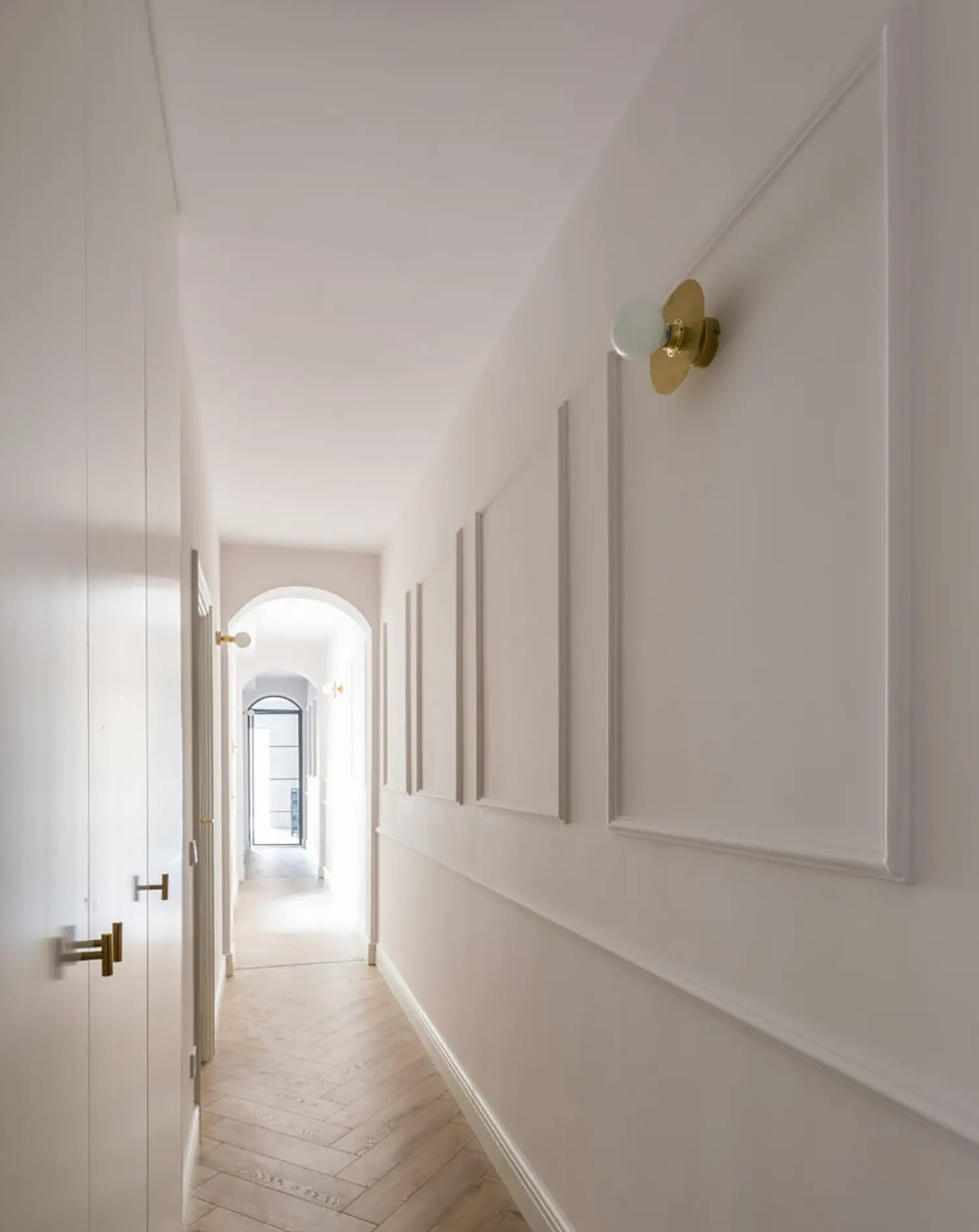 Desde esta zona, y a través de otra puerta acristalada, comienza el largo pasillo que lleva a la zona de noche. Sin embargo, se convierte en un lugar agradable gracias al ritmo conseguido a través de varios elementos: arcos marcando la estructura que dividen en tres tramos el recorrido, diseño de baquetones en una de las paredes, apliques alternados en ambos lados del pasillo… Además, obtiene luz natural desde una ventana al patio del edificio y desde la puerta acristalada que lo conecta con los balcones.
