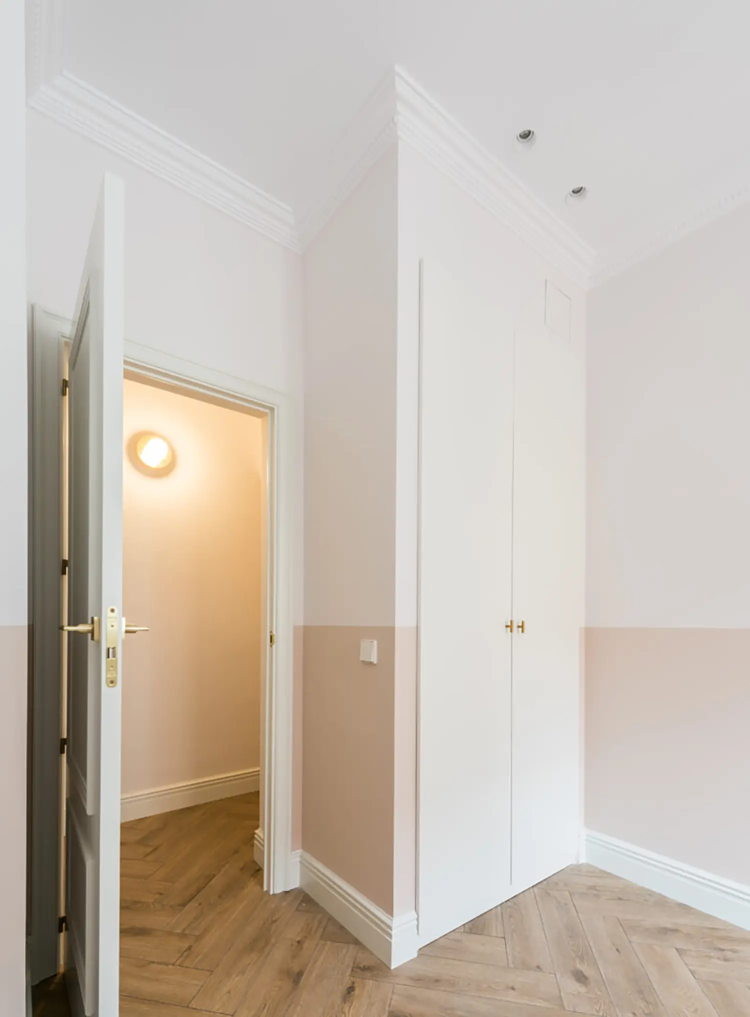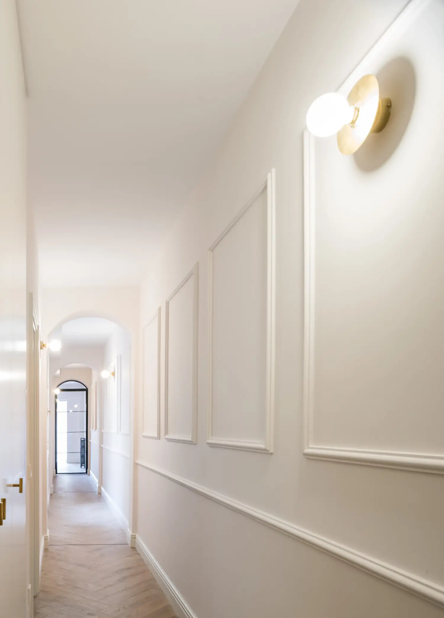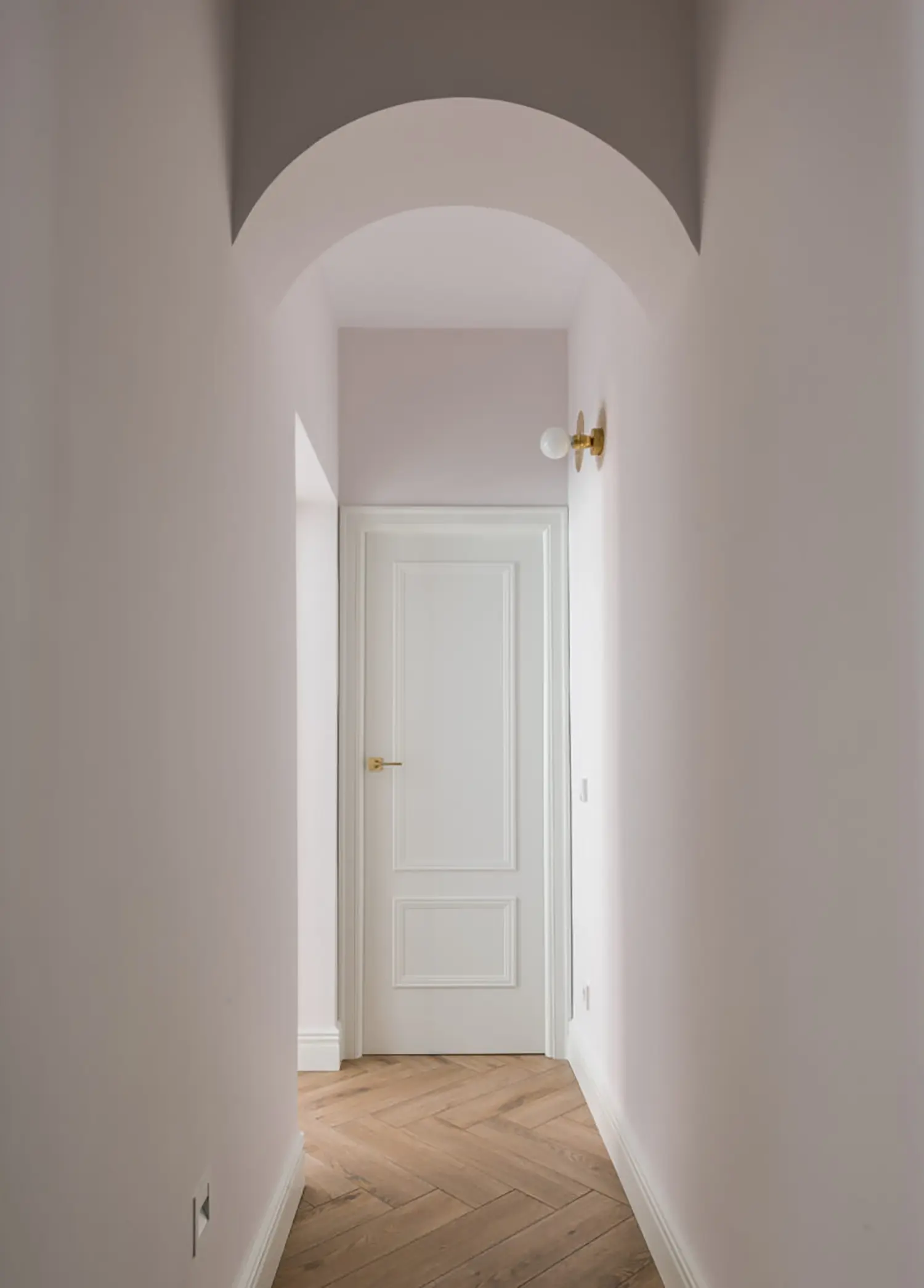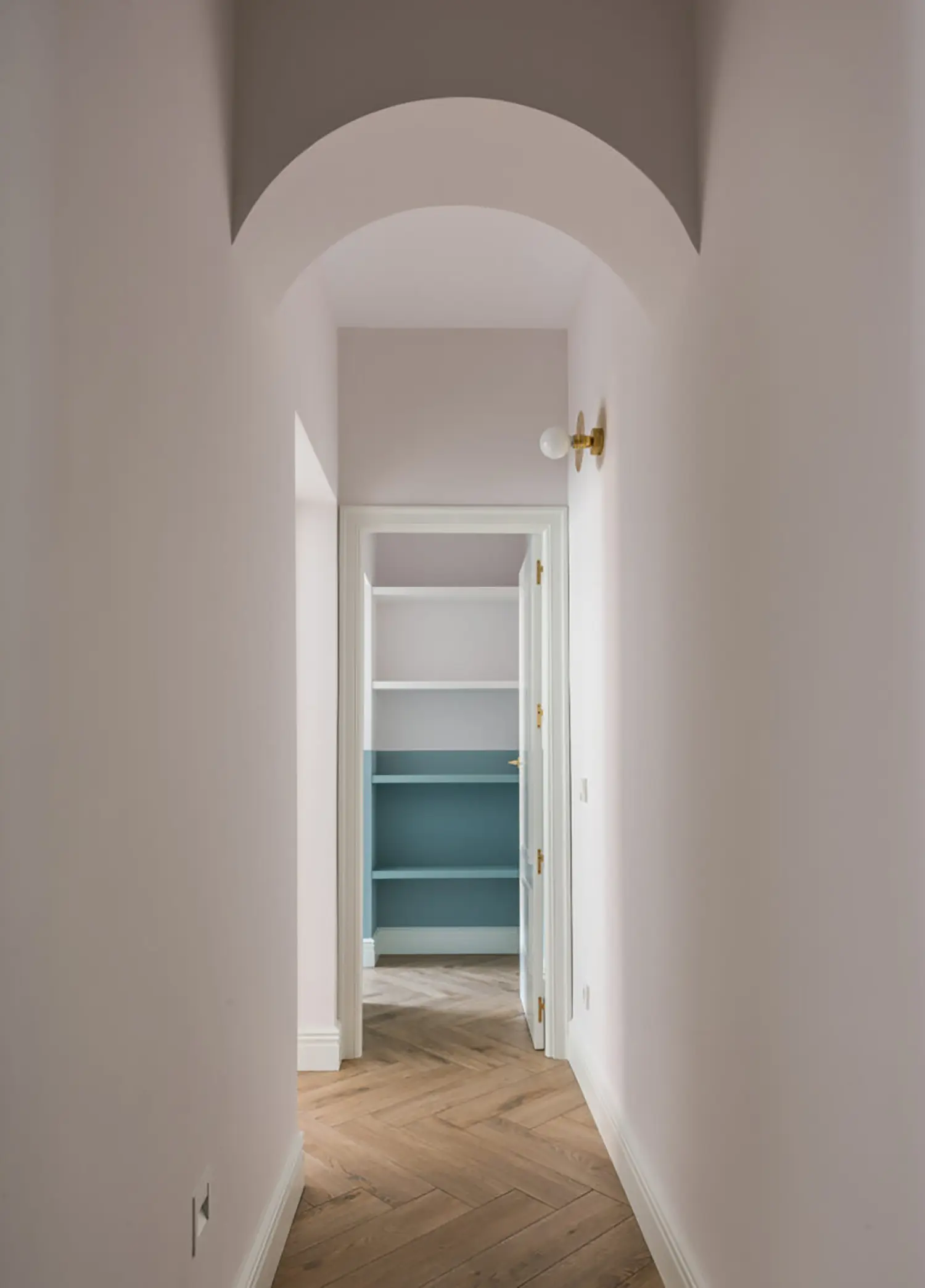Desde esta zona, y a través de otra puerta acristalada, comienza el largo pasillo que lleva a la zona de noche. Sin embargo, se convierte en un lugar agradable gracias al ritmo conseguido a través de varios elementos: arcos marcando la estructura que dividen en tres tramos el recorrido, diseño de baquetones en una de las paredes, apliques alternados en ambos lados del pasillo… Además, obtiene luz natural desde una ventana al patio del edificio y desde la puerta acristalada que lo conecta con los balcones.