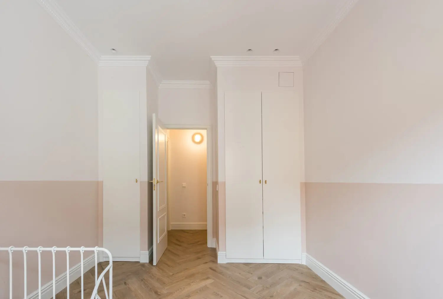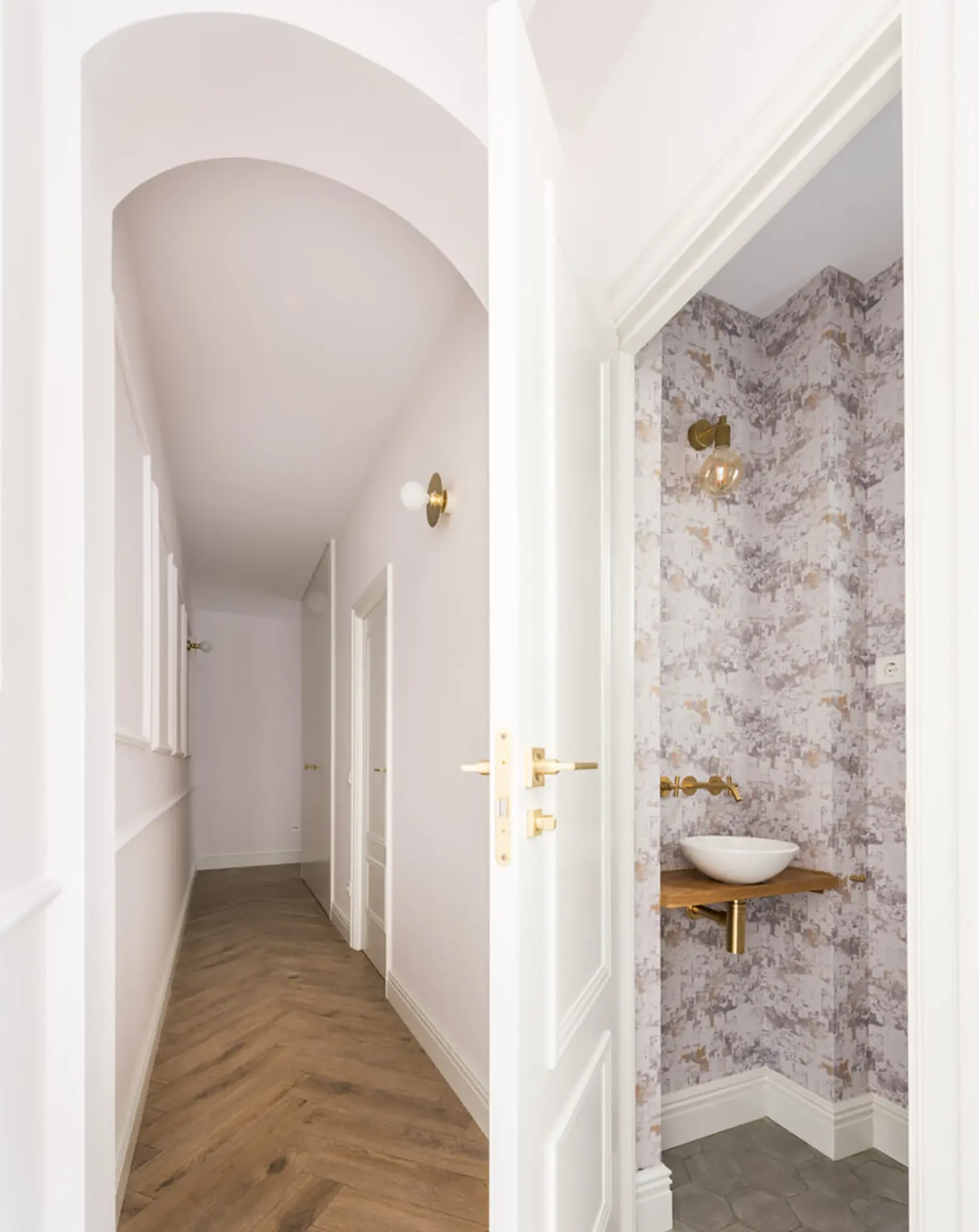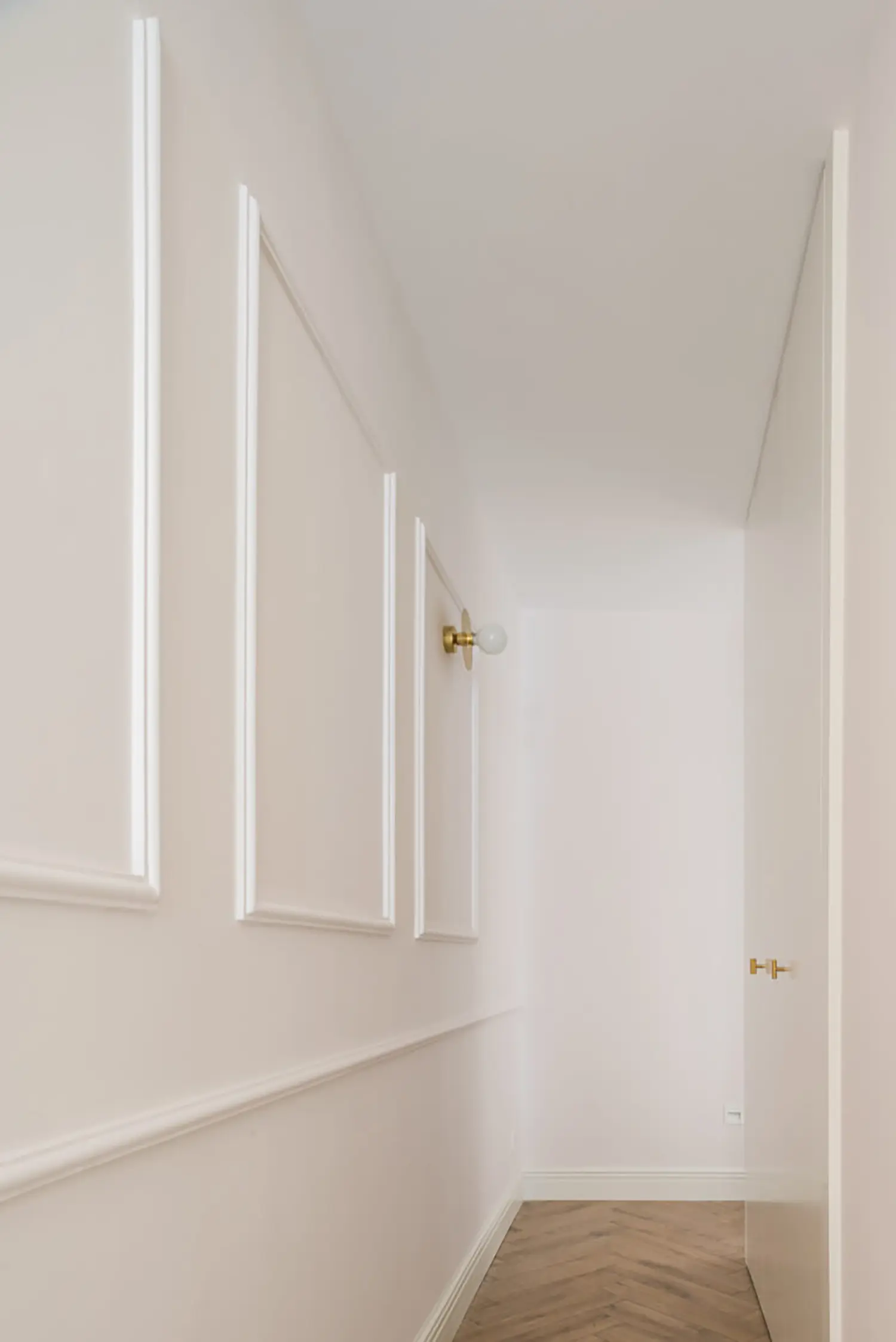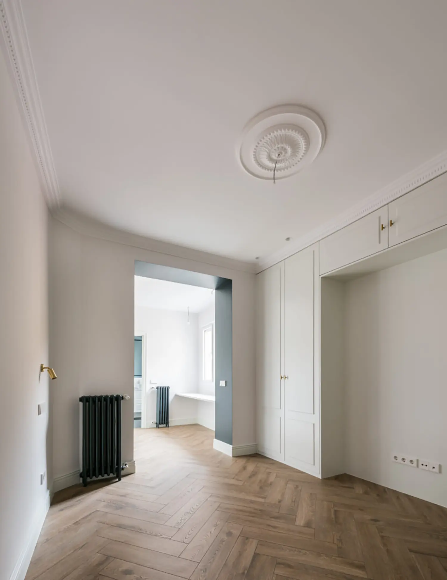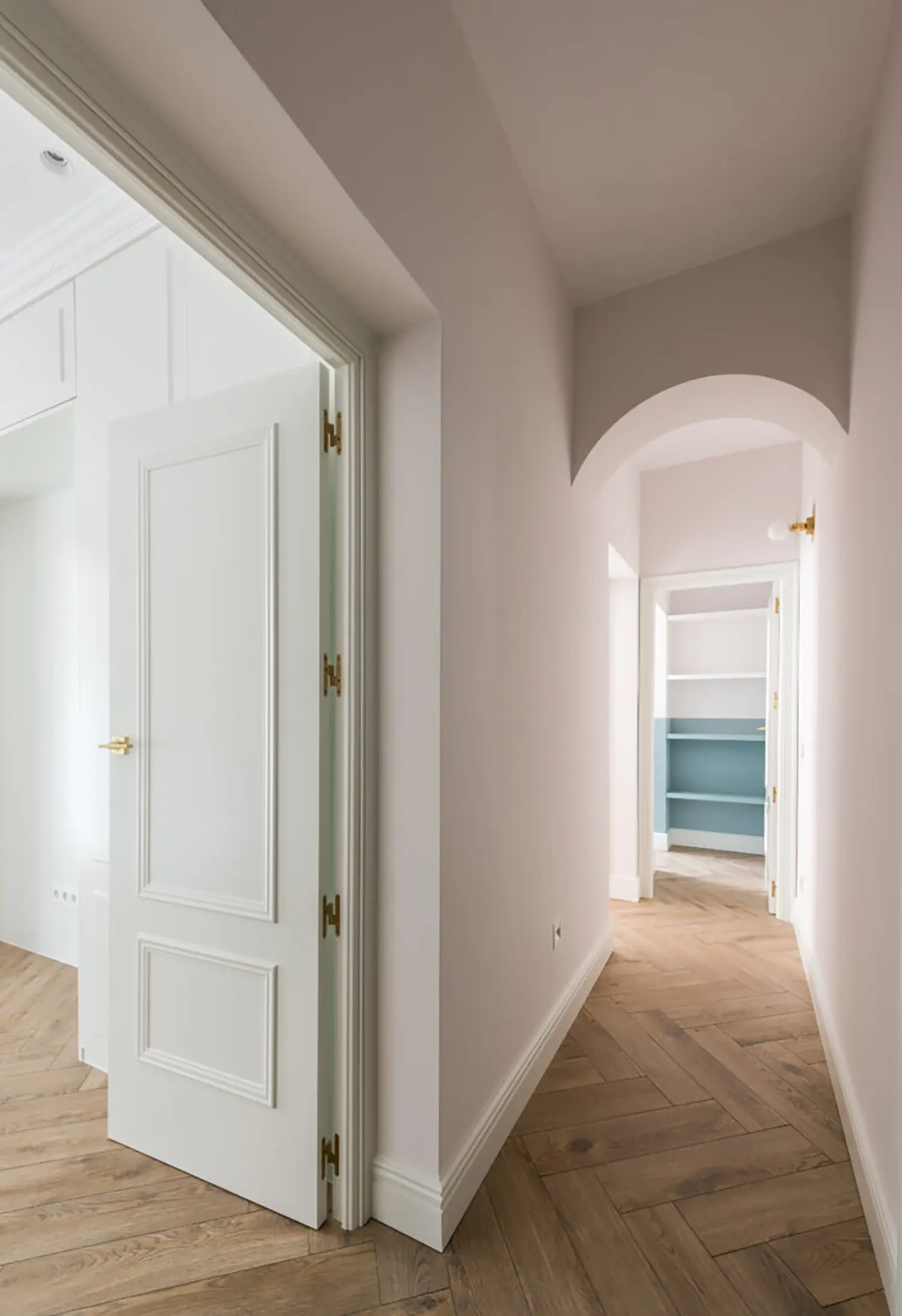 Desde esta zona, y a través de otra puerta acristalada, comienza el largo pasillo que lleva a la zona de noche. Sin embargo, se convierte en un lugar agradable gracias al ritmo conseguido a través de varios elementos: arcos marcando la estructura que dividen en tres tramos el recorrido, diseño de baquetones en una de las paredes, apliques alternados en ambos lados del pasillo… Además, obtiene luz natural desde una ventana al patio del edificio y desde la puerta acristalada que lo conecta con los balcones.