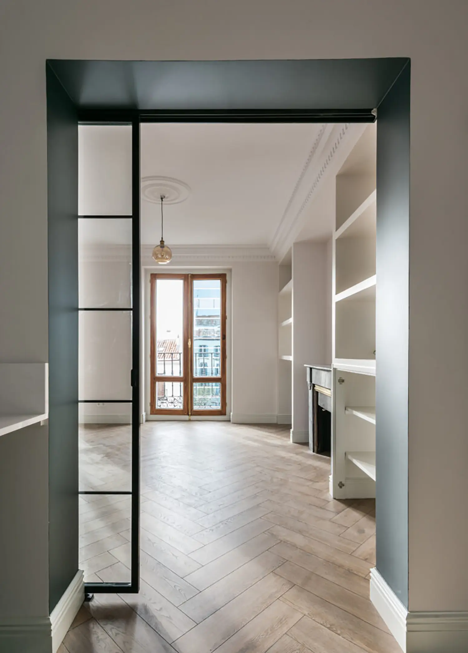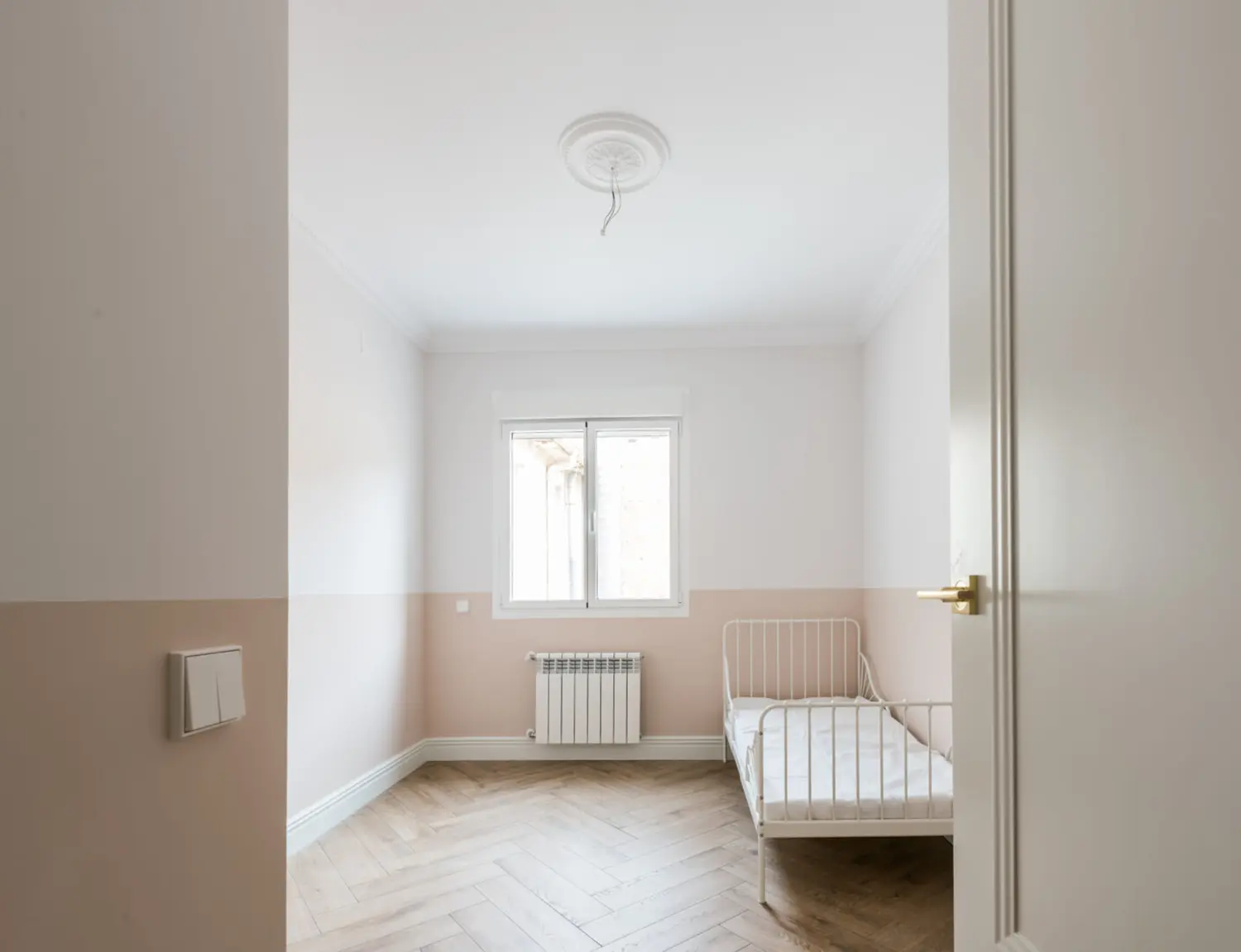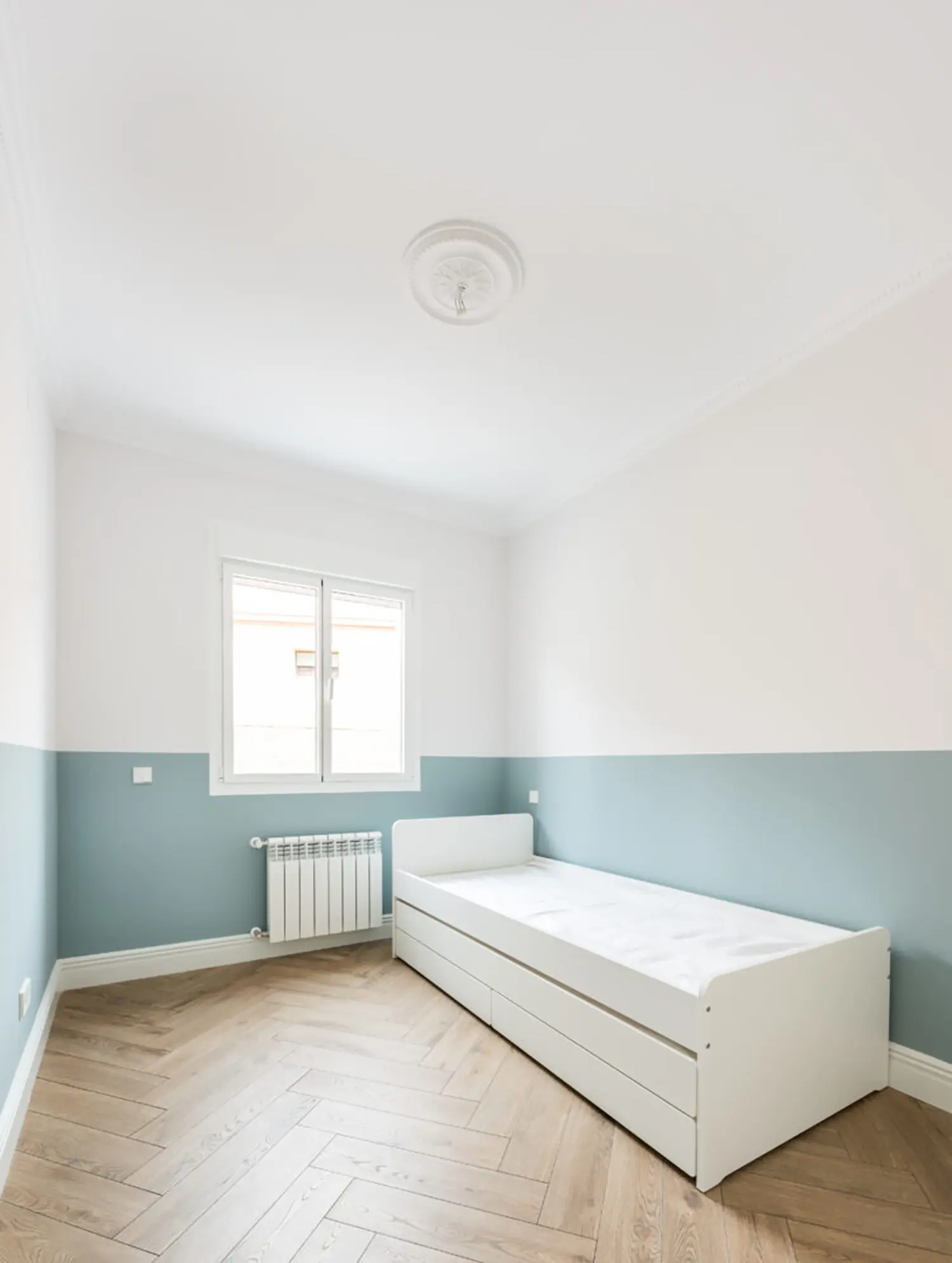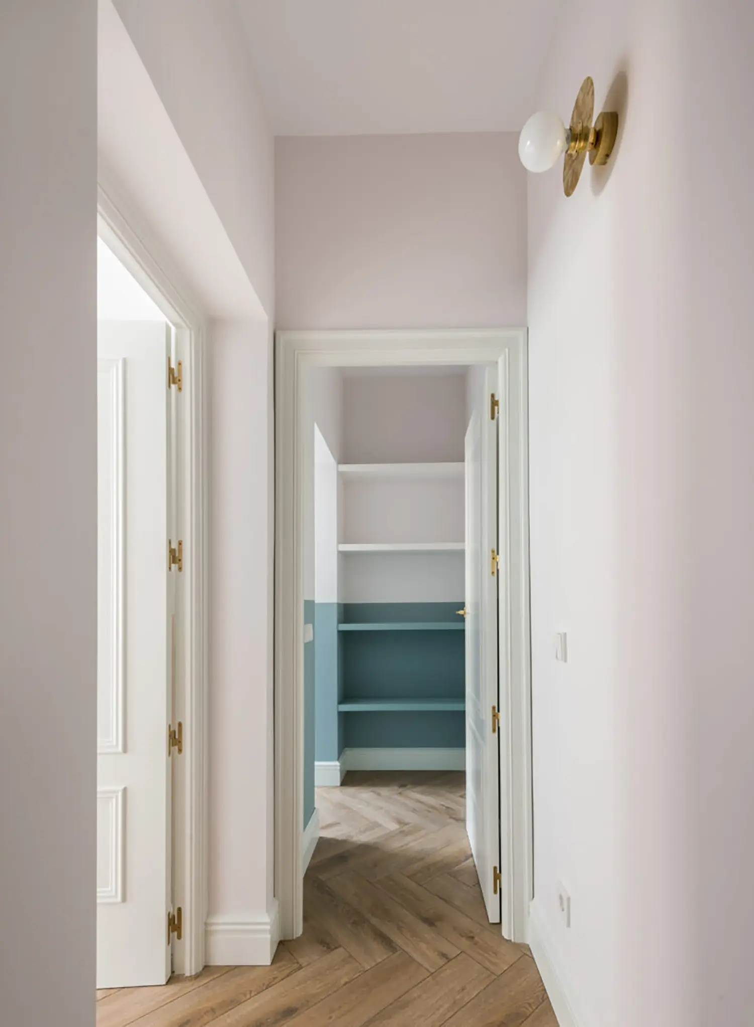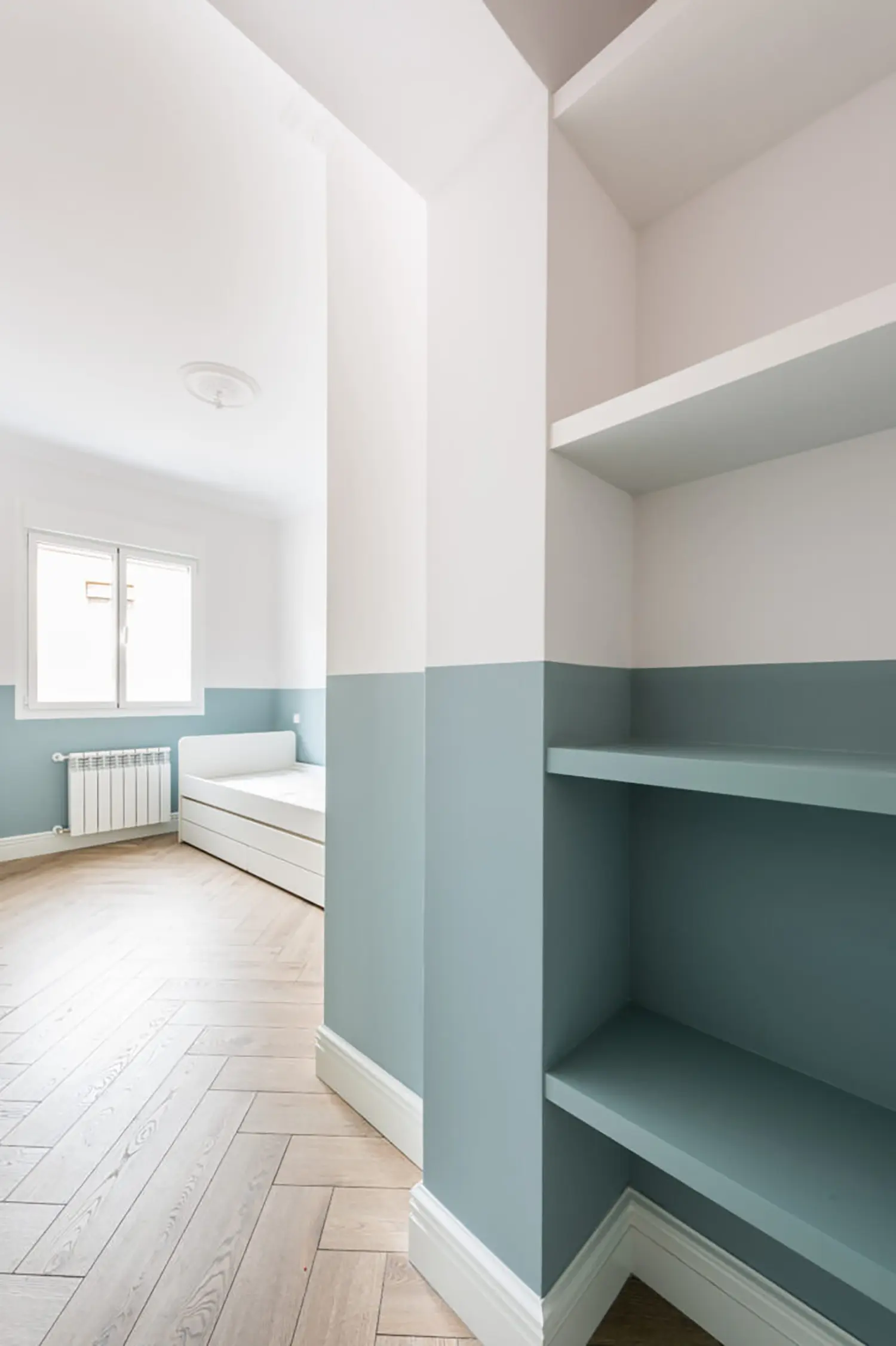 Desde esta zona, y a través de otra puerta acristalada, comienza el largo pasillo que lleva a la zona de noche. Sin embargo, se convierte en un lugar agradable gracias al ritmo conseguido a través de varios elementos: arcos marcando la estructura que dividen en tres tramos el recorrido, diseño de baquetones en una de las paredes, apliques alternados en ambos lados del pasillo… Además, obtiene luz natural desde una ventana al patio del edificio y desde la puerta acristalada que lo conecta con los balcones.