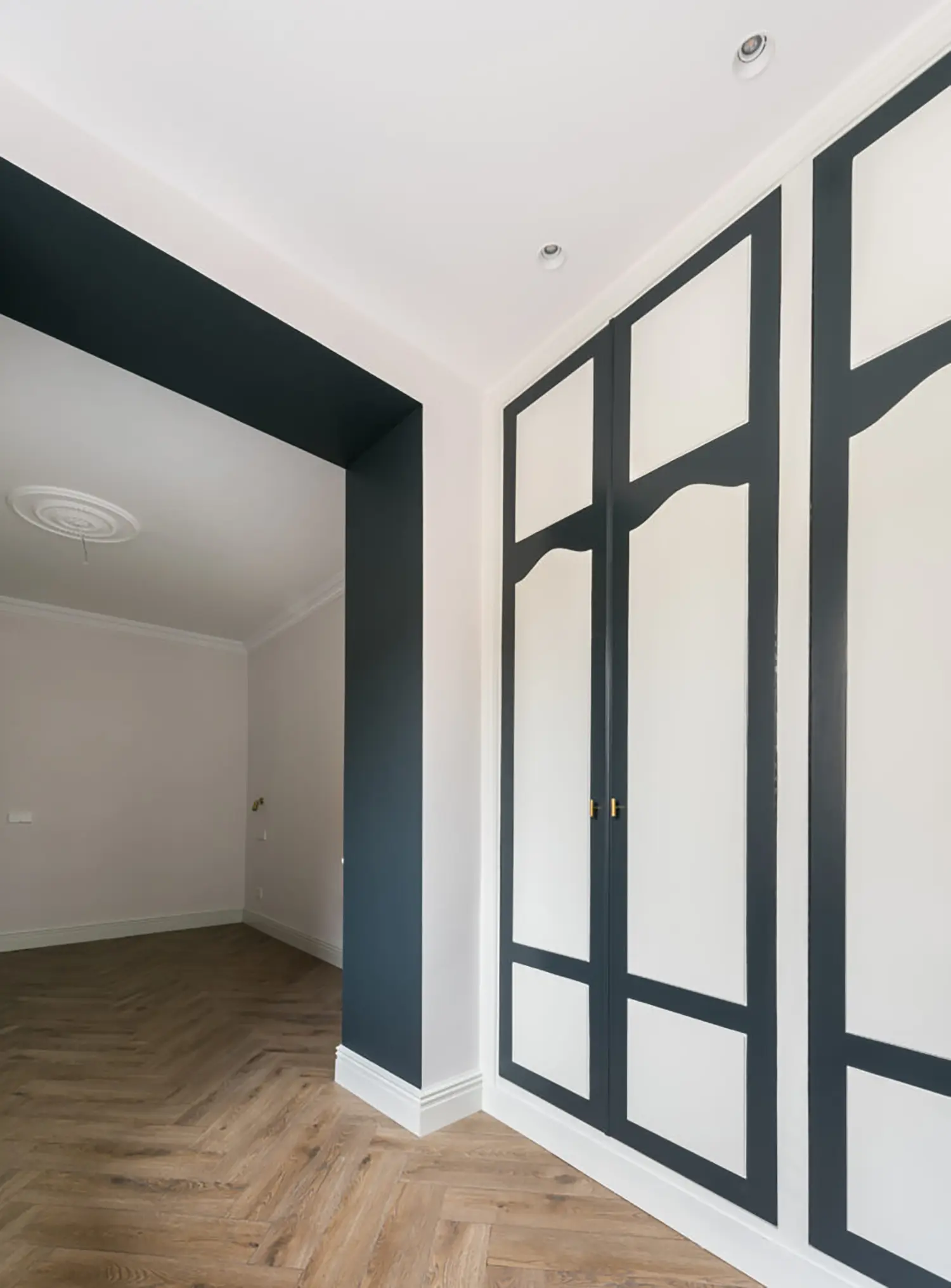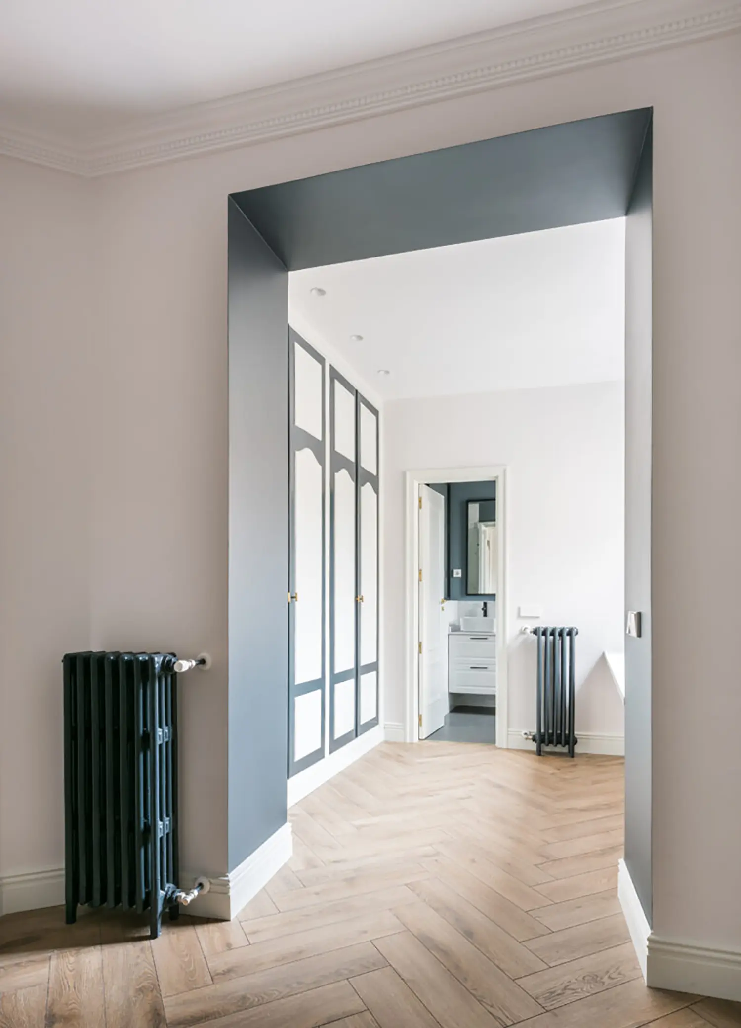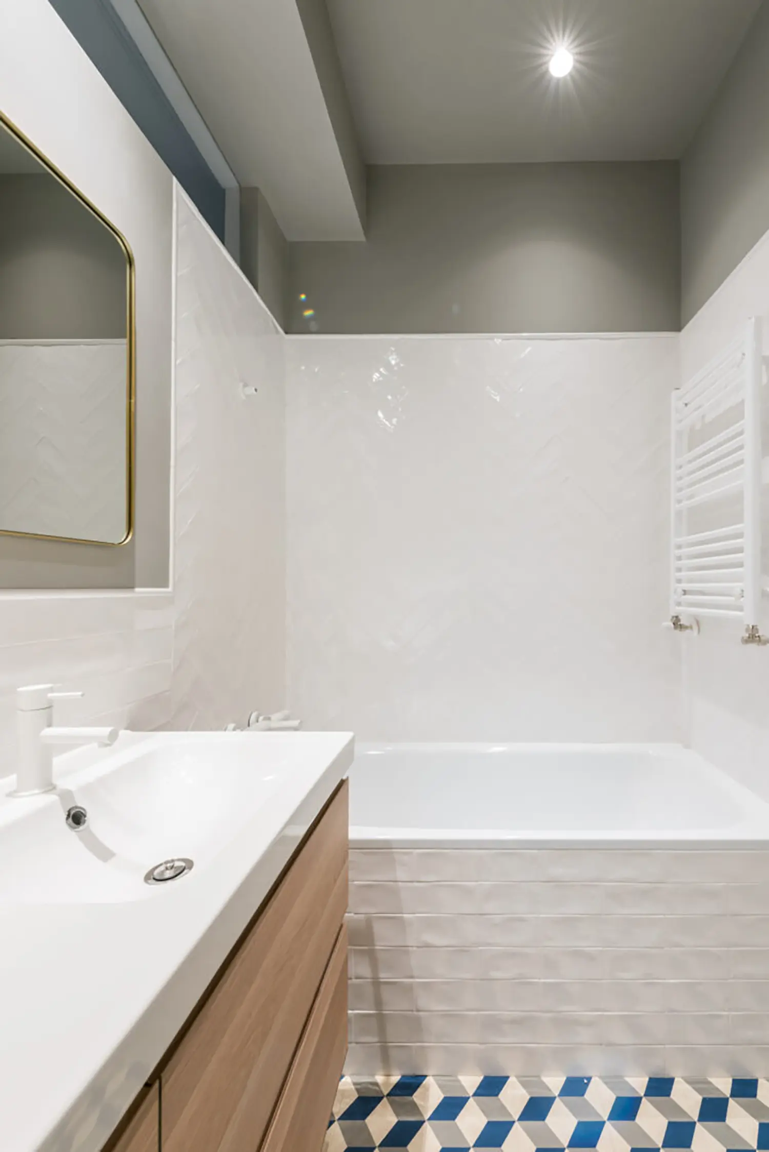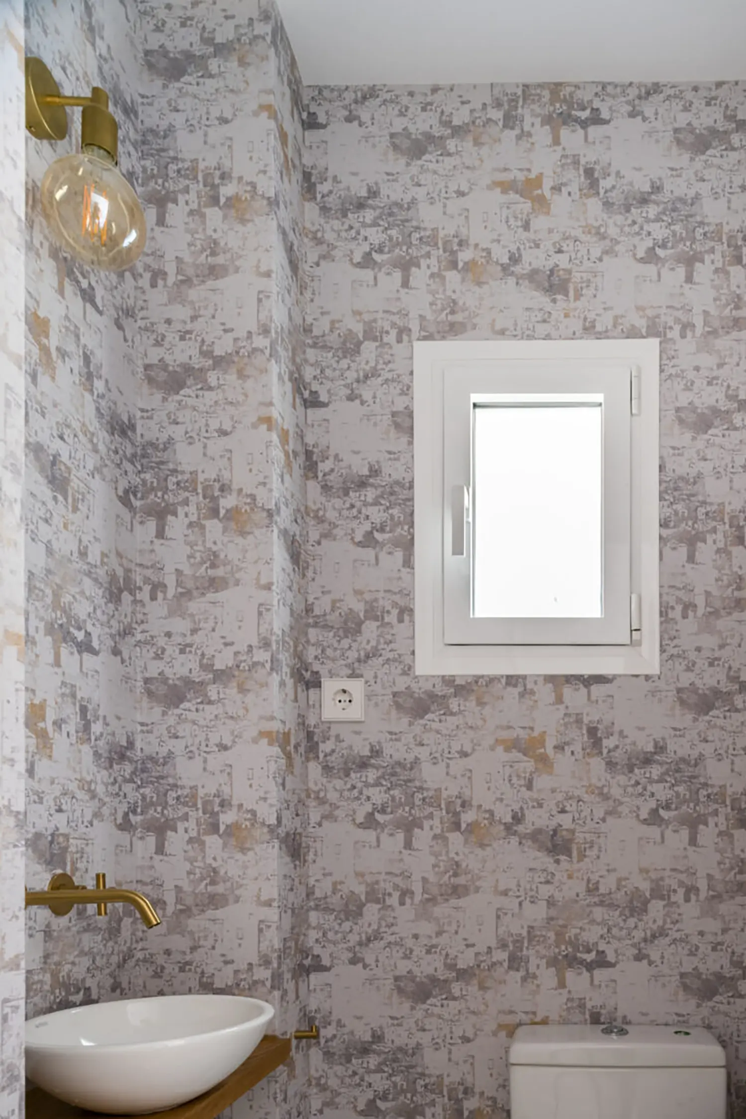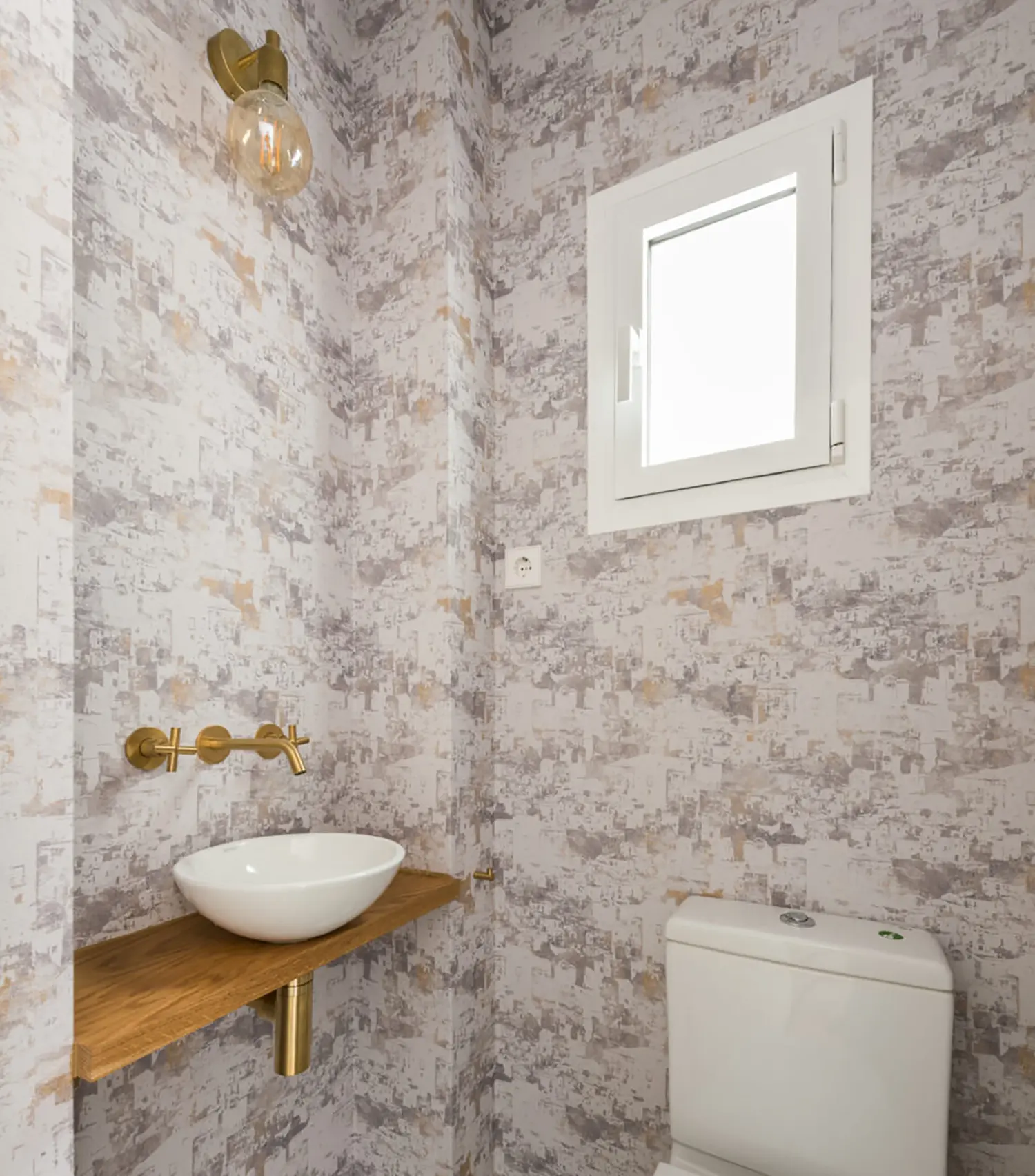 Desde esta zona, y a través de otra puerta acristalada, comienza el largo pasillo que lleva a la zona de noche. Sin embargo, se convierte en un lugar agradable gracias al ritmo conseguido a través de varios elementos: arcos marcando la estructura que dividen en tres tramos el recorrido, diseño de baquetones en una de las paredes, apliques alternados en ambos lados del pasillo… Además, obtiene luz natural desde una ventana al patio del edificio y desde la puerta acristalada que lo conecta con los balcones.