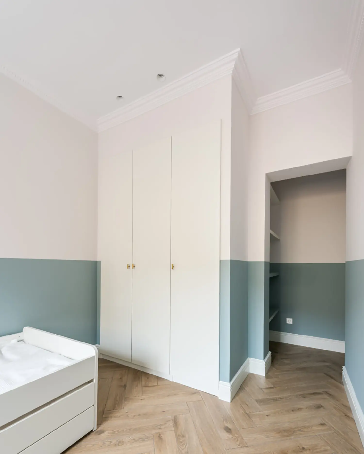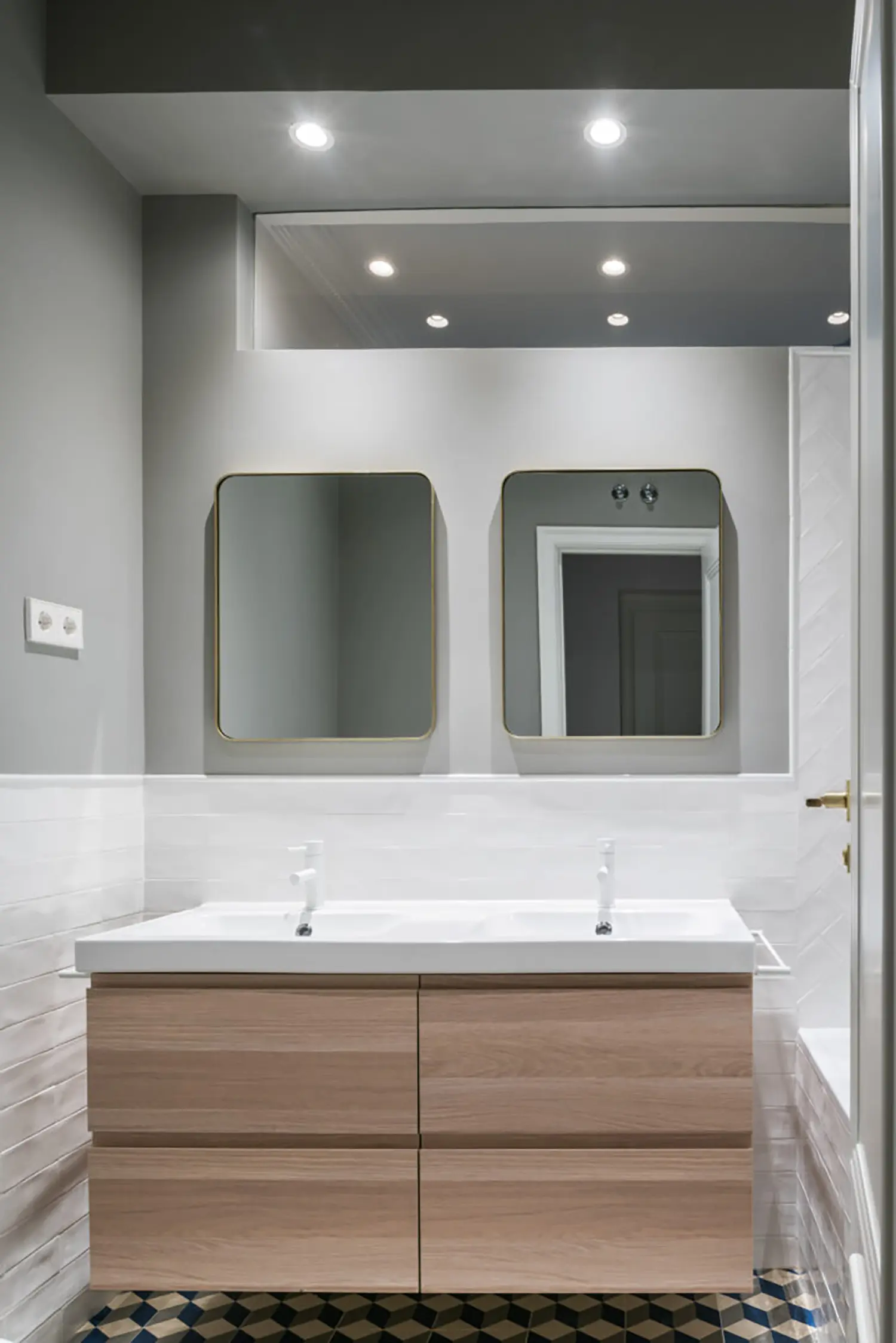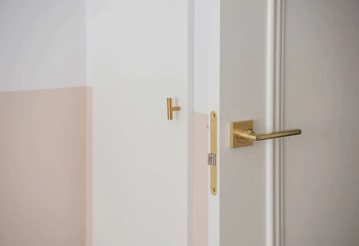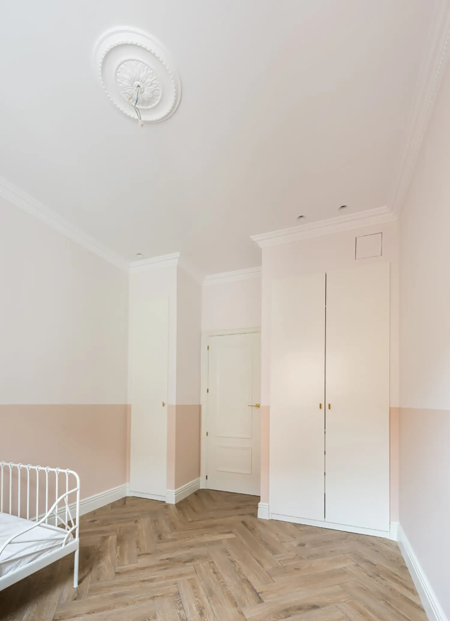 Desde esta zona, y a través de otra puerta acristalada, comienza el largo pasillo que lleva a la zona de noche. Sin embargo, se convierte en un lugar agradable gracias al ritmo conseguido a través de varios elementos: arcos marcando la estructura que dividen en tres tramos el recorrido, diseño de baquetones en una de las paredes, apliques alternados en ambos lados del pasillo… Además, obtiene luz natural desde una ventana al patio del edificio y desde la puerta acristalada que lo conecta con los balcones.