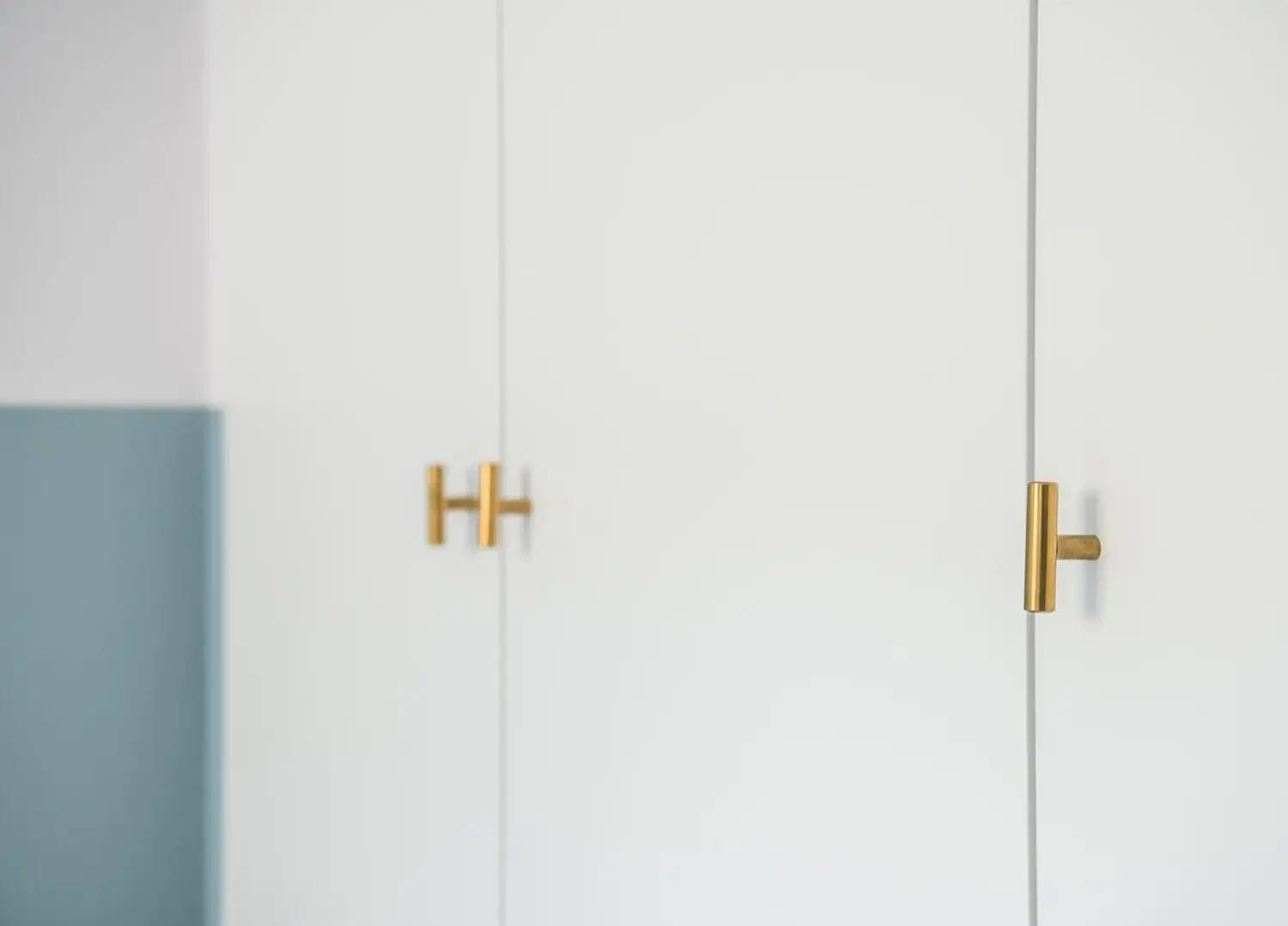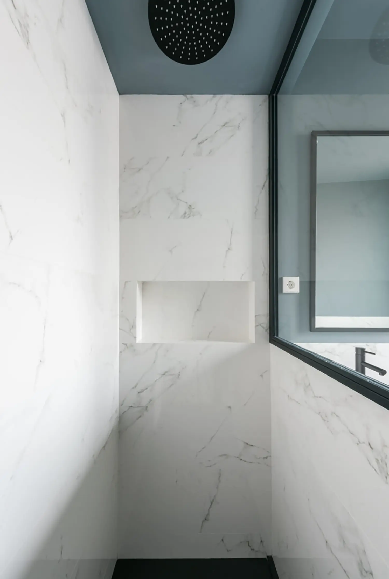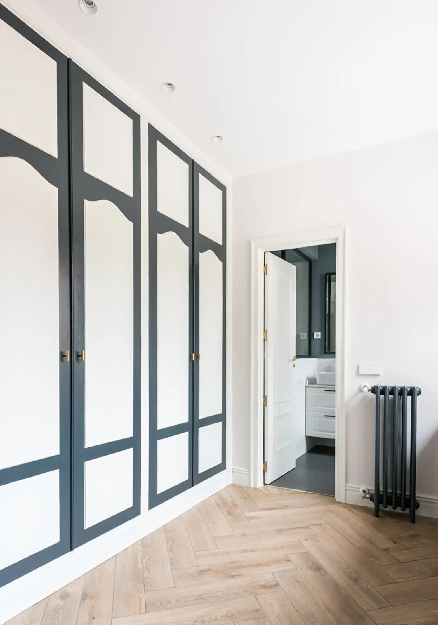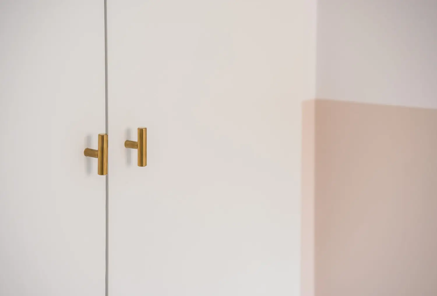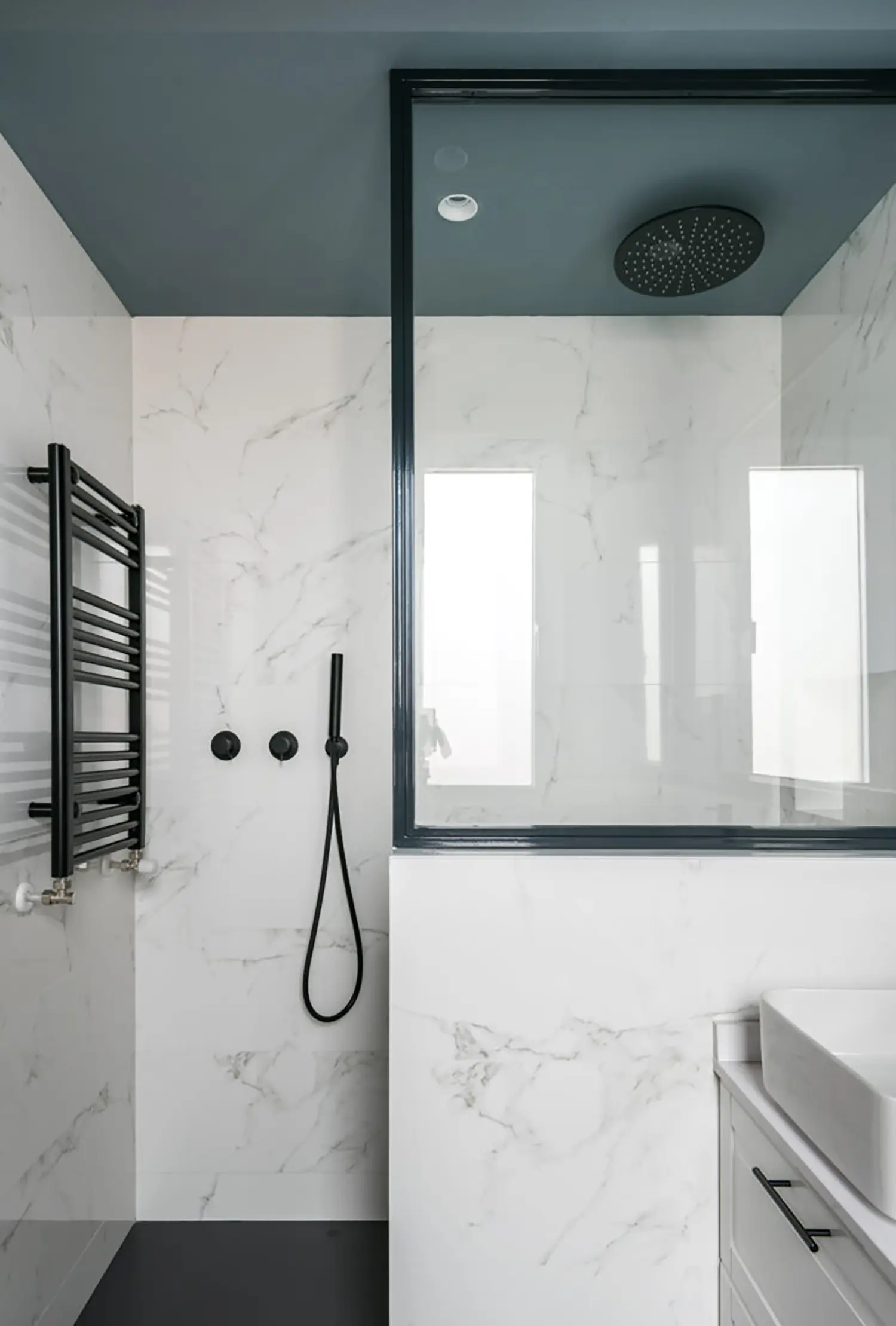 Desde esta zona, y a través de otra puerta acristalada, comienza el largo pasillo que lleva a la zona de noche. Sin embargo, se convierte en un lugar agradable gracias al ritmo conseguido a través de varios elementos: arcos marcando la estructura que dividen en tres tramos el recorrido, diseño de baquetones en una de las paredes, apliques alternados en ambos lados del pasillo… Además, obtiene luz natural desde una ventana al patio del edificio y desde la puerta acristalada que lo conecta con los balcones.