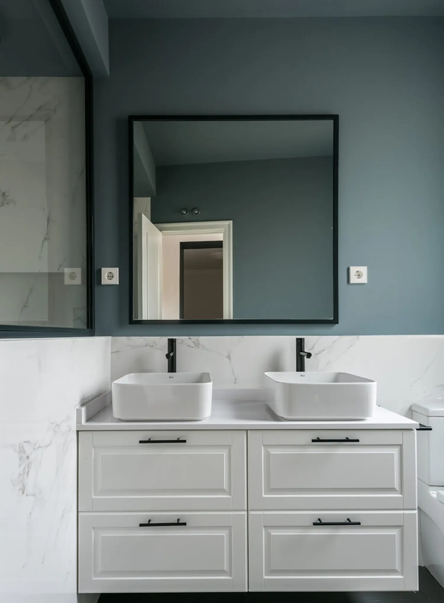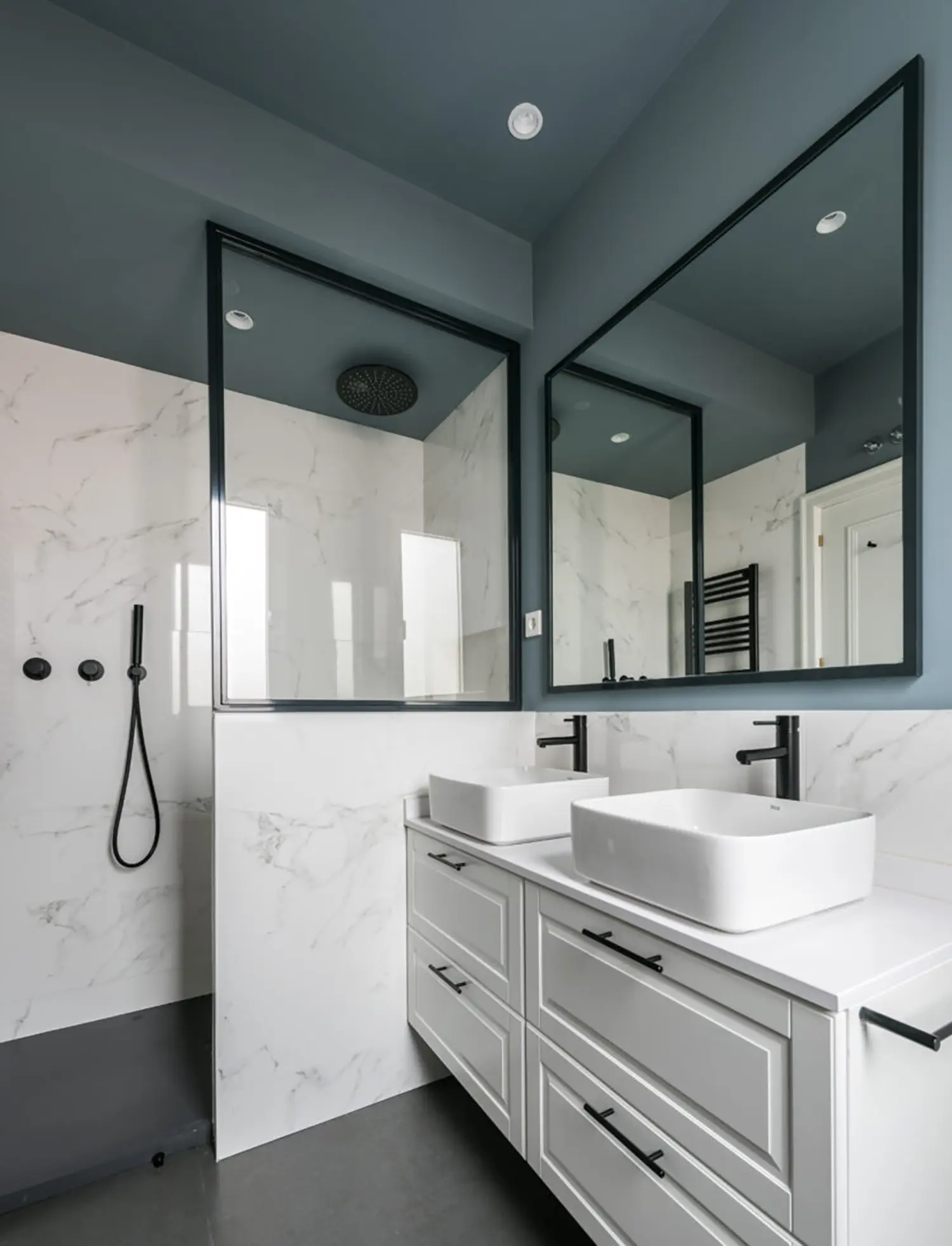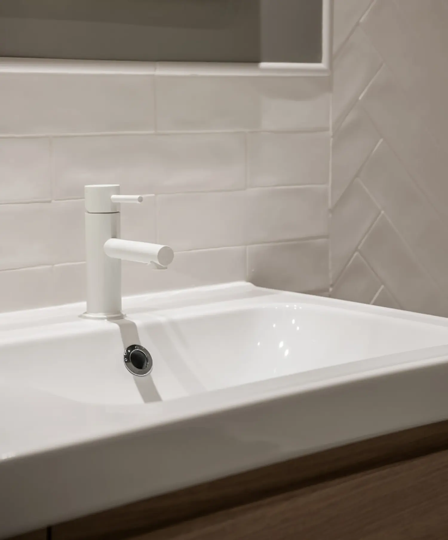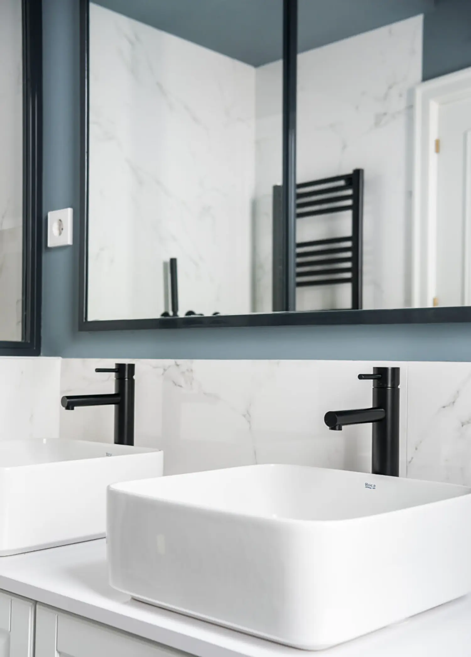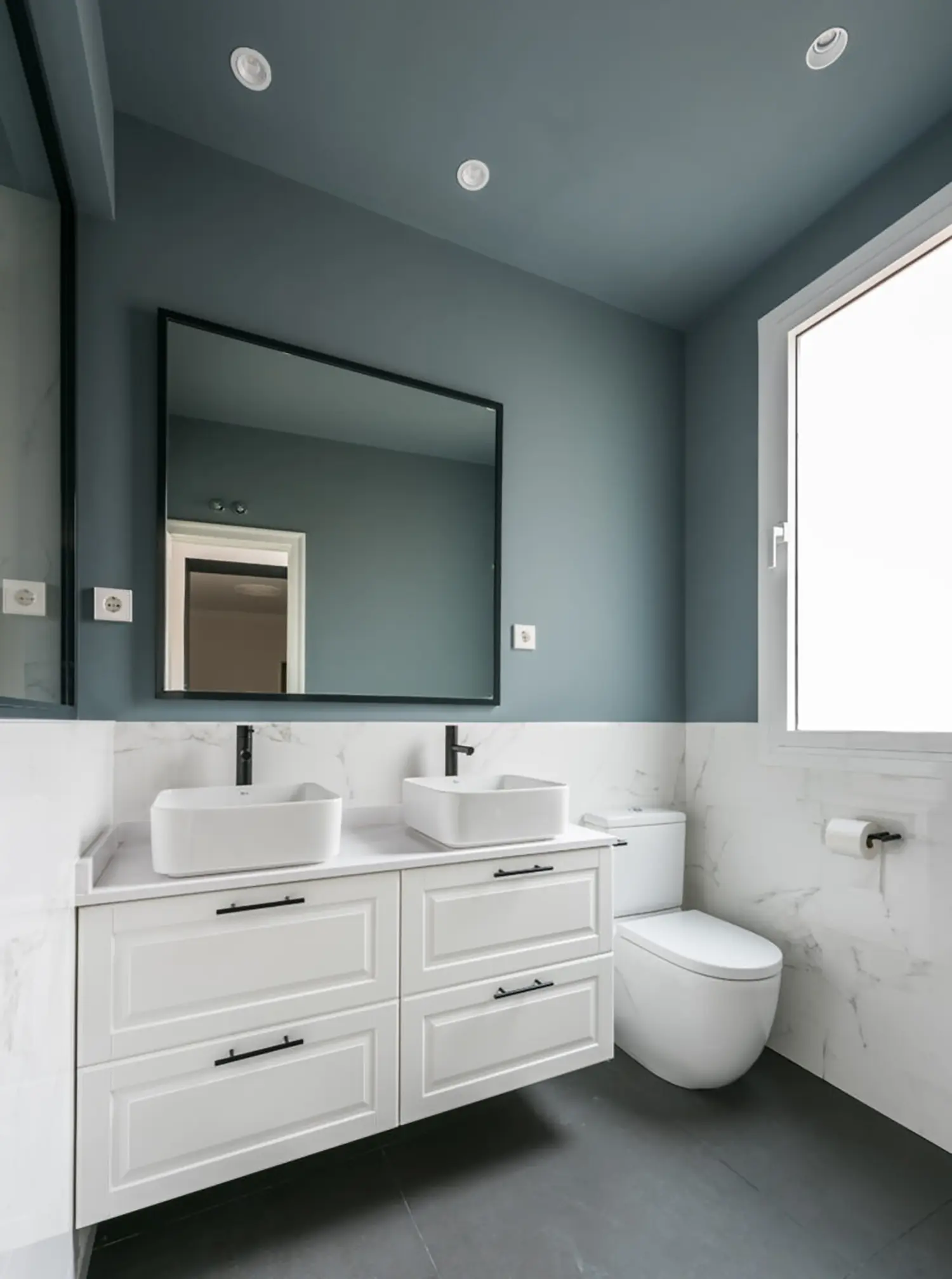 Desde esta zona, y a través de otra puerta acristalada, comienza el largo pasillo que lleva a la zona de noche. Sin embargo, se convierte en un lugar agradable gracias al ritmo conseguido a través de varios elementos: arcos marcando la estructura que dividen en tres tramos el recorrido, diseño de baquetones en una de las paredes, apliques alternados en ambos lados del pasillo… Además, obtiene luz natural desde una ventana al patio del edificio y desde la puerta acristalada que lo conecta con los balcones.