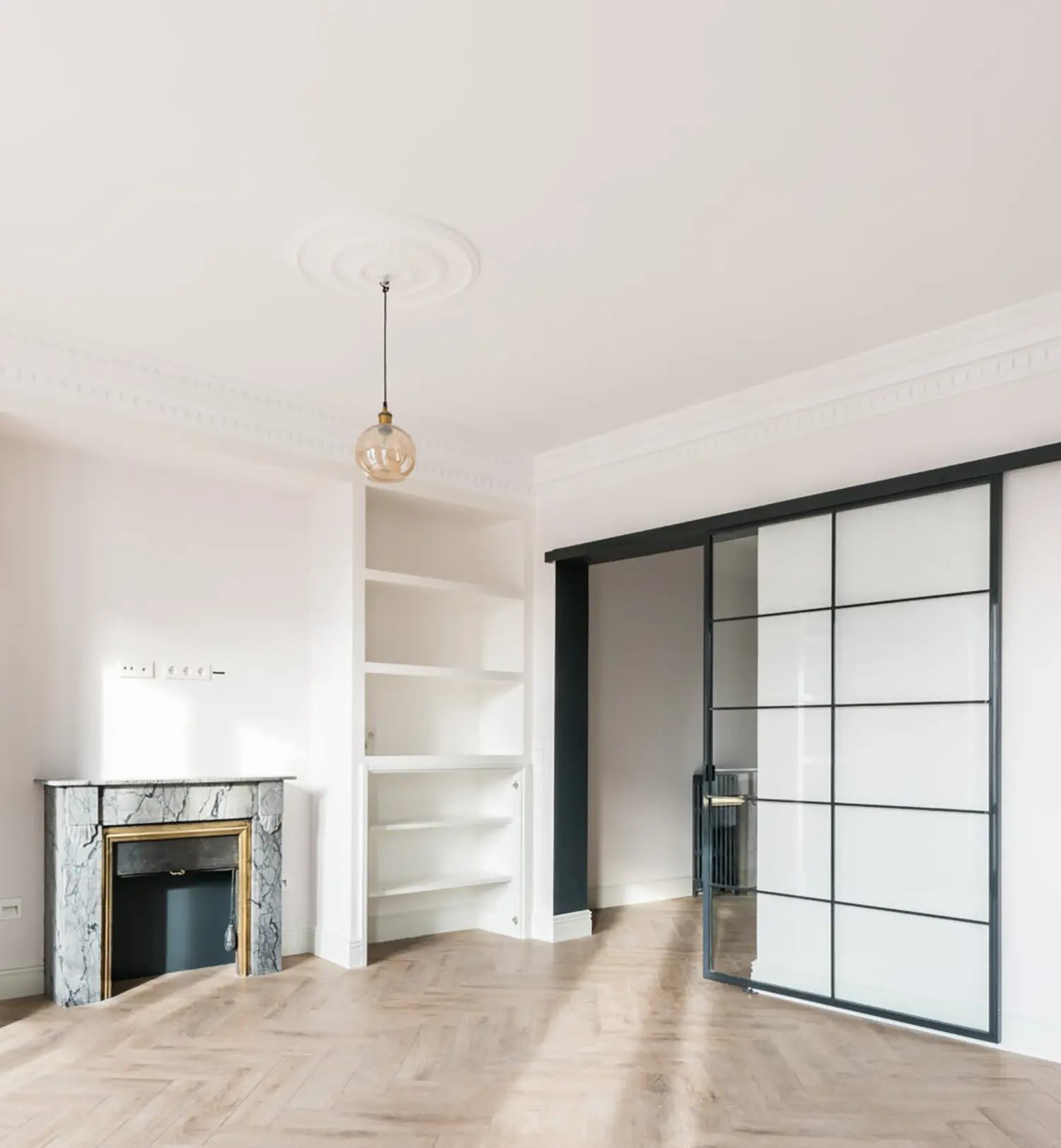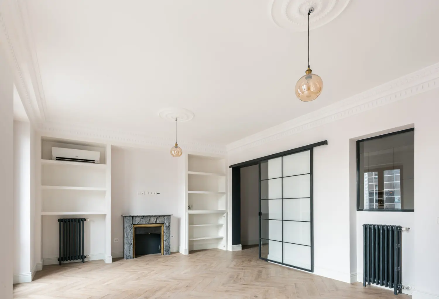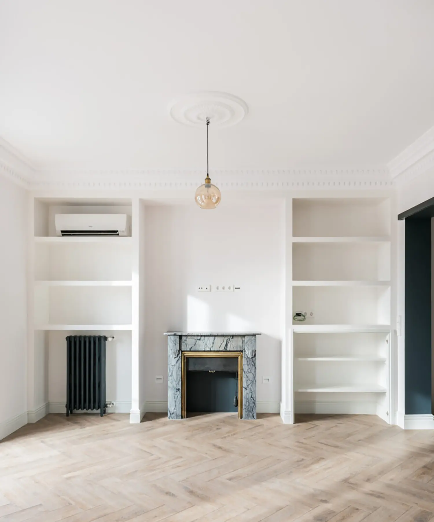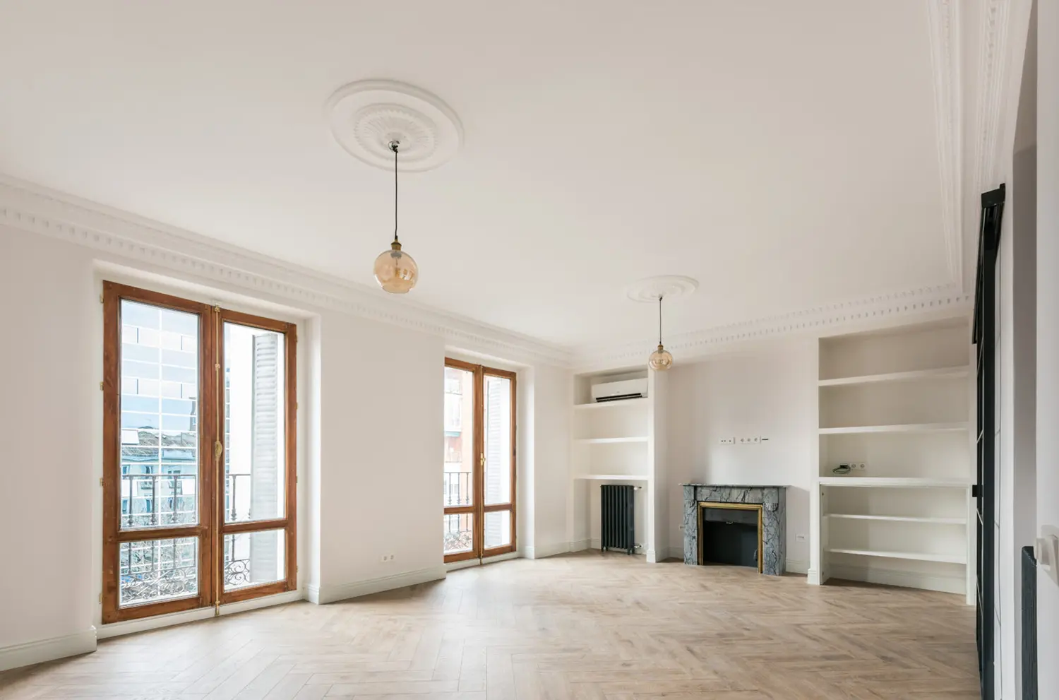 Destaca el estilo clásico conservado en medio del estilo moderno general, en detalles como las molduras y rosetones en los techos, baquetones en las paredes, arcos en el pasillo, chimenea de piedra en el salón…
