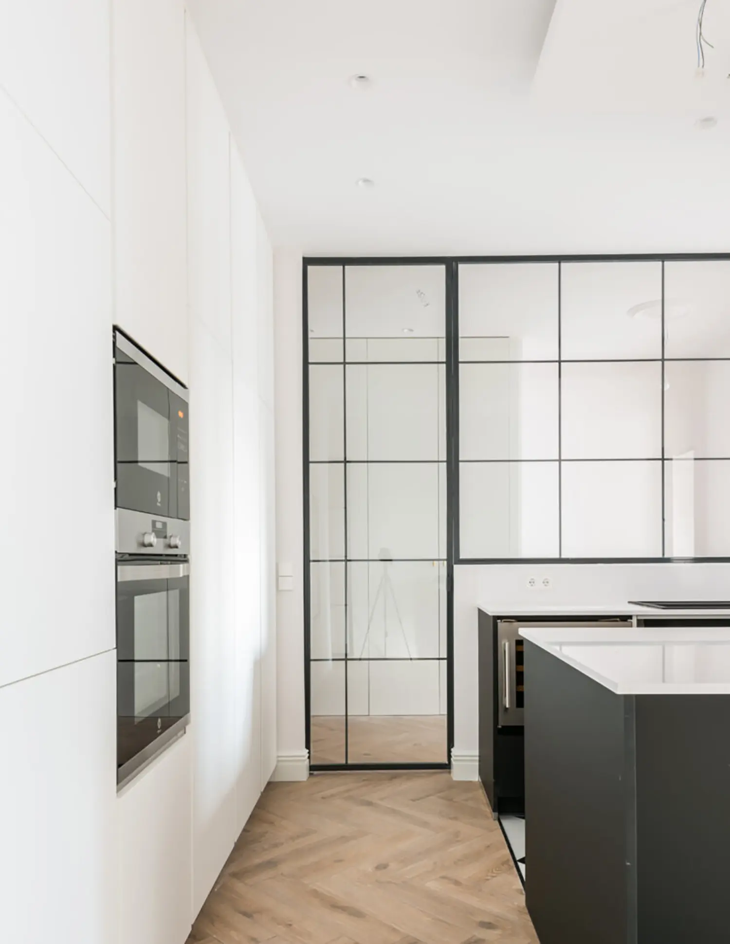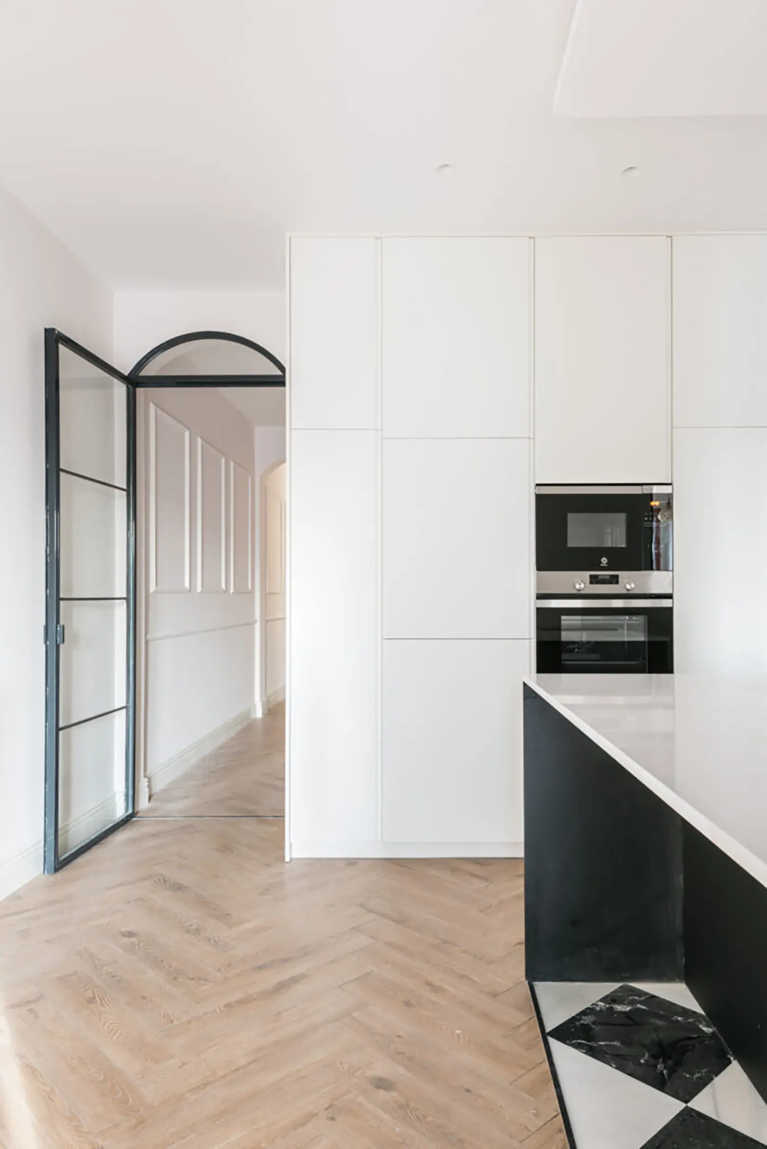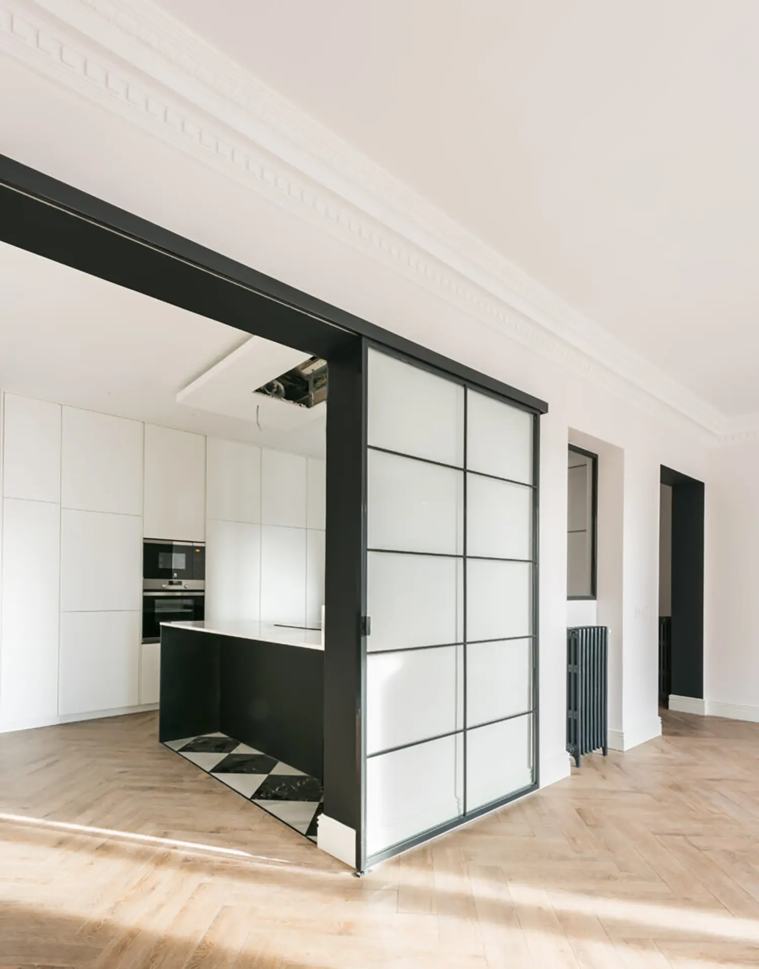 Se buscó aprovechar al máximo la luz natural de los dos balcones que miran a una de las grandes calles de Madrid, concentrando en esta parte toda la zona de día de la vivienda: el salón-comedor se conecta directamente al recibidor y a la cocina, que se puede independizar gracias a una puerta corredera acristalada. También la cocina se separa del recibidor a través de una cristalera. Todas estas conexiones obtienen personalidad gracias a las embocaduras marcadas en color negro al igual que las carpinterías de las cristaleras y otros detalles en la cocina.
