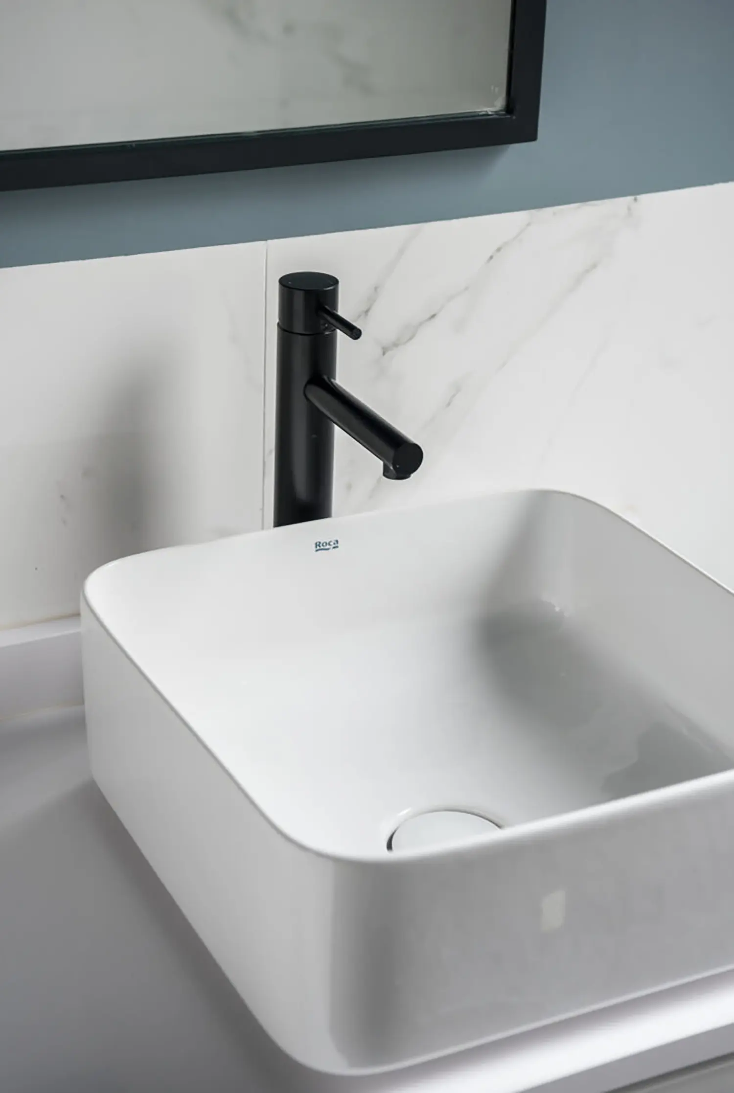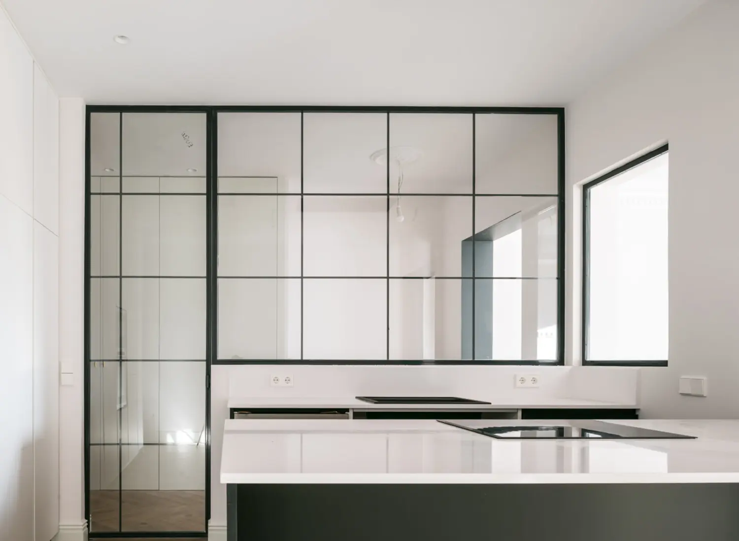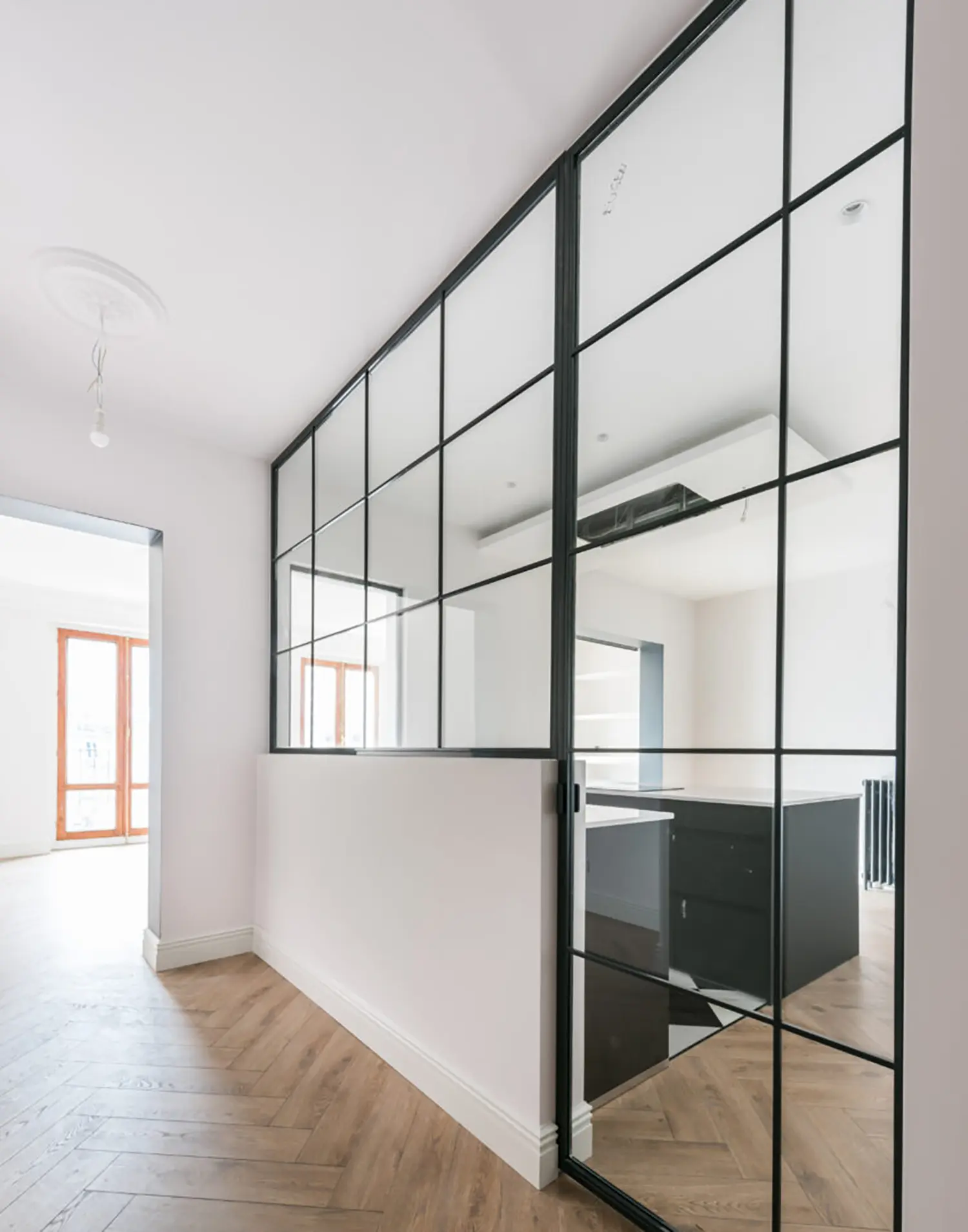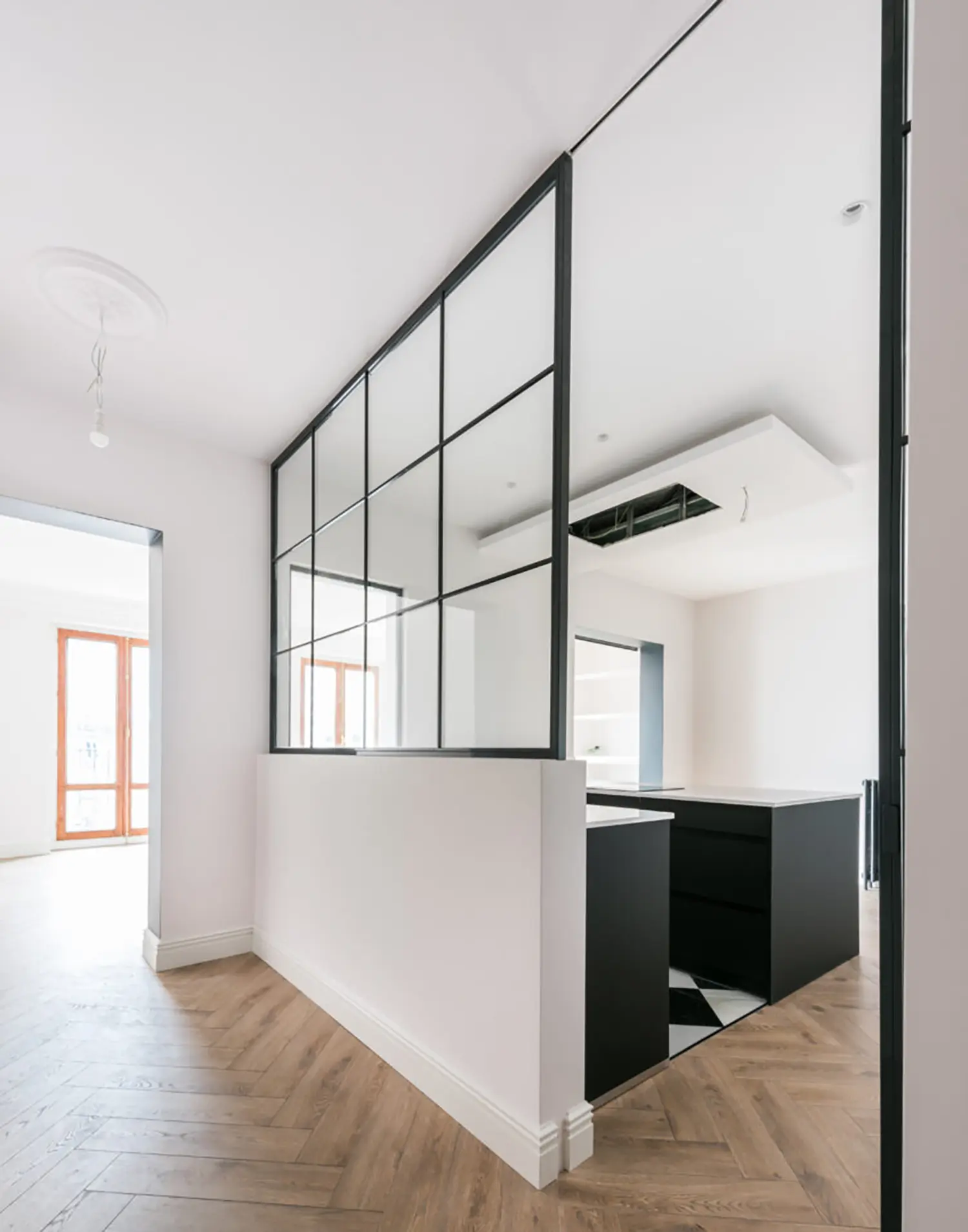 Se buscó aprovechar al máximo la luz natural de los dos balcones que miran a una de las grandes calles de Madrid, concentrando en esta parte toda la zona de día de la vivienda: el salón-comedor se conecta directamente al recibidor y a la cocina, que se puede independizar gracias a una puerta corredera acristalada. También la cocina se separa del recibidor a través de una cristalera. Todas estas conexiones obtienen personalidad gracias a las embocaduras marcadas en color negro al igual que las carpinterías de las cristaleras y otros detalles en la cocina.
